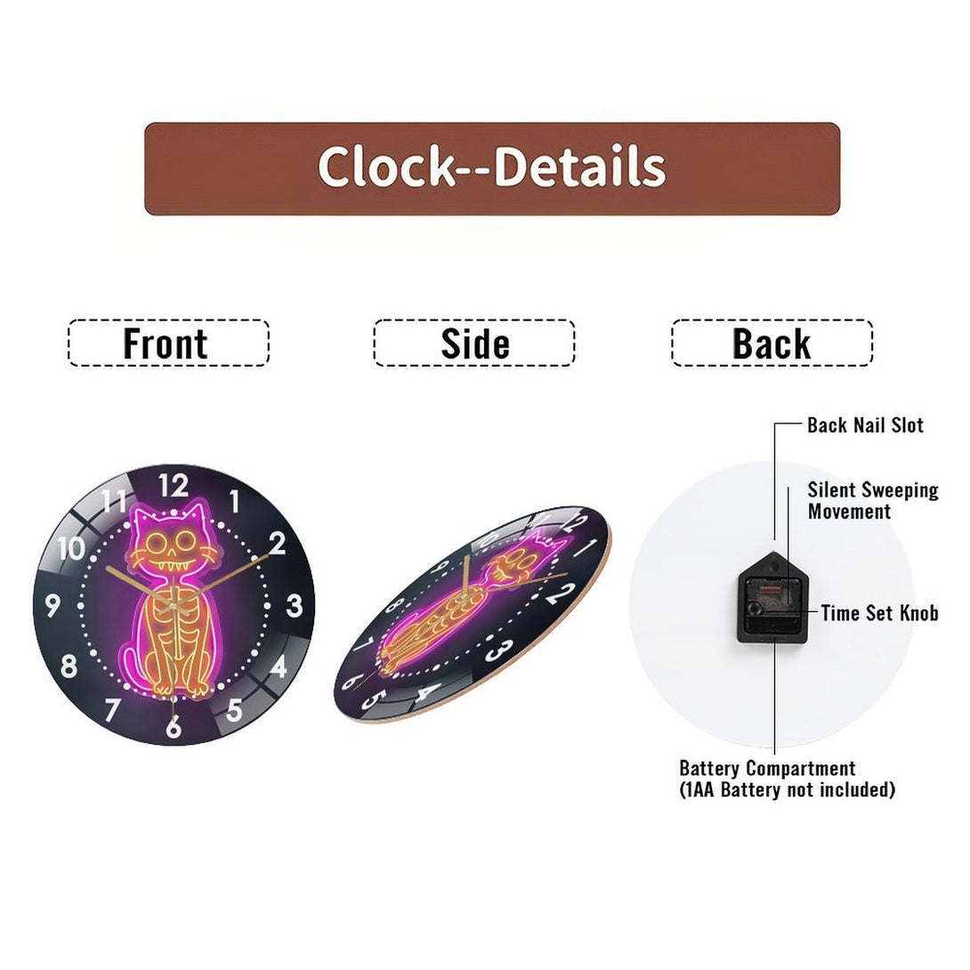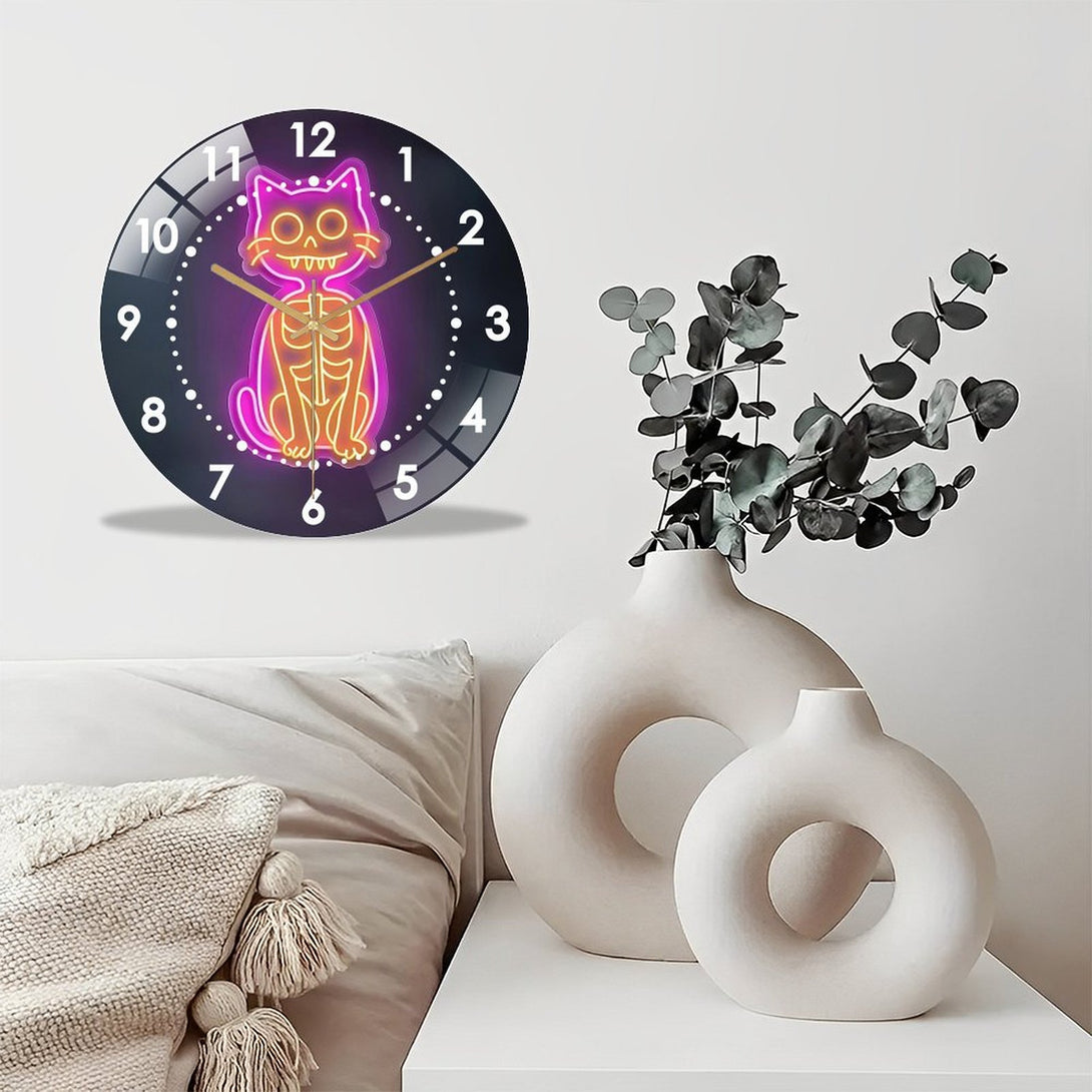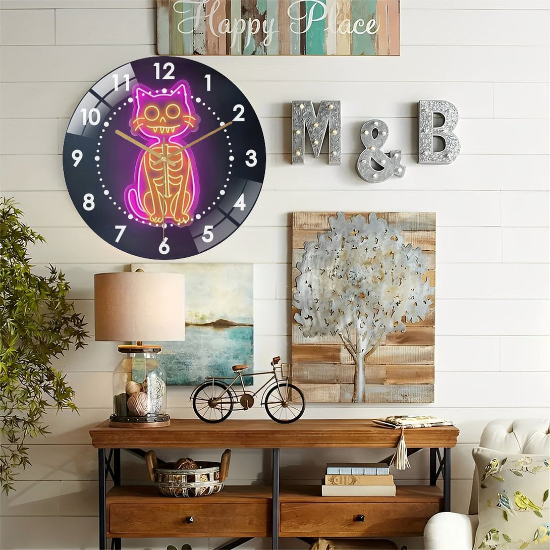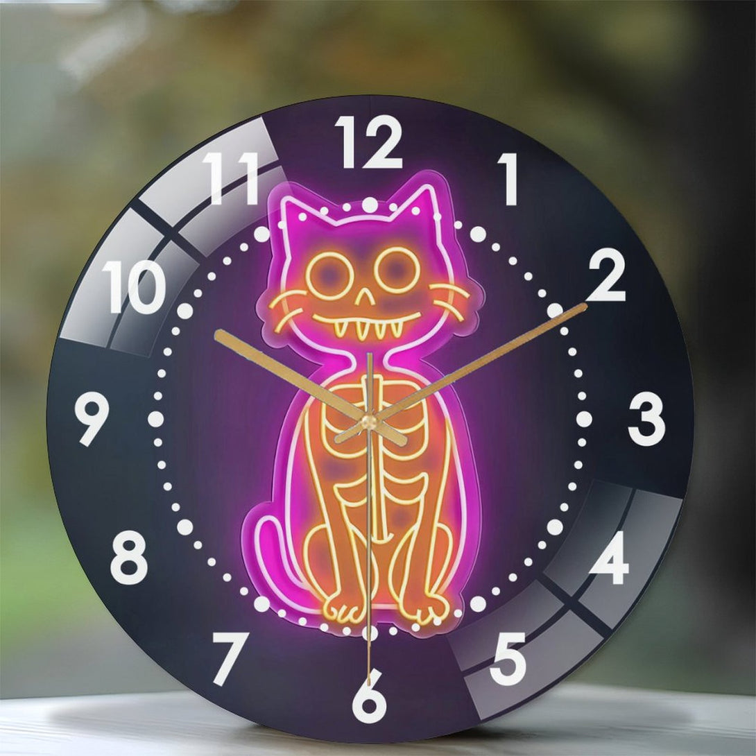 Spooky Skeleton Cat Glass Wall Clock– Fun Kitten Hallo-ween Wall Clock for Home Decor Wedding Gift Decor. Man Cave Hanging Door Housewarming Hall-oween Gift,12×12inch(30×30cm)