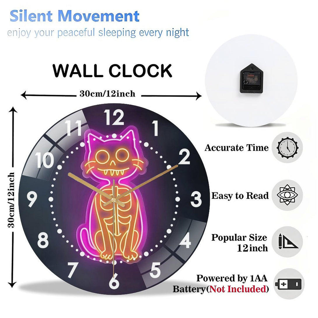 Decor Wall Clock: Spooky Skeleton Cat Glass Wall Clock– Fun Kitten Hallo-ween Wall Clock for Home Decor Wedding Gift Decor. Man Cave Hanging Door Housewarming Hall-oween Gift Style 12×12inch(30×30cm)