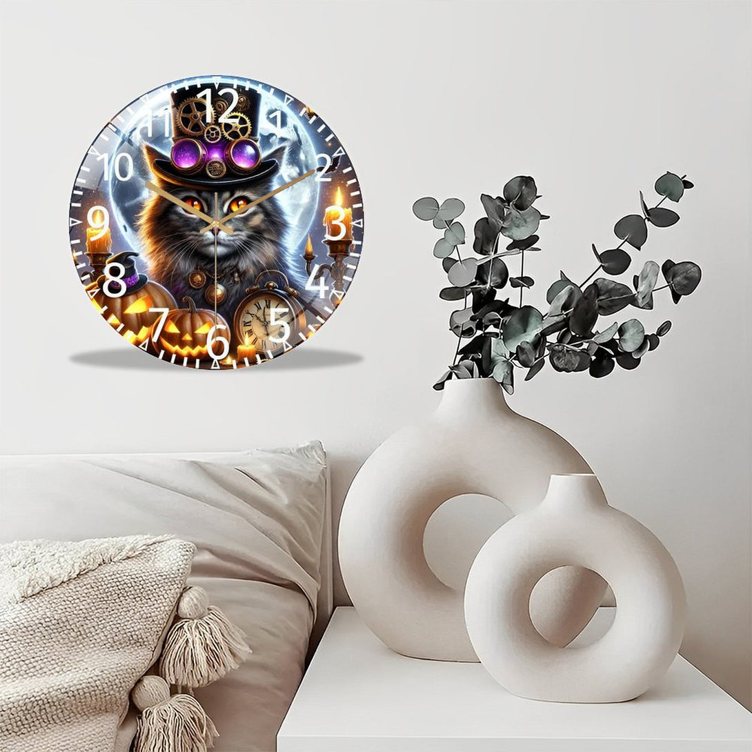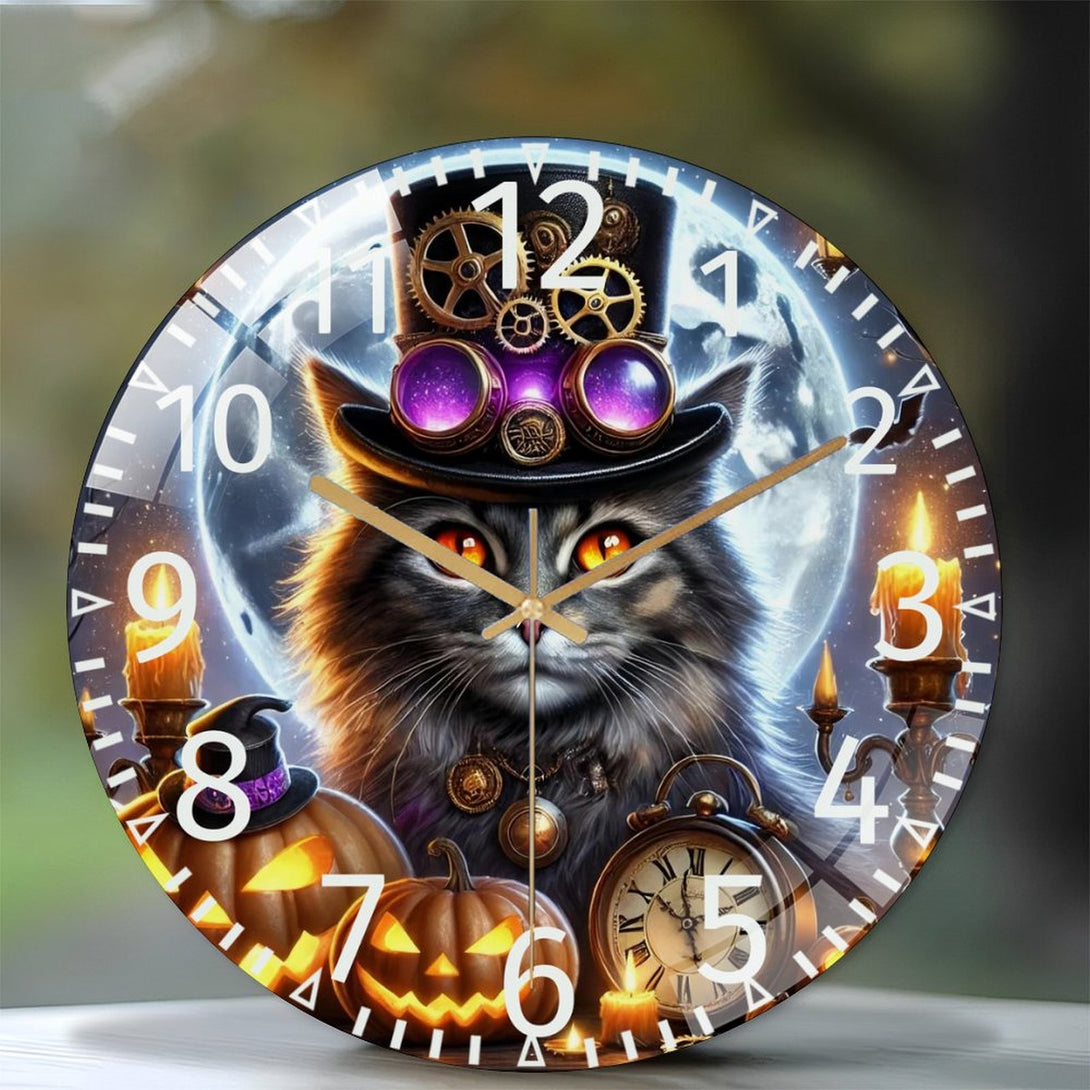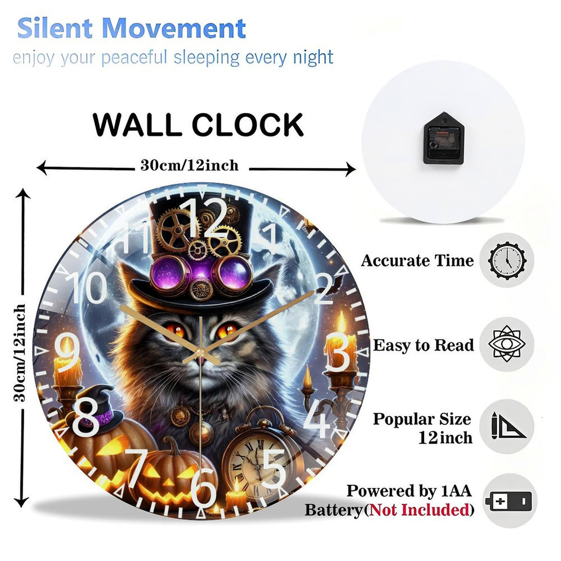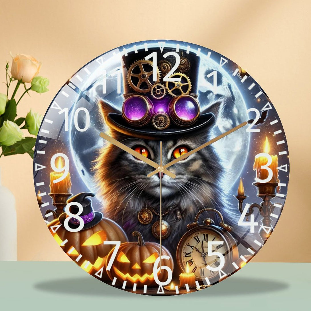 Steampunk Halloween- Cat Glass Wall Clock, Full Moon Witchy Cat Decor Wall Clock for Homes, Bars, Offices, Man Caves, Garages, And Living Rooms .Also Makes A Great Gift.,12×12inch(30×30cm)