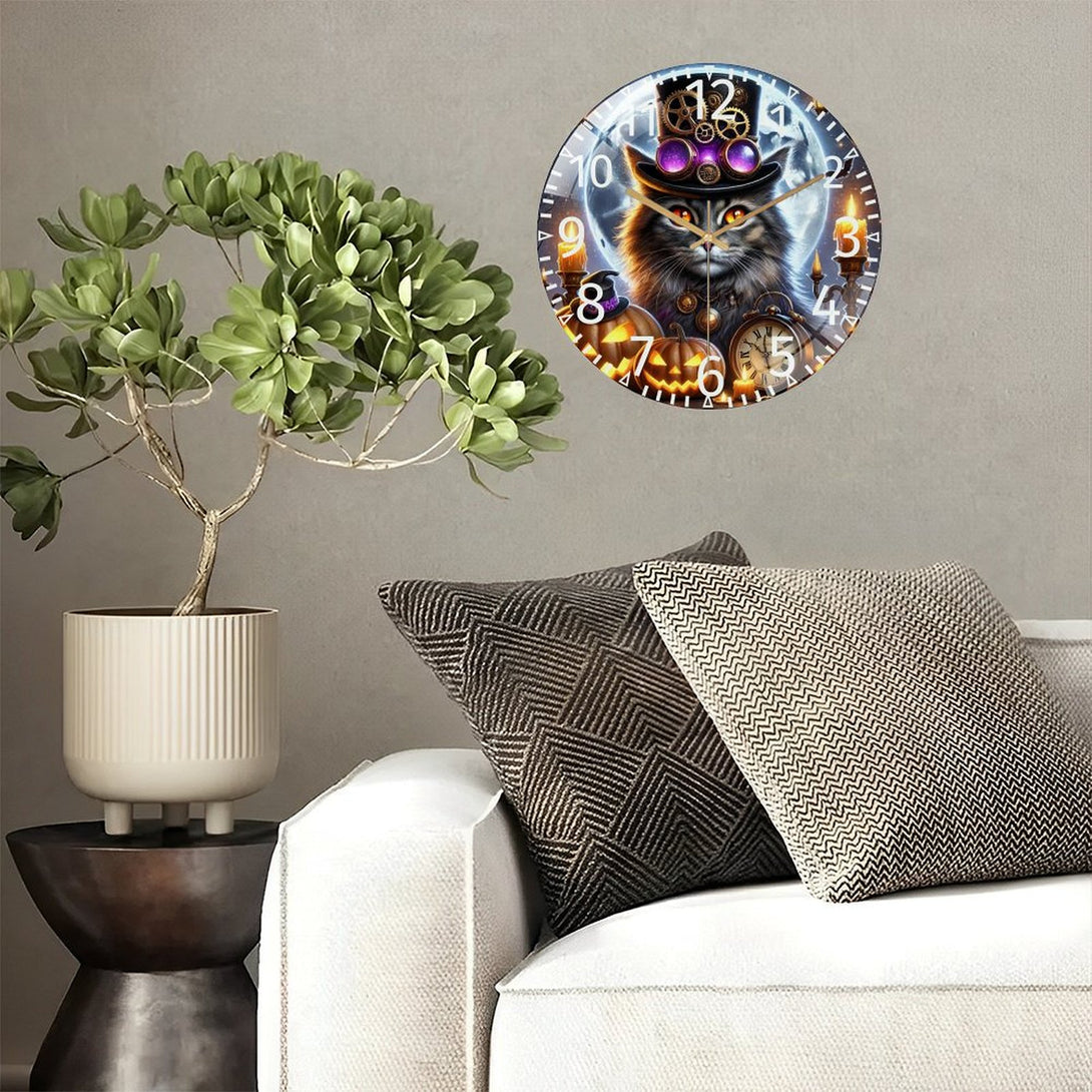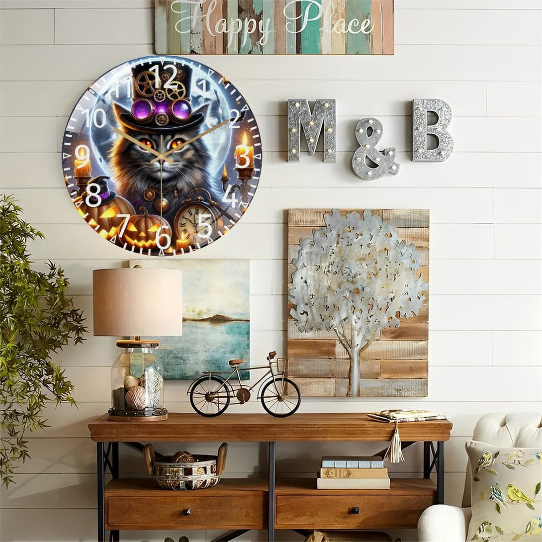 Decor Wall Clock: Steampunk Halloween- Cat Glass Wall Clock, Full Moon Witchy Cat Decor Wall Clock for Homes, Bars, Offices, Man Caves, Garages, And Living Rooms .Also Makes A Great Gift.