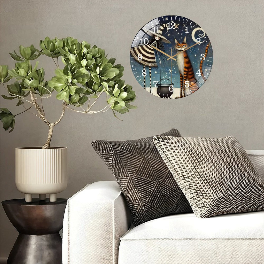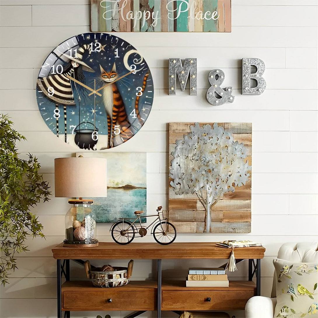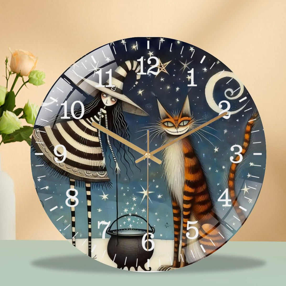 Decor Wall Clock: Witch And Cat Glass Wall Clock, Spooky Wall Decor Halloween- Decor Wall Clock for Homes, Bars, Offices, Man Caves, Garages, And Living Rooms .Also Makes A Great Gift.