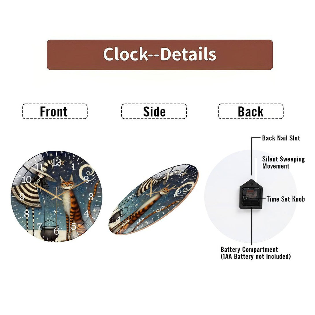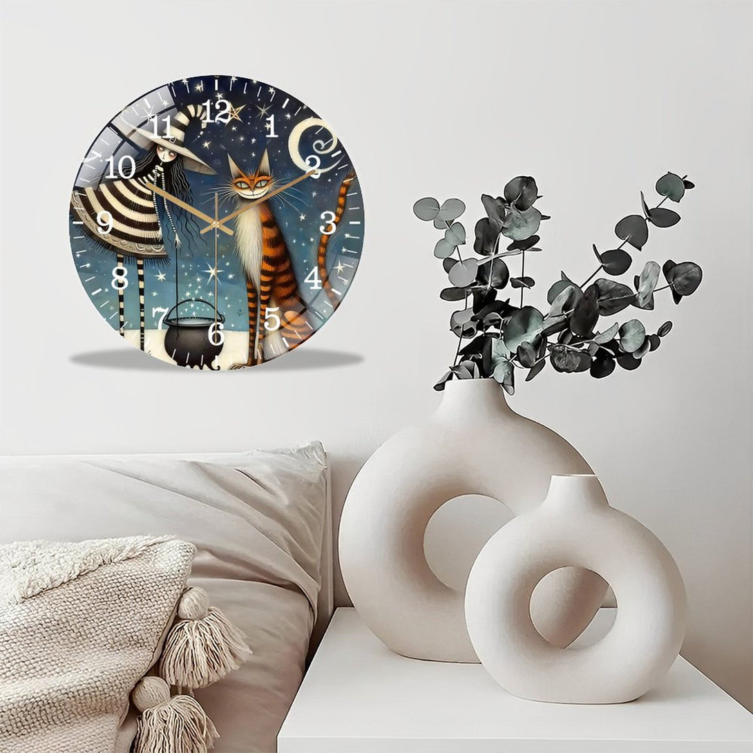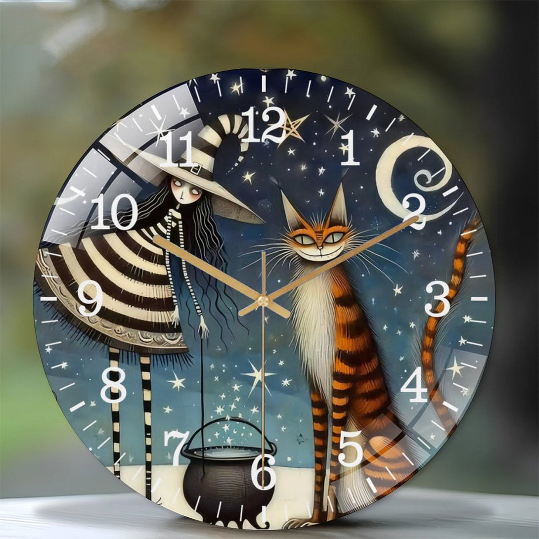 Decor Wall Clock: Witch And Cat Glass Wall Clock, Spooky Wall Decor Halloween- Decor Wall Clock for Homes, Bars, Offices, Man Caves, Garages, And Living Rooms .Also Makes A Great Gift.
