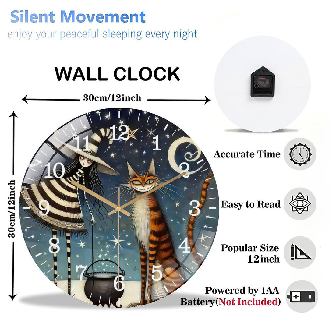 Witch And Cat Glass Wall Clock, Spooky Wall Decor Halloween- Decor Wall Clock for Homes, Bars, Offices, Man Caves, Garages, And Living Rooms .Also Makes A Great Gift.,12×12inch(30×30cm)