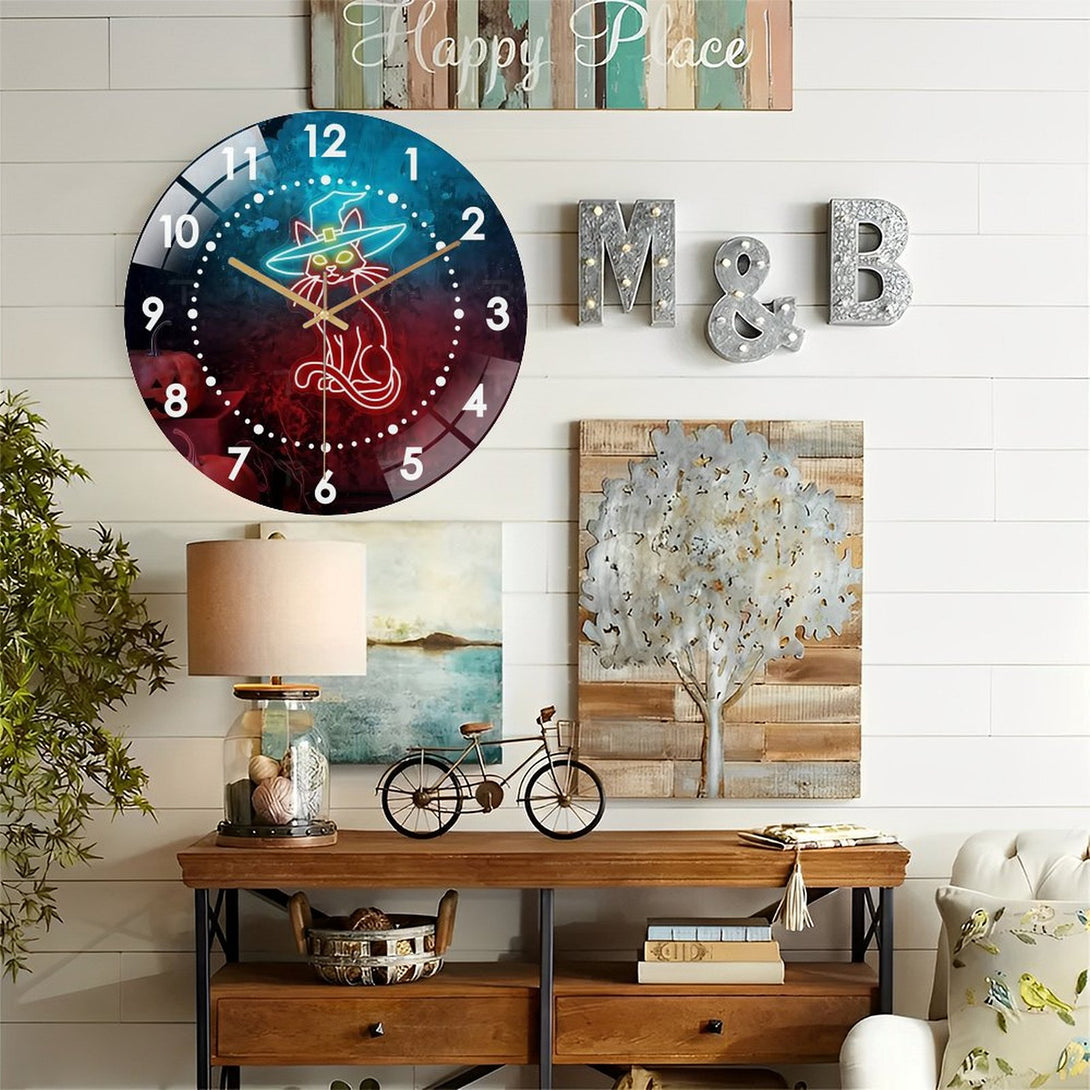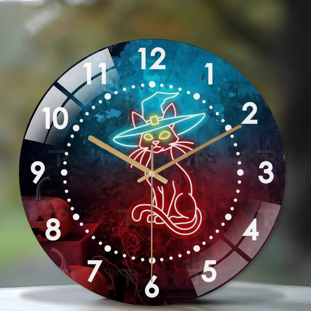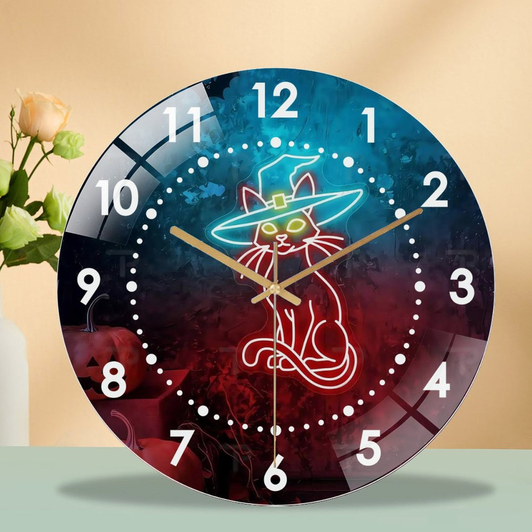 Decor Wall Clock: Witch Cat Hallo-ween Glass Wall Clock ,Spooky Black Cat Decor Wall Clock for Homes, Bars, Offices, Man Caves, Garages, And Living Rooms. Kids Room Decor, Haunted House Party Room