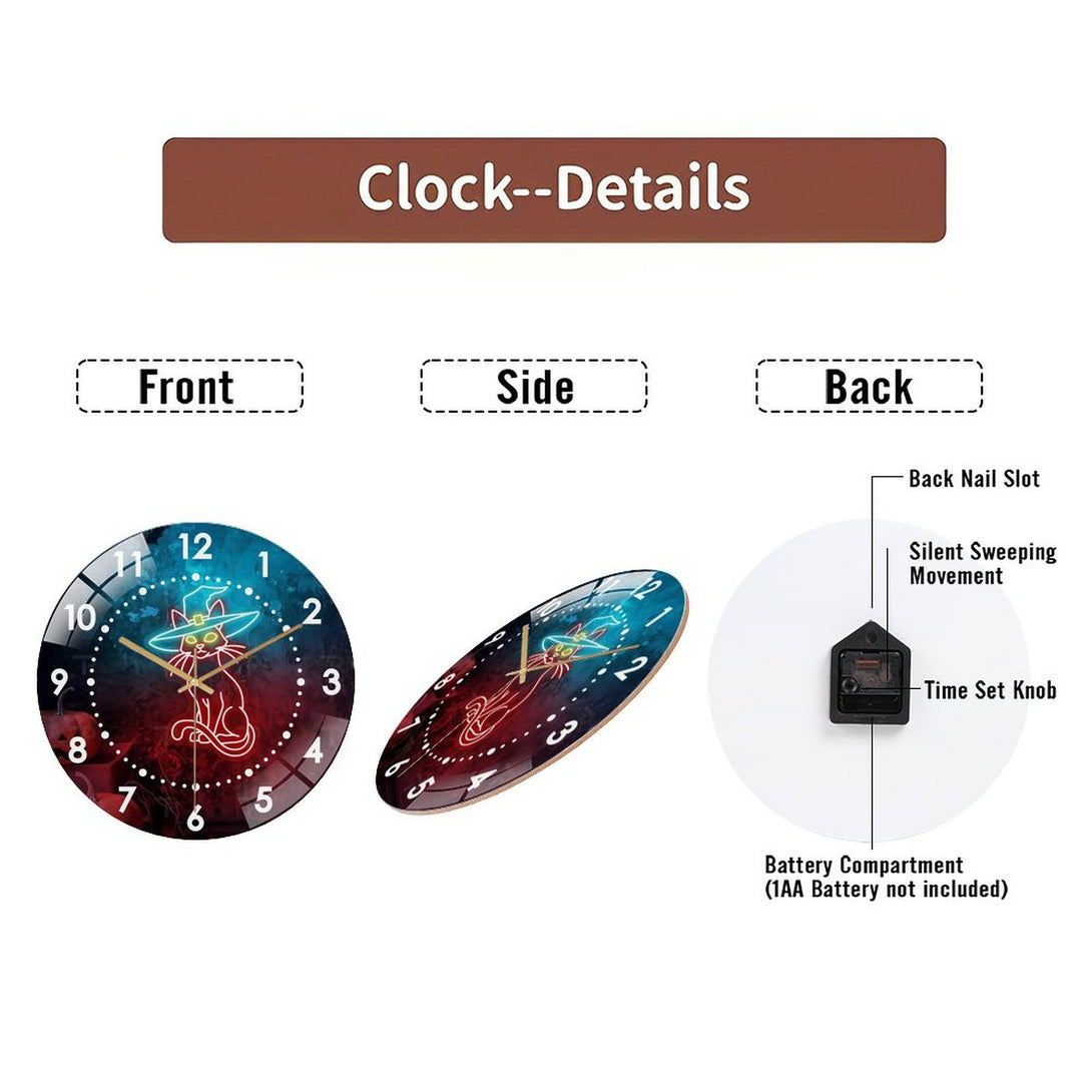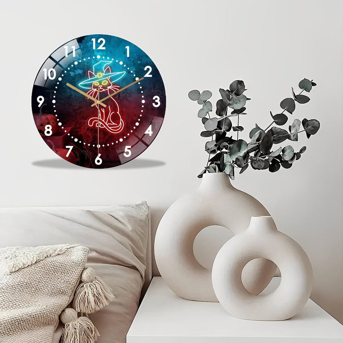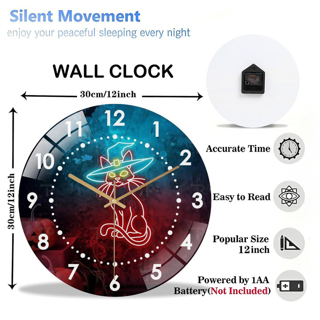 Decor Wall Clock: Witch Cat Hallo-ween Glass Wall Clock ,Spooky Black Cat Decor Wall Clock for Homes, Bars, Offices, Man Caves, Garages, And Living Rooms. Kids Room Decor, Haunted House Party Room