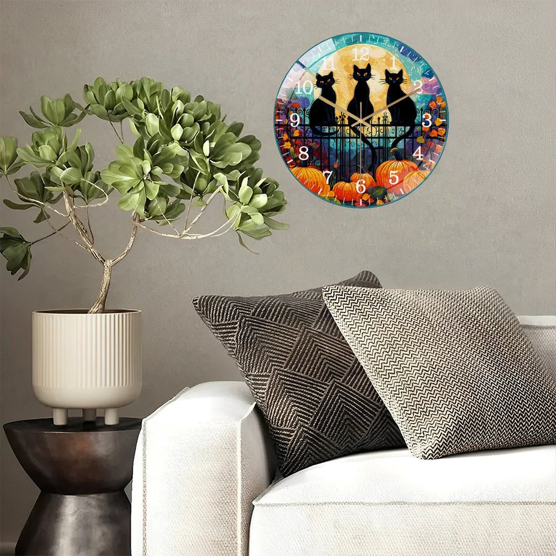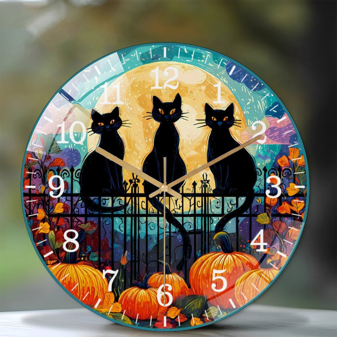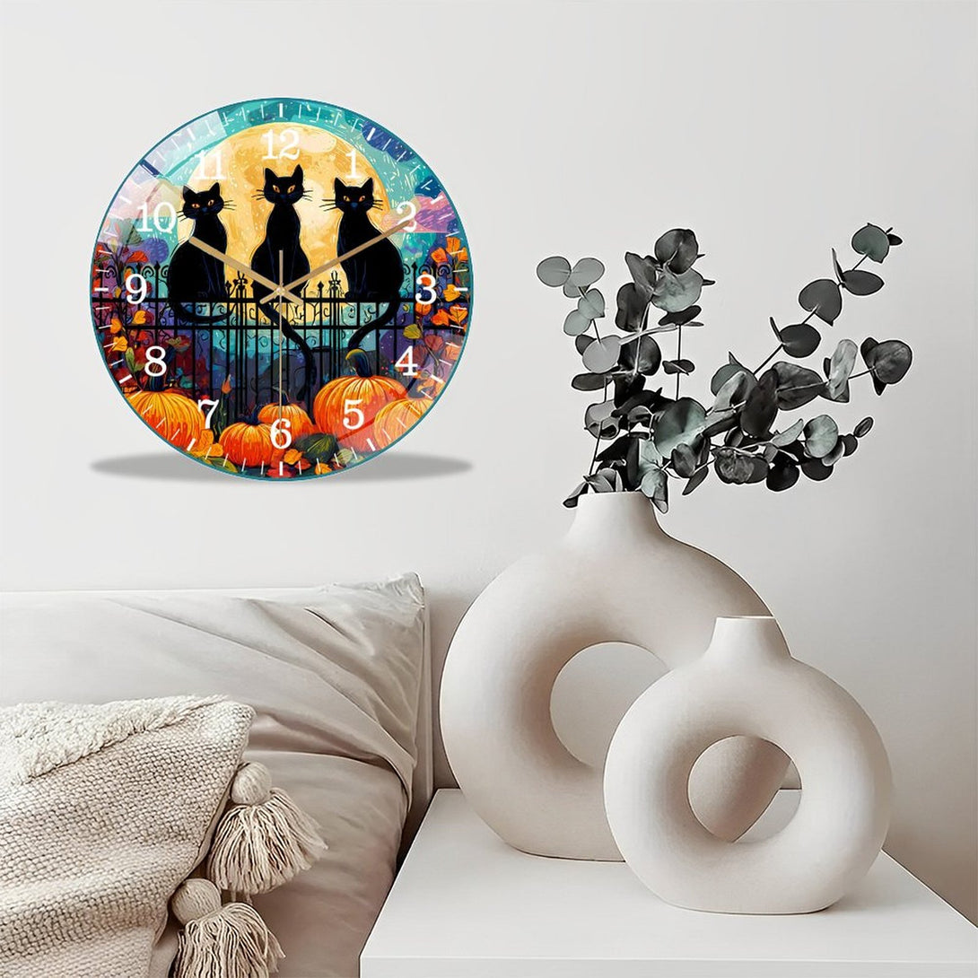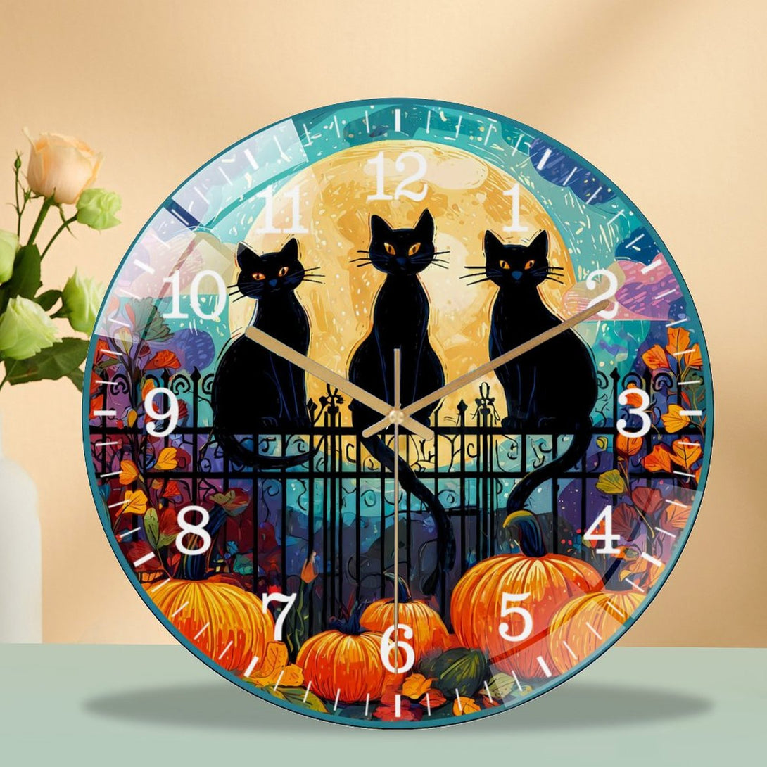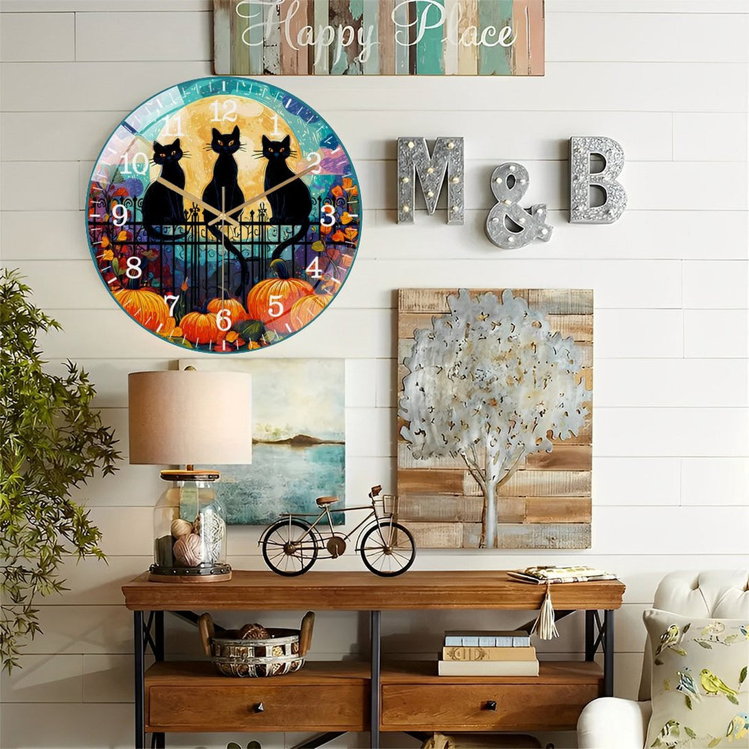 Decor Wall Clocks: 3 Black Cats on A Fence Wreath Glass Wall Clock,Pumpkin Cat Wall Clock for Homes, Bars, Offices, Man Caves, Garages, And Living Rooms. Also Makes A Great Gift.