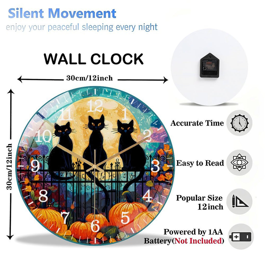 3 Black Cats on A Fence Wreath Glass Wall Clock,Pumpkin Cat Wall Clock for Homes, Bars, Offices, Man Caves, Garages, And Living Rooms. Also Makes A Great Gift.,12×12inch(30×30cm)