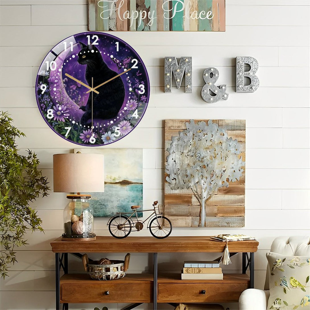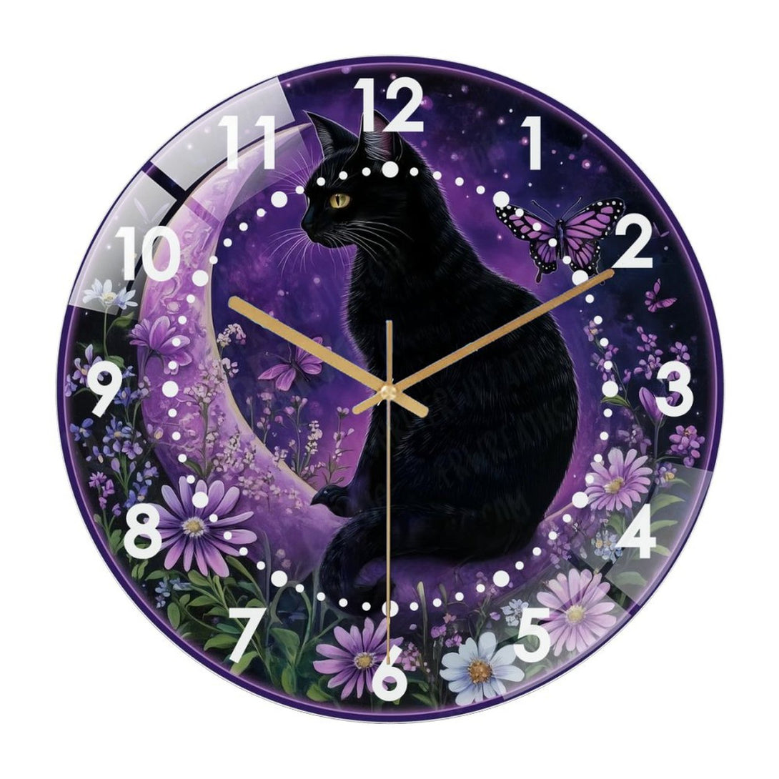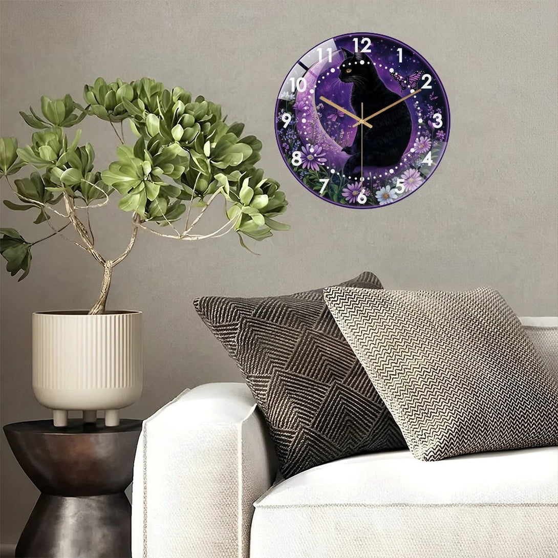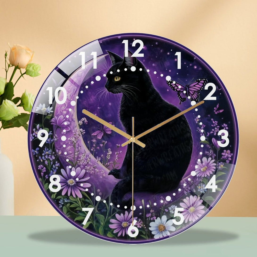 Decor Wall Clocks: Adorable Black Cat Sitting in A Crescent Moon Glass Wall Clock for Homes, Bars, Offices, Man Caves, Garages, And Living Rooms. Also Makes A Great Gift. Style 12×12inch(30×30cm)