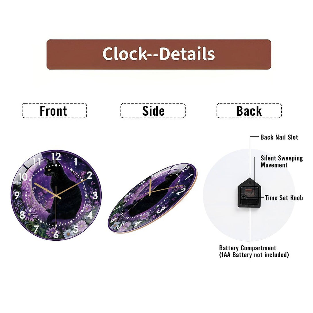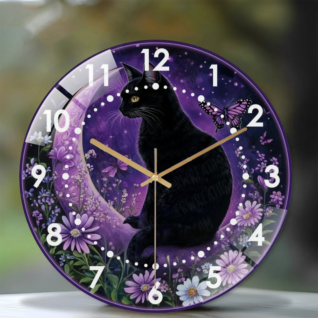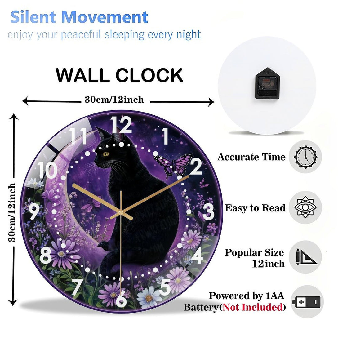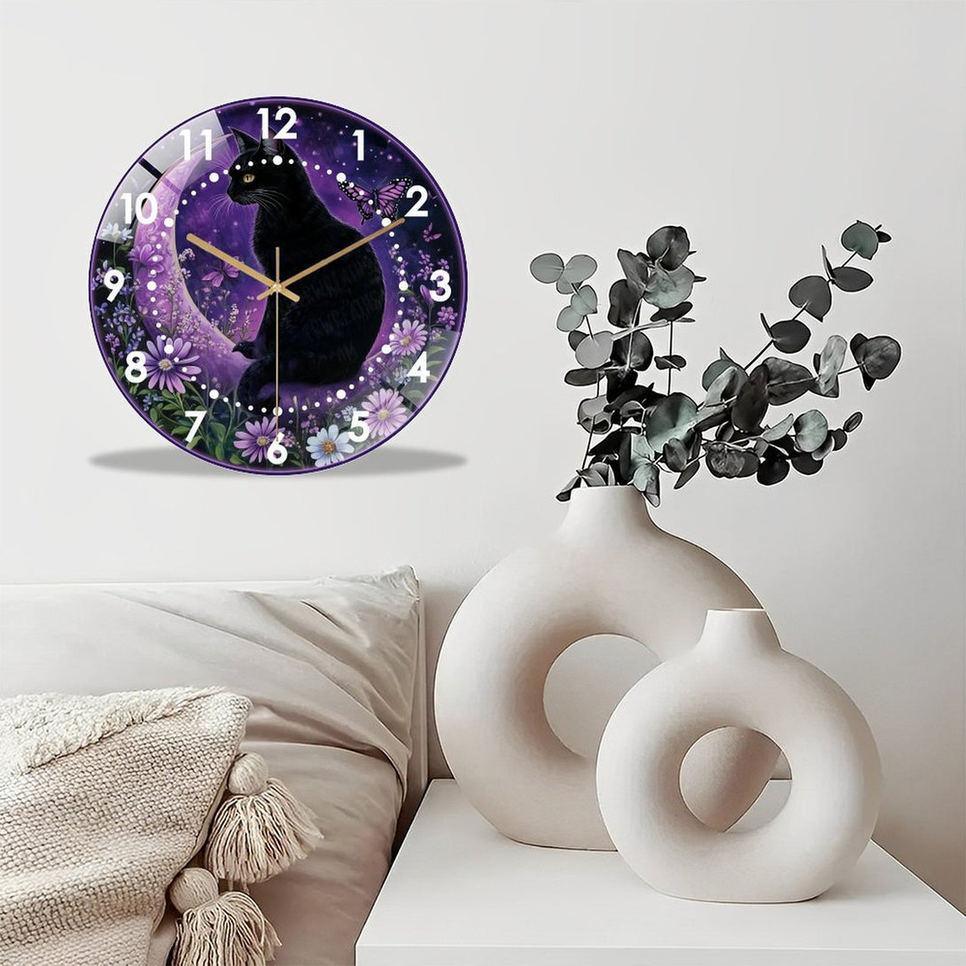 Decor Wall Clocks: Adorable Black Cat Sitting in A Crescent Moon Glass Wall Clock for Homes, Bars, Offices, Man Caves, Garages, And Living Rooms. Also Makes A Great Gift. Style 12×12inch(30×30cm)