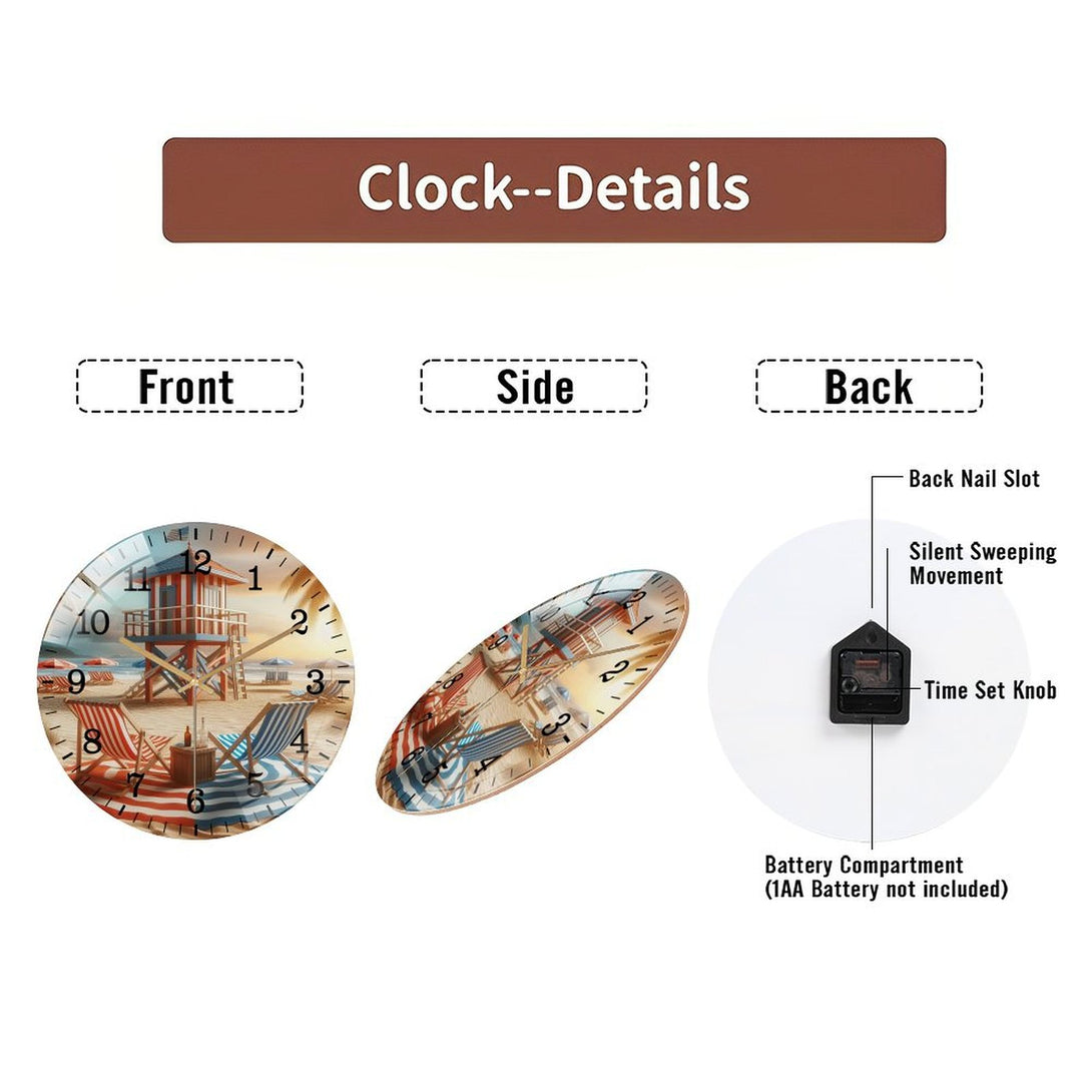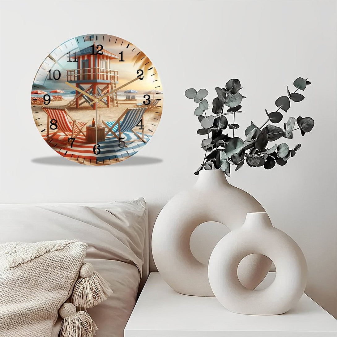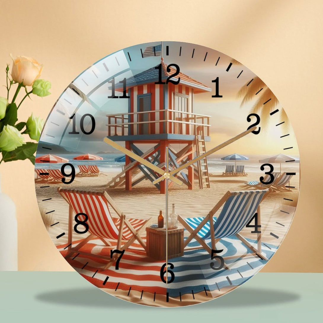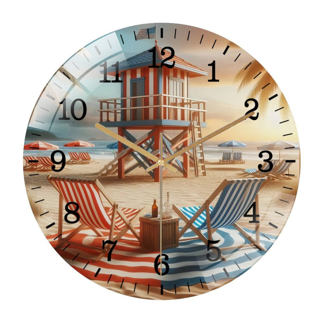 Decor Wall Clocks: Beach Chairs with Life Guard Stand Glass Wall Clock ,Home Decor Gift Ocean Lover Wall Clock.Gift for Her for Homes, Bars, Offices, Man Caves, Garages, And Living Rooms.