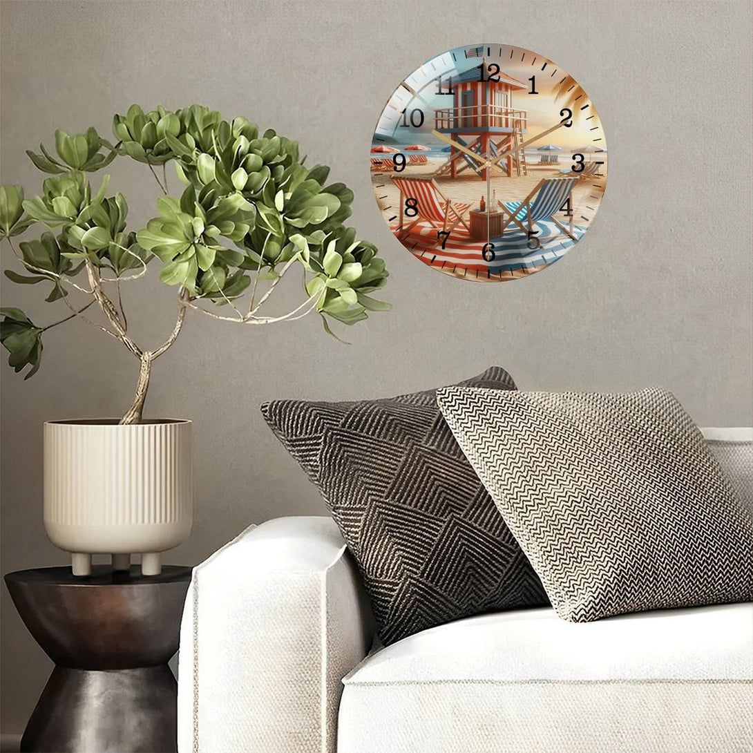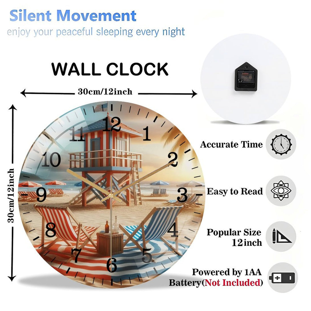 Beach Chairs with Life Guard Stand Glass Wall Clock ,Home Decor Gift Ocean Lover Wall Clock.Gift for Her for Homes, Bars, Offices, Man Caves, Garages, And Living Rooms. for Your Home,12×12inch(30×30cm)