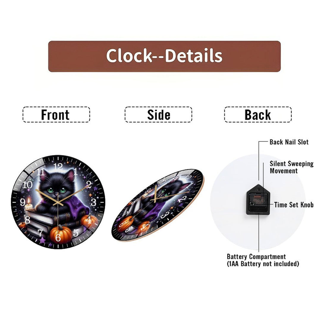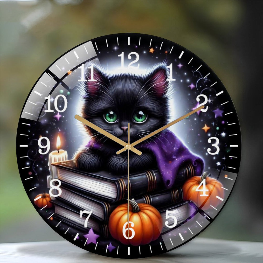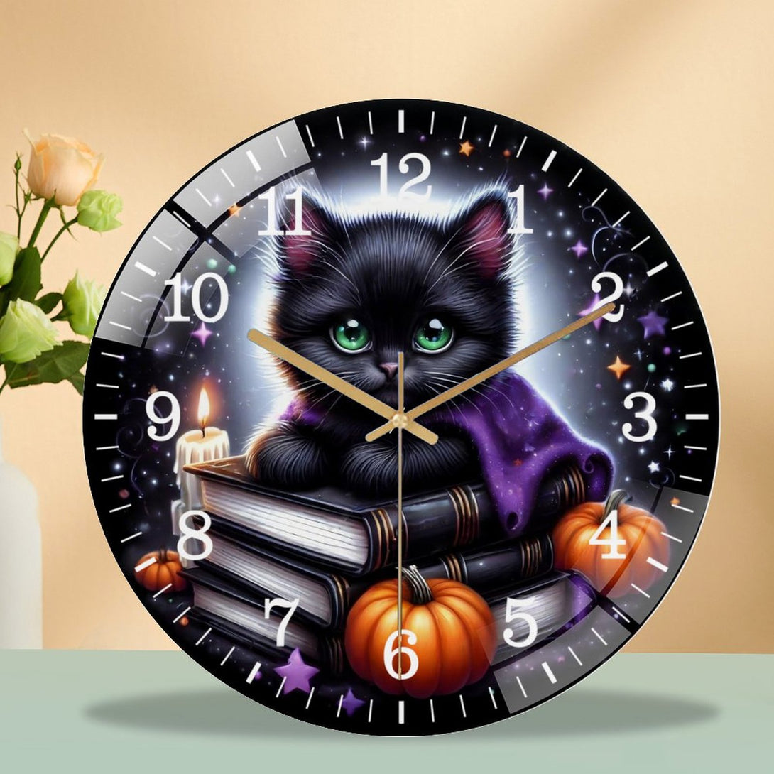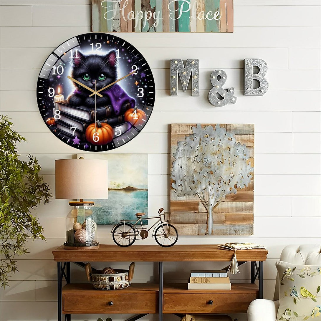 Decor Wall Clocks: Black Cat And Pumpkin Round Glass Wall Clock, Black And Purple Halloween Cat Wall Clock for Homes, Bars, Offices, Man Caves, Garages, And Living Rooms. Also Makes A Great Gift.