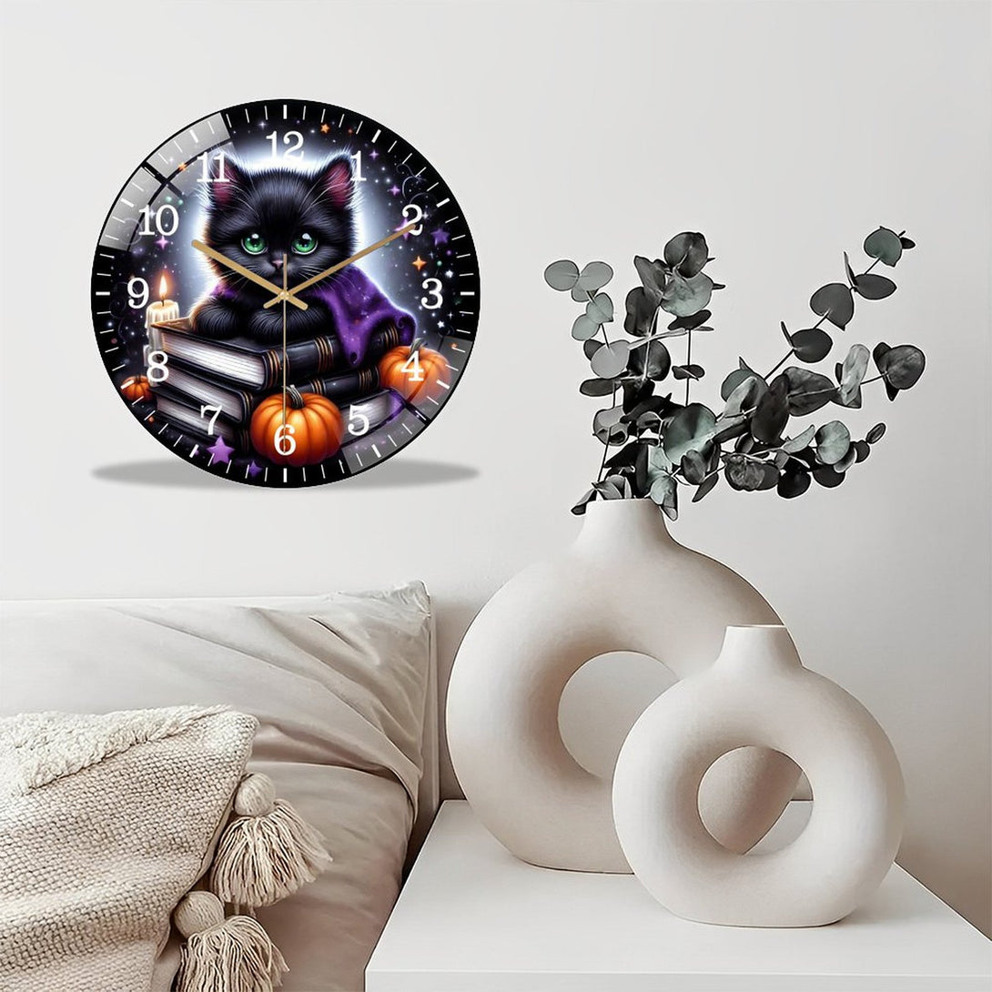 Black Cat And Pumpkin Round Glass Wall Clock, Black And Purple Halloween Cat Wall Clock for Homes, Bars, Offices, Man Caves, Garages, And Living Rooms. Also Makes A Great Gift.,12×12inch(30×30cm)
