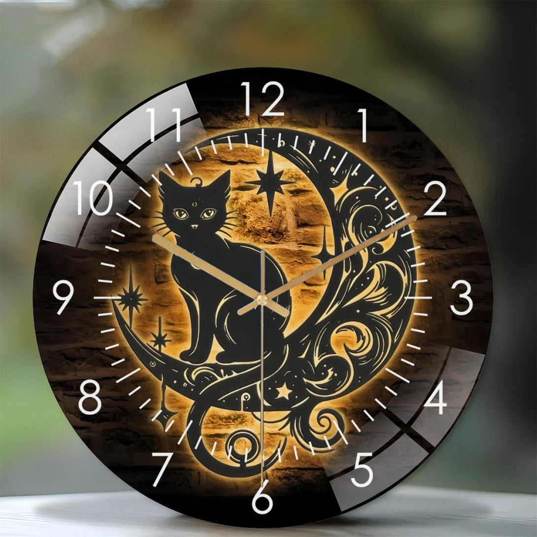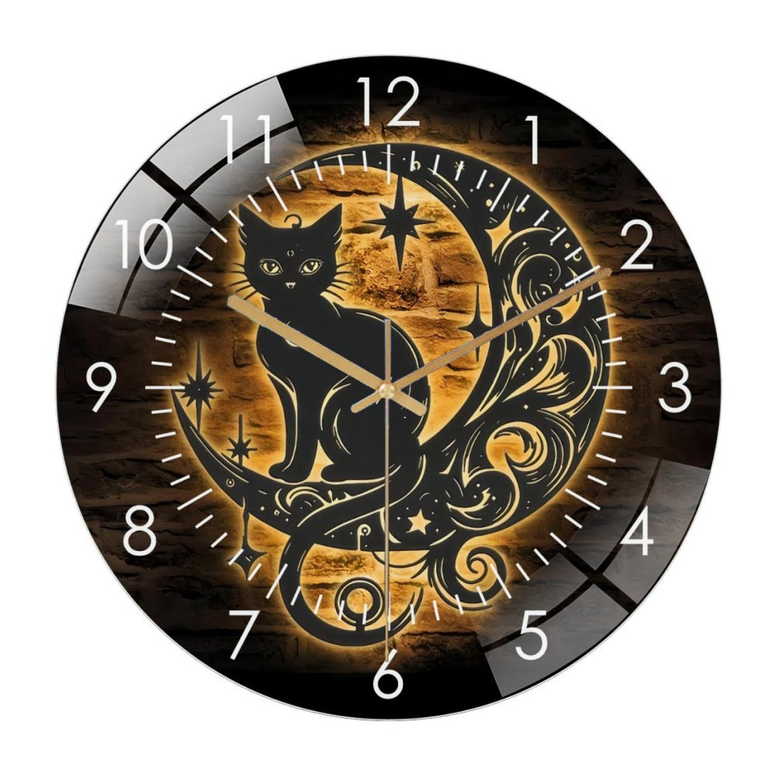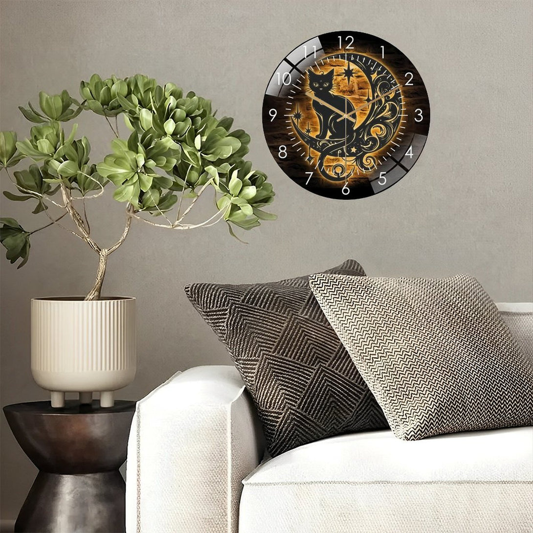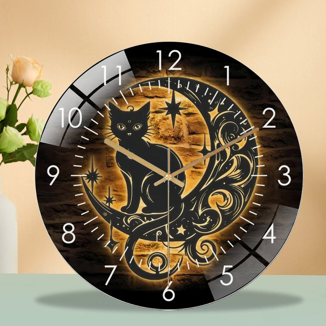 Black Cat On The Moon Glass Wall Clock,Moon Cat Glass Wall Clock, Home Decor Crescent Moon Decoration Mystical Hanging Door Housewarming,12×12inch(30×30cm)
