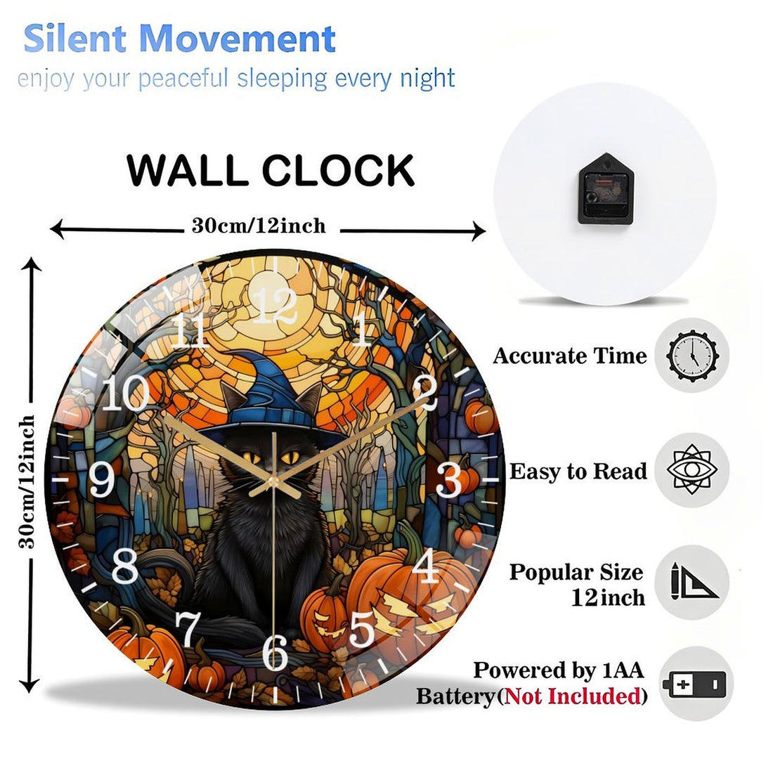 Black Cat with Jack-O-Lanterns Halloween Glass Wall Clock,cat Lover Halloween Gift Decor Wall Clock for Homes, Bars, Offices, Man Caves, Garages, And Living Rooms. Also Makes A Great,12×12inch(30×30cm)