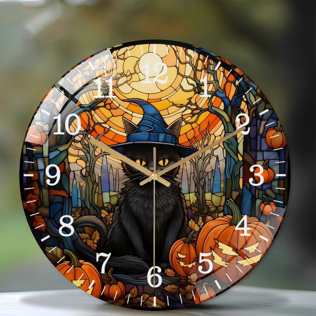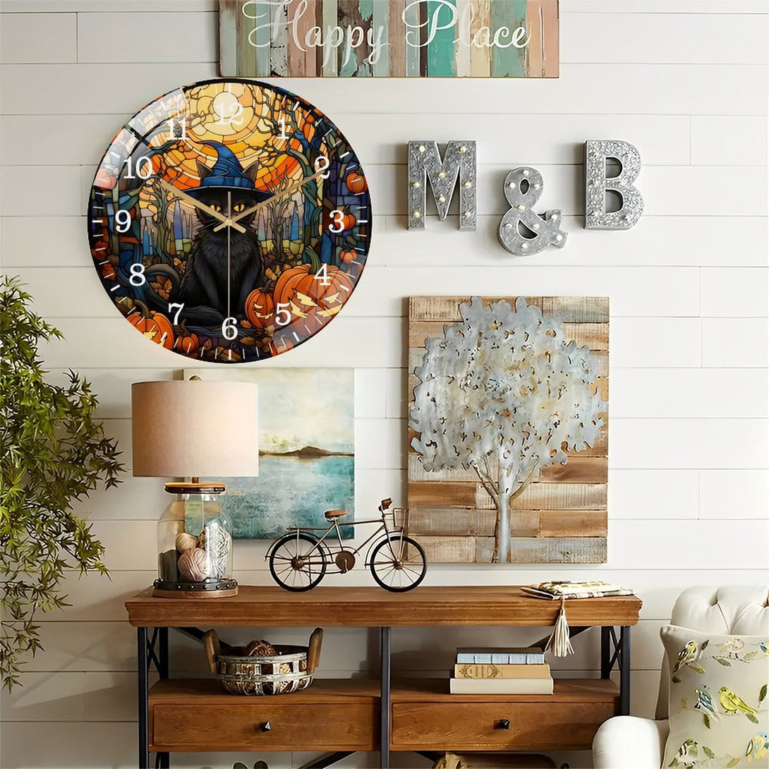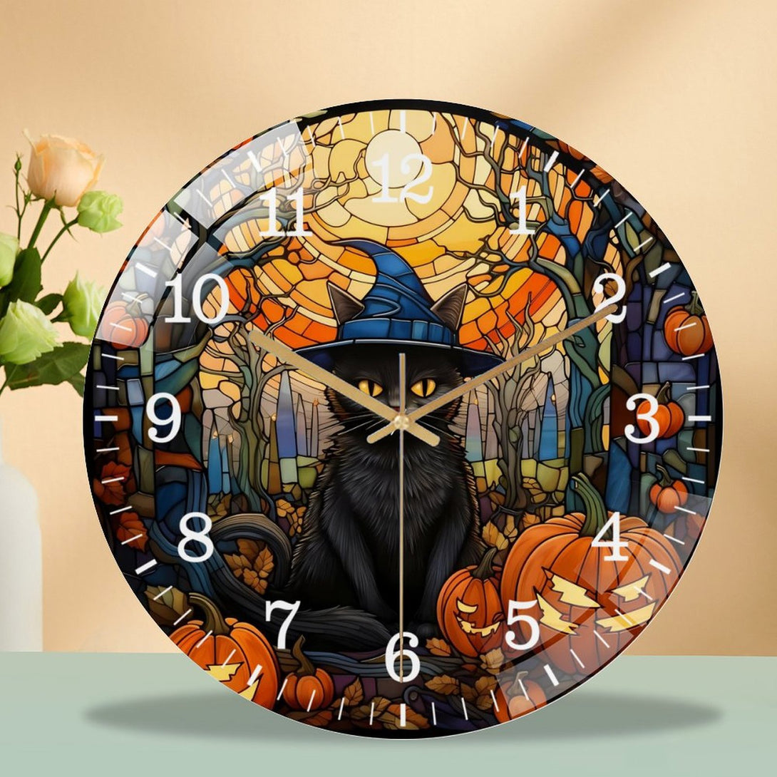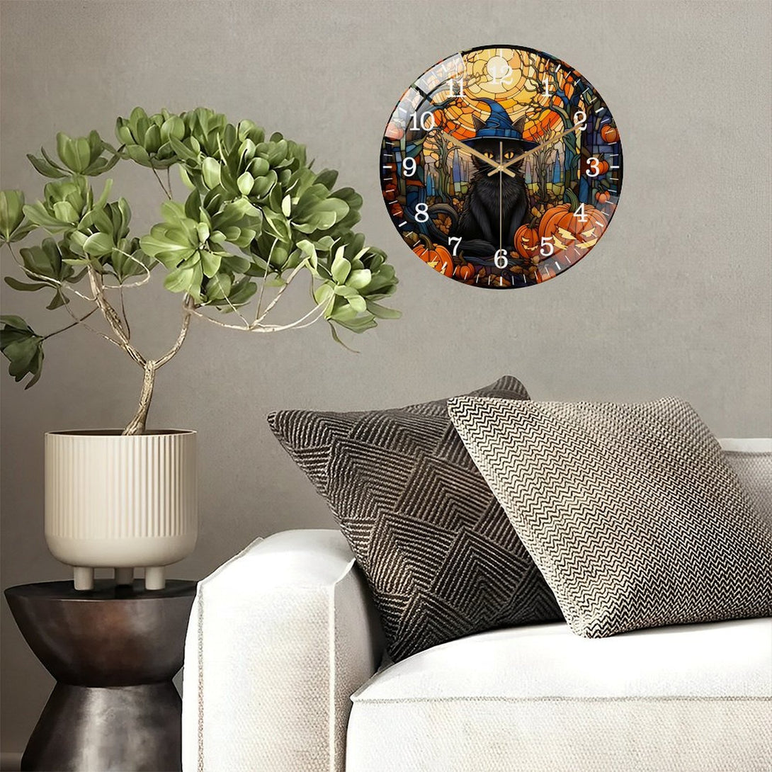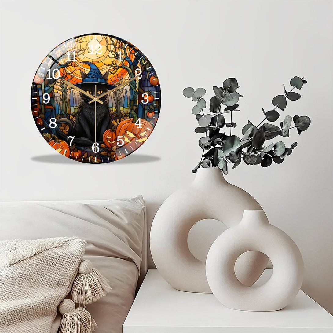 Decor Wall Clocks: Black Cat with Jack-O-Lanterns Halloween Glass Wall Clock,cat Lover Halloween Gift Decor Wall Clock for Homes, Bars, Offices, Man Caves, Garages, And Living Rooms.