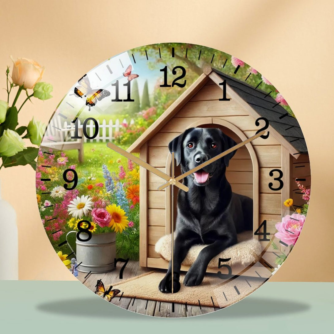 Decor Wall Clocks: Black Labrador in Dog House Glass Wall Clock ,Dog Lover Wall Clock for Homes, Bars, Offices, Man Caves, Garages, And Living Rooms. .Also Makes A Great Gift.