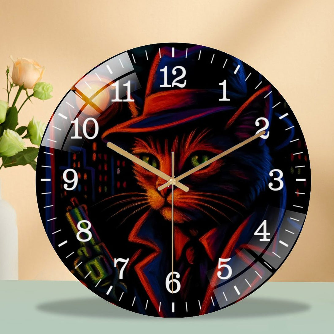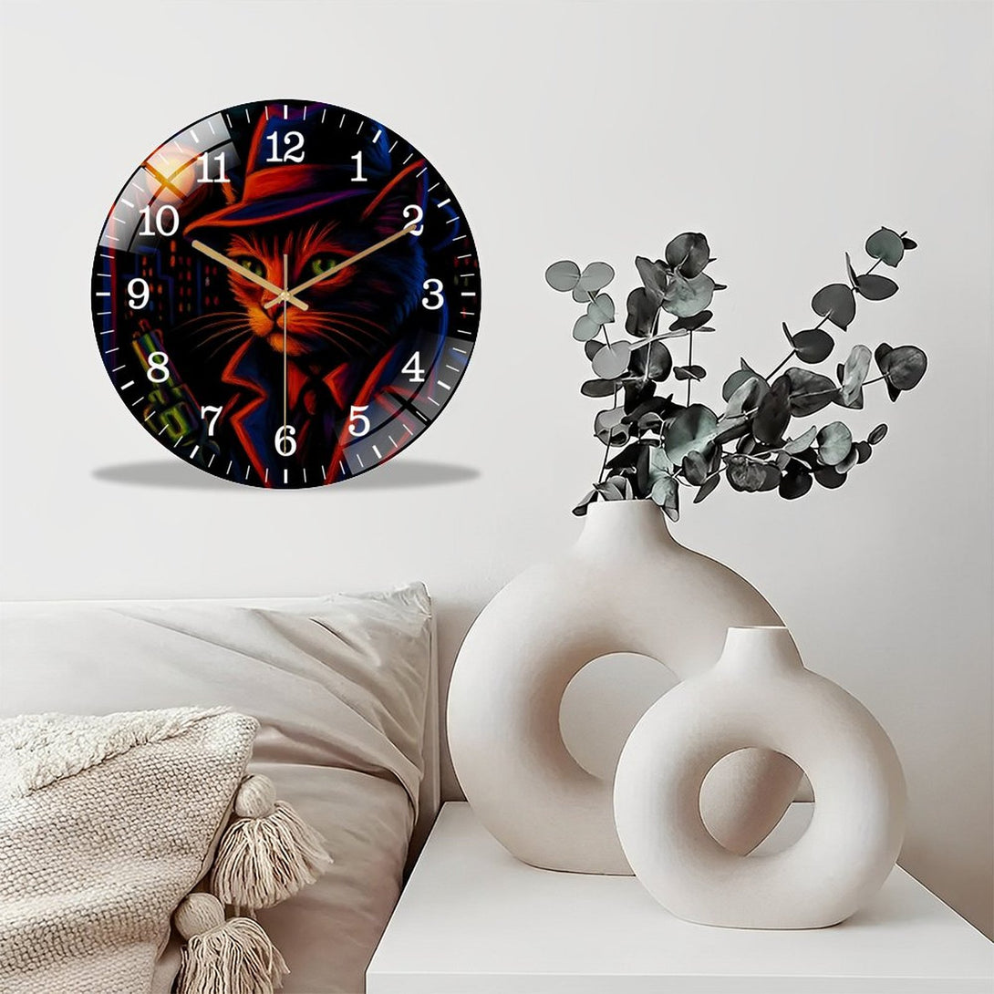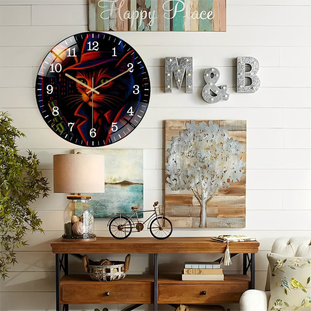 Decor Wall Clocks: Blacklight Cat Art Glass Wall Clock, Noir Detective Cat Decor Wall Clock for Homes, Bars, Offices, Man Caves, Garages, And Living Rooms. for Gift Home Wall Decor.
