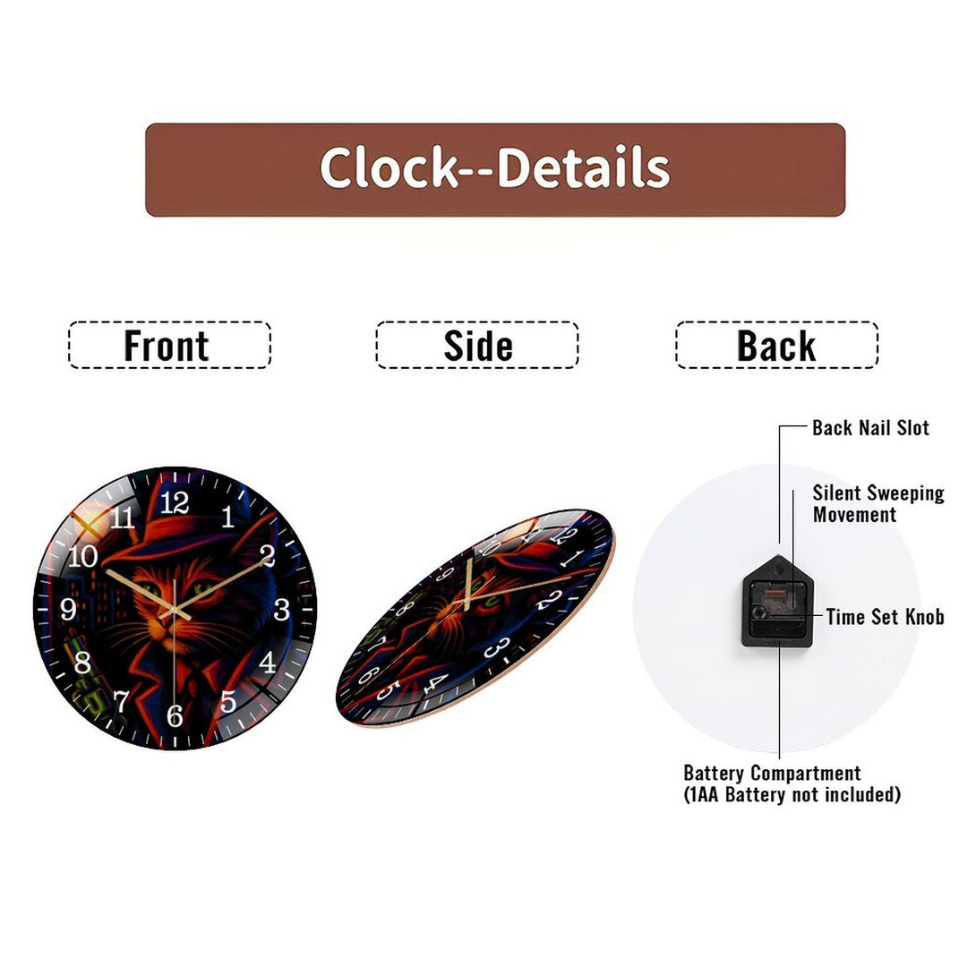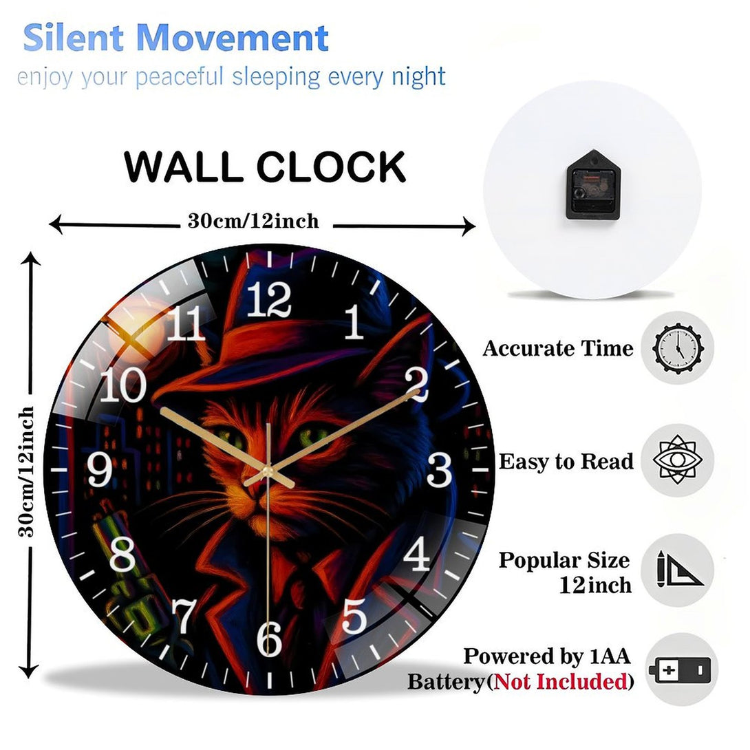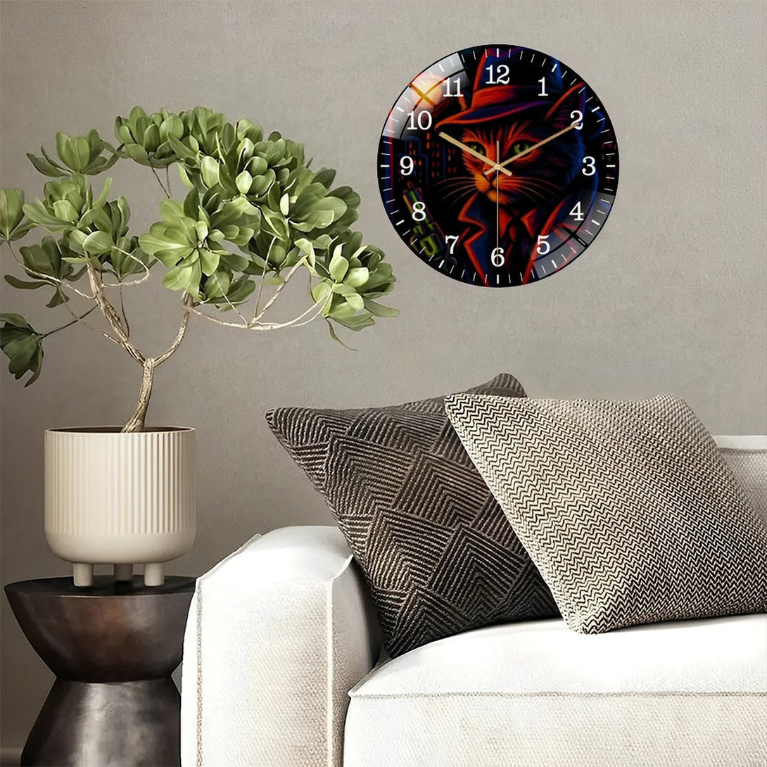 Decor Wall Clocks: Blacklight Cat Art Glass Wall Clock, Noir Detective Cat Decor Wall Clock for Homes, Bars, Offices, Man Caves, Garages, And Living Rooms. for Gift Home Wall Decor.