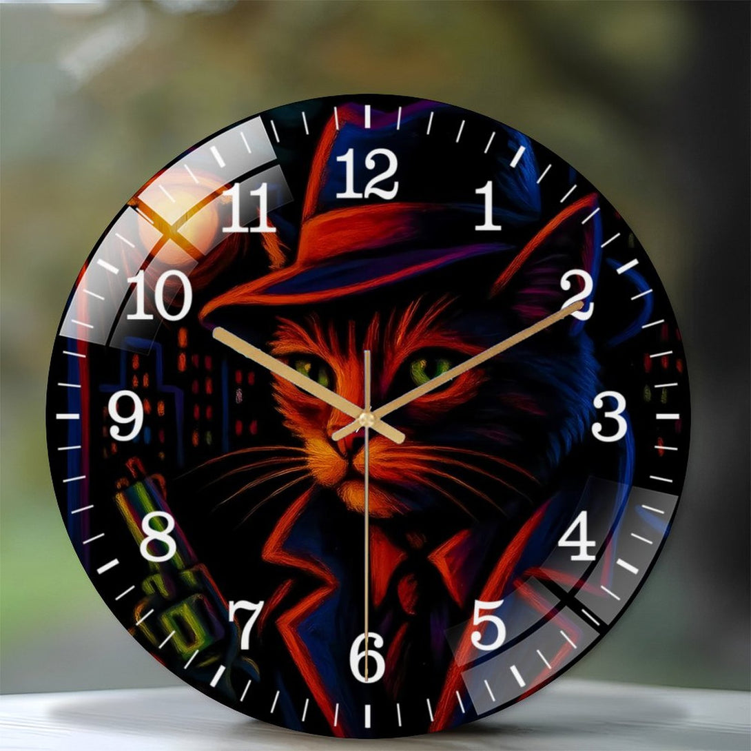 Blacklight Cat Art Glass Wall Clock, Noir Detective Cat Decor Wall Clock for Homes, Bars, Offices, Man Caves, Garages, And Living Rooms. for Gift Home Wall Decor.