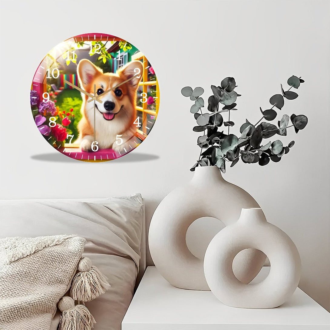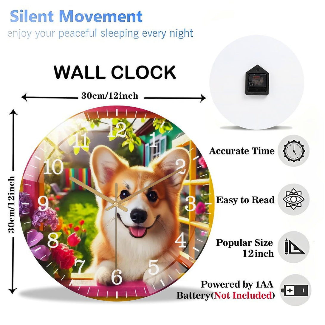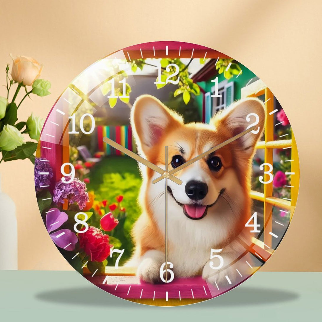 Corgi in Window Dog Glass Wall Clock ,Dog Lover Wall Clock for Homes, Bars, Offices, Man Caves, Garages, And Living Rooms. .Also Makes A Great Gift.,12×12inch(30×30cm)