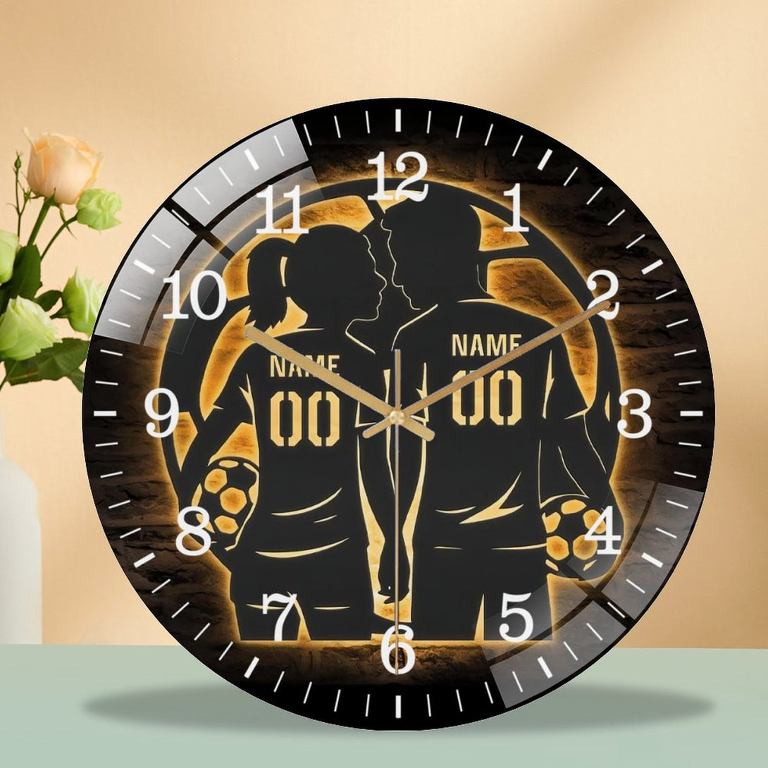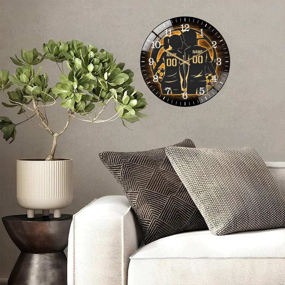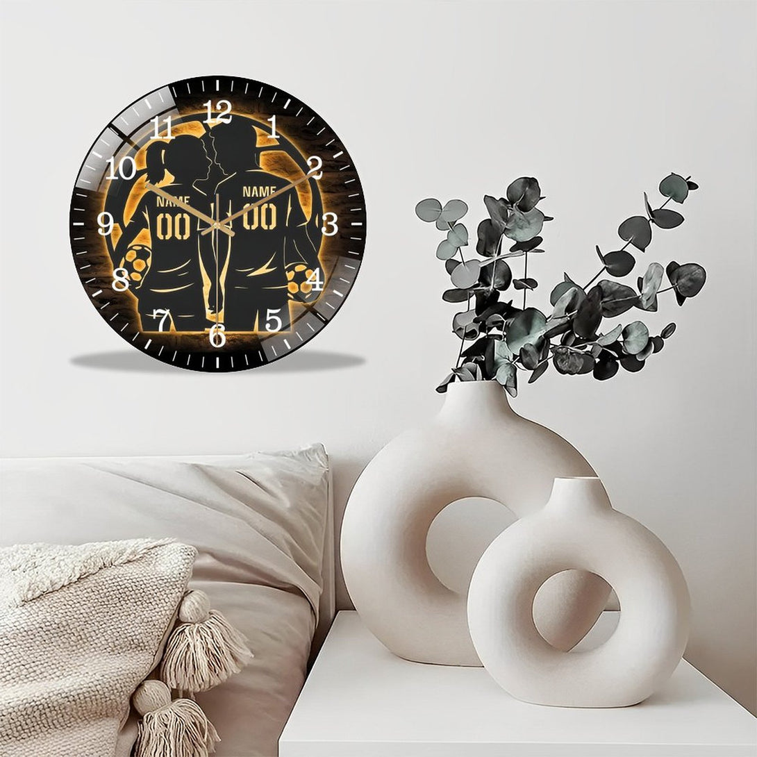 Couple Soccer Glass Wall Clock, Football Player Lover Wall Clock for Homes, Bars, Offices, Man Caves, Garages, And Living Rooms. Also Makes A Great Gift.,12×12inch(30×30cm)