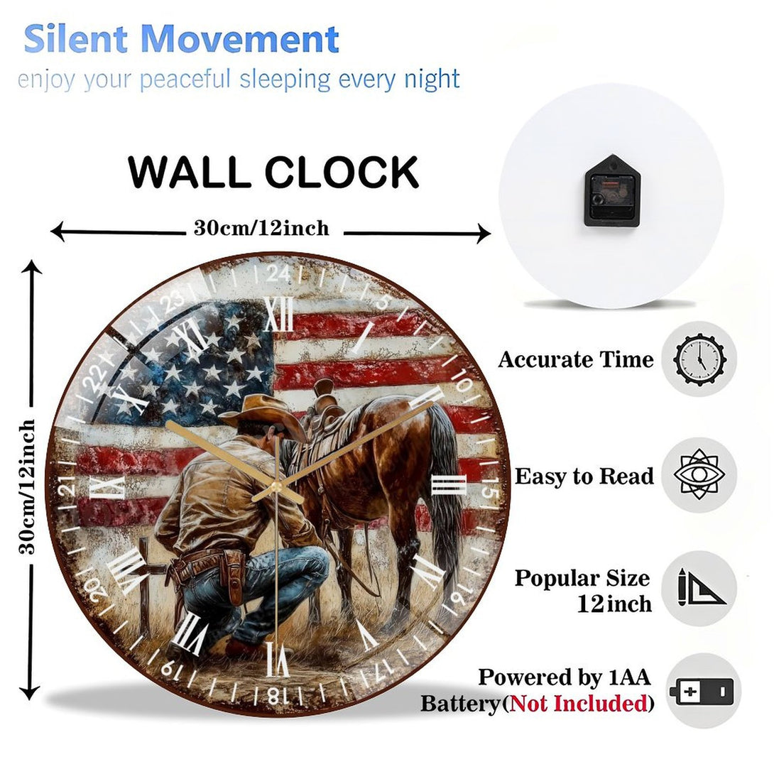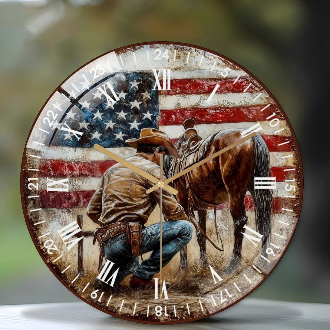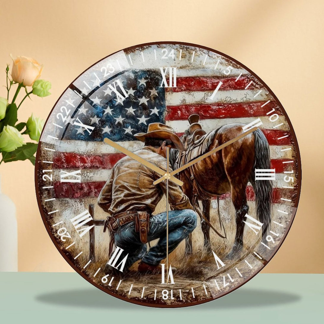 Cowboy And Horse with Flag Glass Wall Clock, Patriotic Cowboy Decor Wall Clock for Homes, Bars, Offices, Man Caves, Garages, And Living Rooms.,12×12inch(30×30cm)