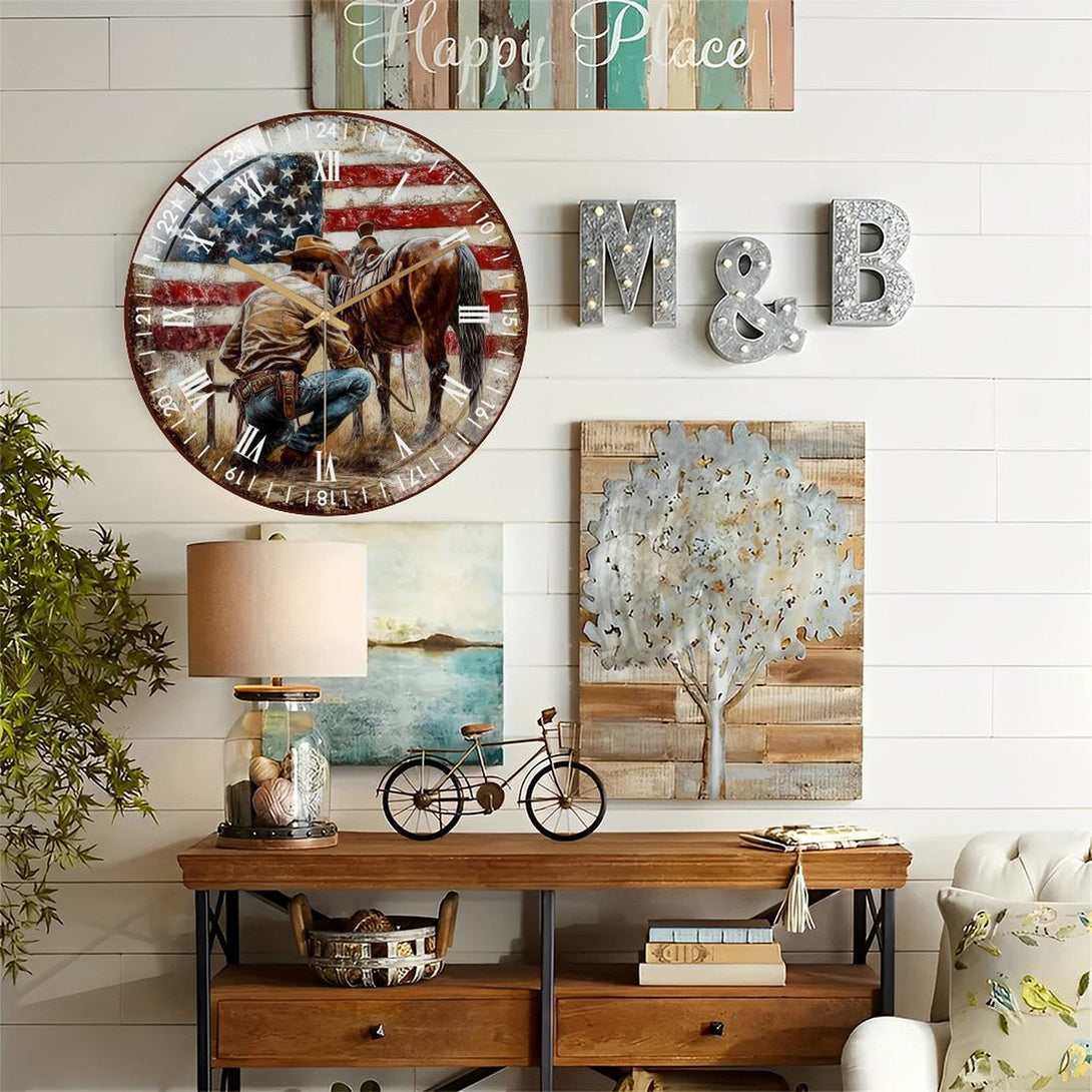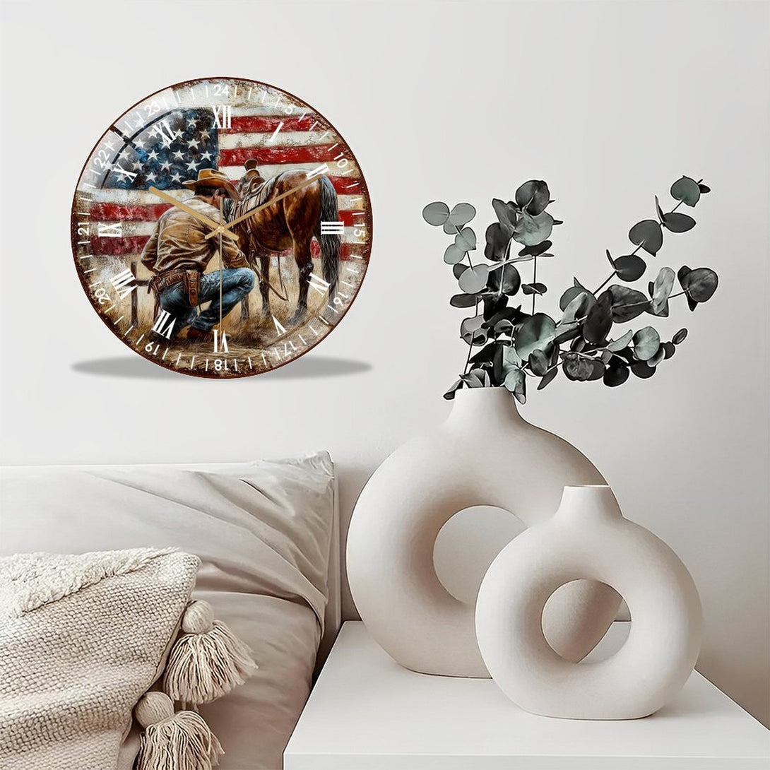 Decor Wall Clocks: Cowboy And Horse with Flag Glass Wall Clock, Patriotic Cowboy Decor Wall Clock for Homes, Bars, Offices, Man Caves, Garages, And Living Rooms. Style 12×12inch(30×30cm)