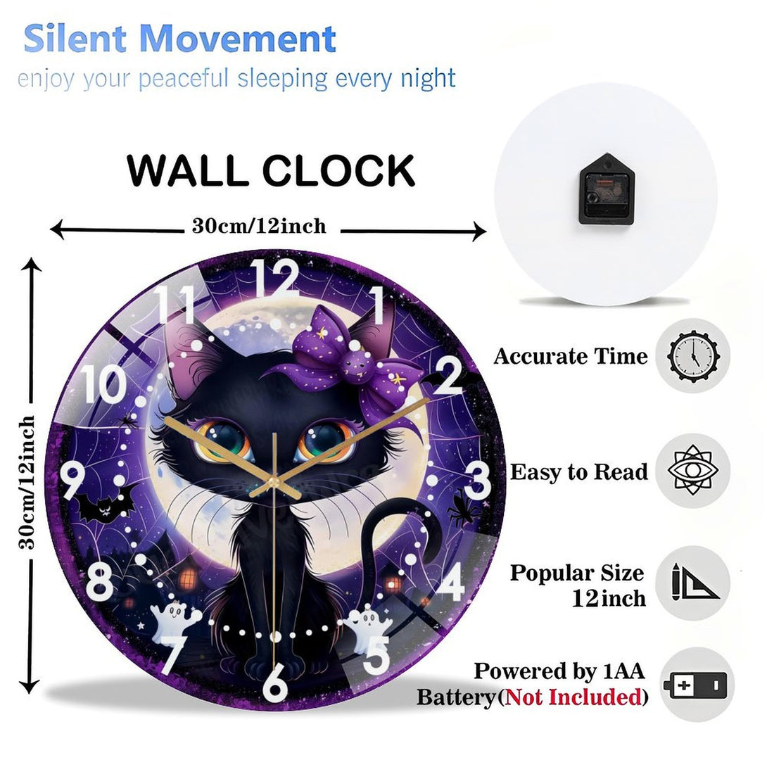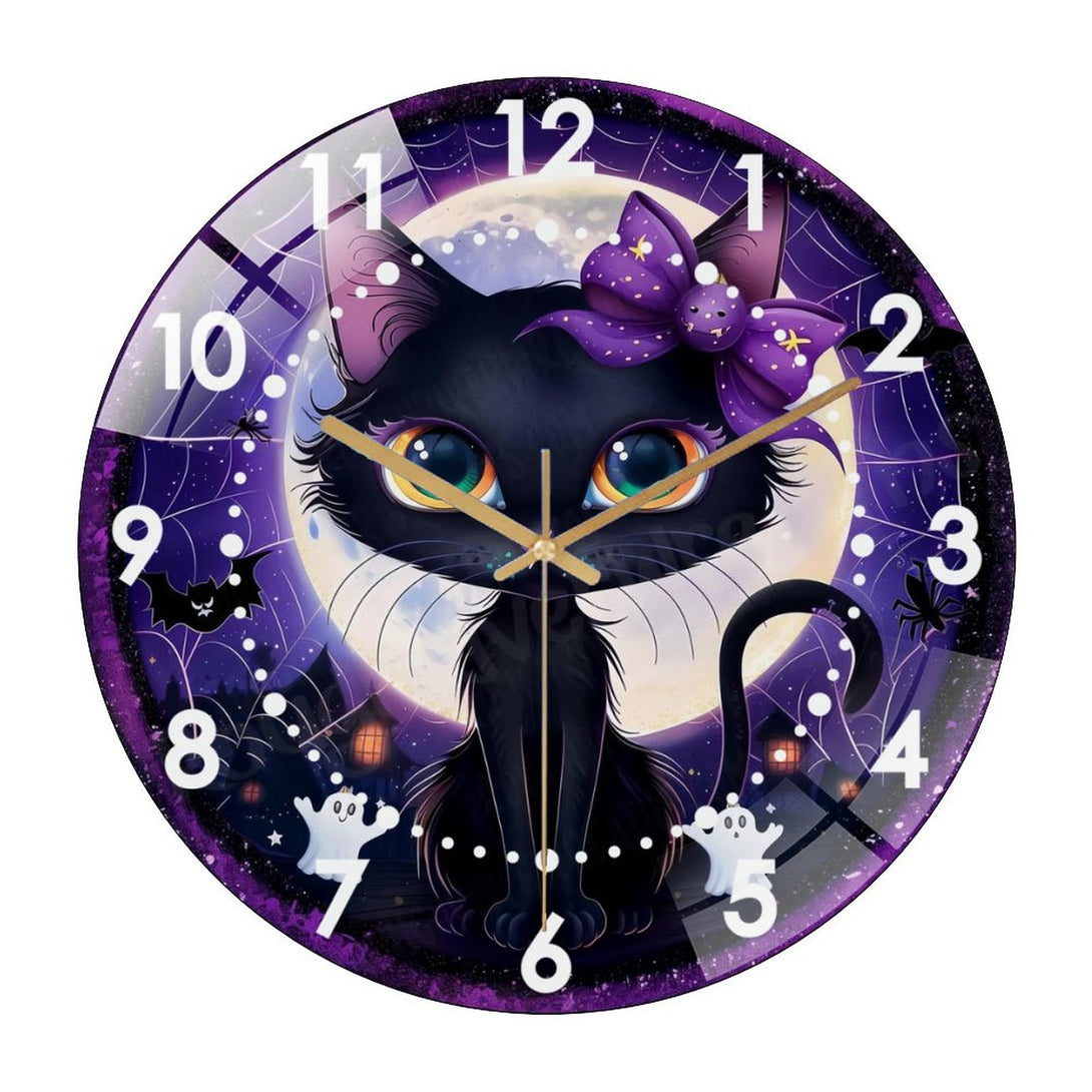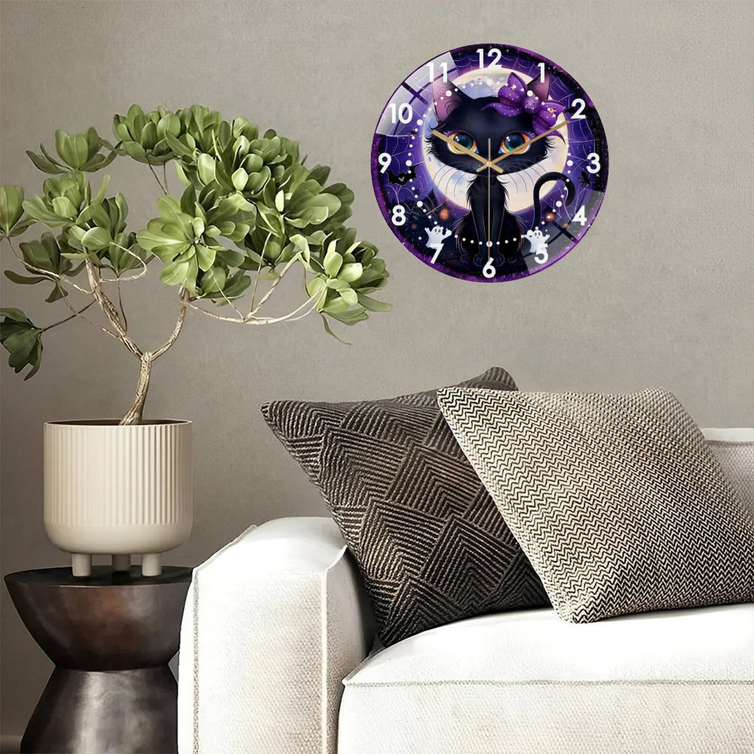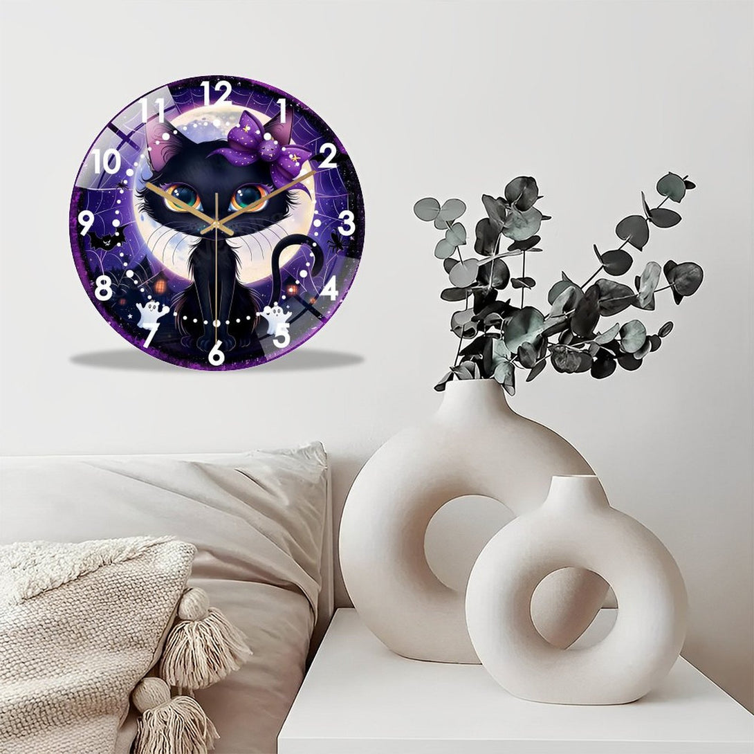 Cute Black Cat Glass Wall Clock for Homes, Bars, Offices, Man Caves, Garages, And Living Rooms. Also Makes A Great Gift.,12×12inch(30×30cm)