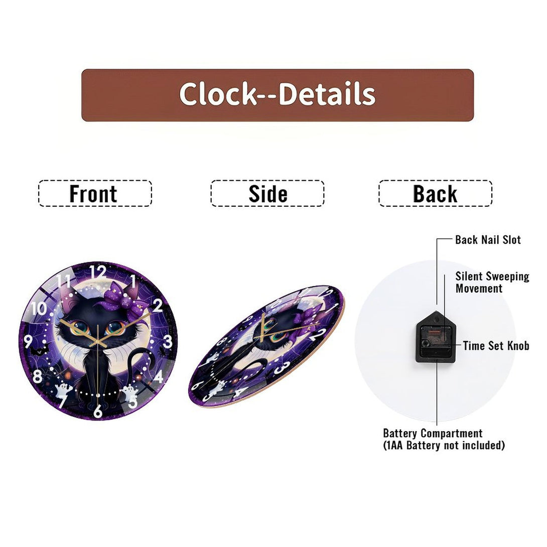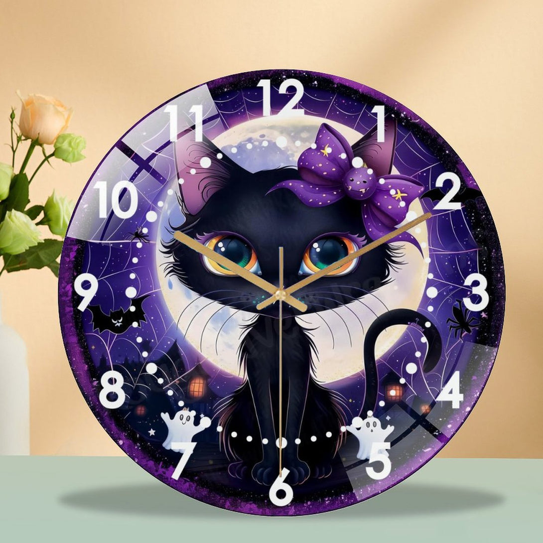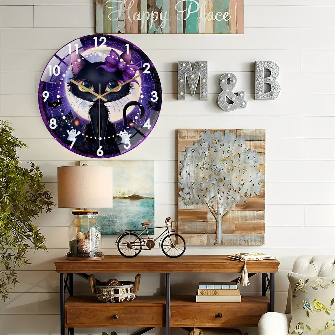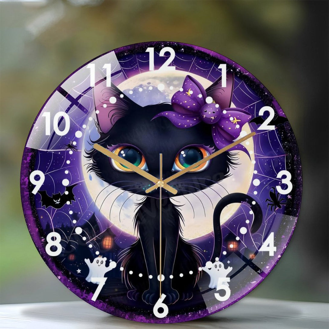 Cute Black Cat Glass Wall Clock for Homes, Bars, Offices, Man Caves, Garages, And Living Rooms. Also Makes A Great Gift.,12×12inch(30×30cm)