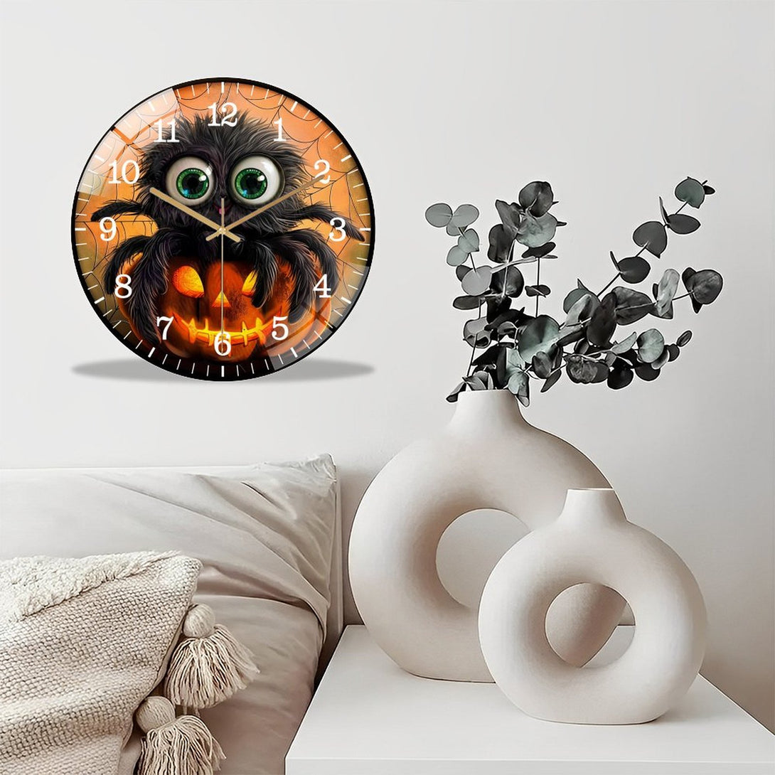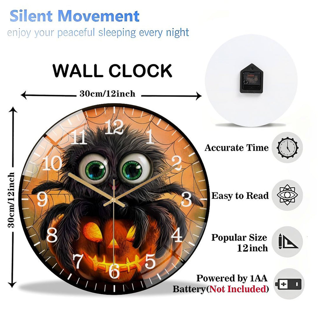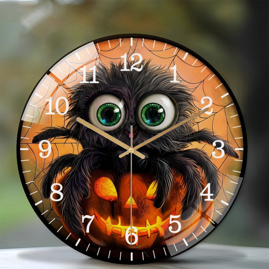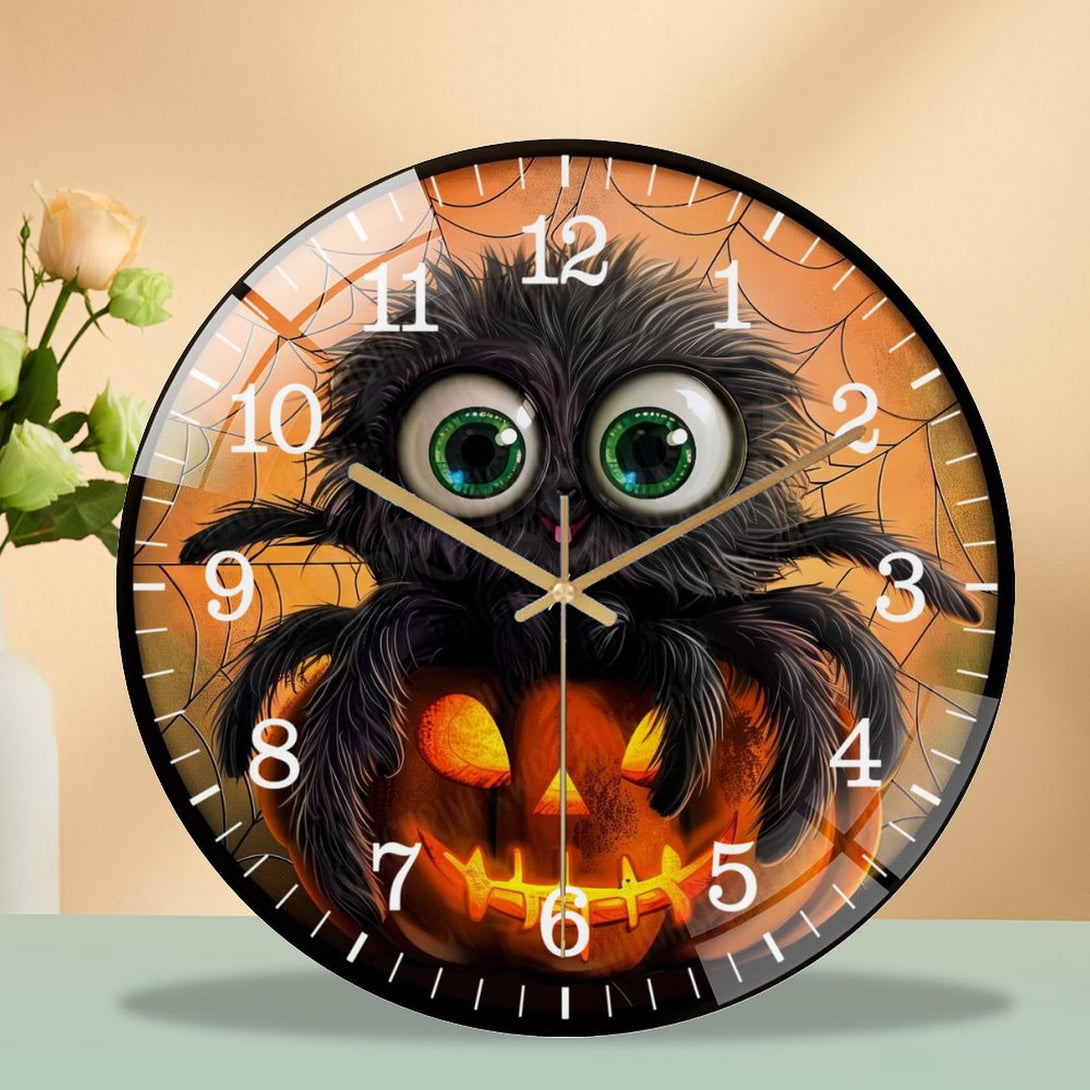 Cute Furry Black Spider on A Pumpkin Glass Wall Clock ,Hallo-ween Spider Wall Clock for Homes, Bars, Offices, Man Caves, Garages, And Living Rooms. for Your Home Or Gift,12×12inch(30×30cm)