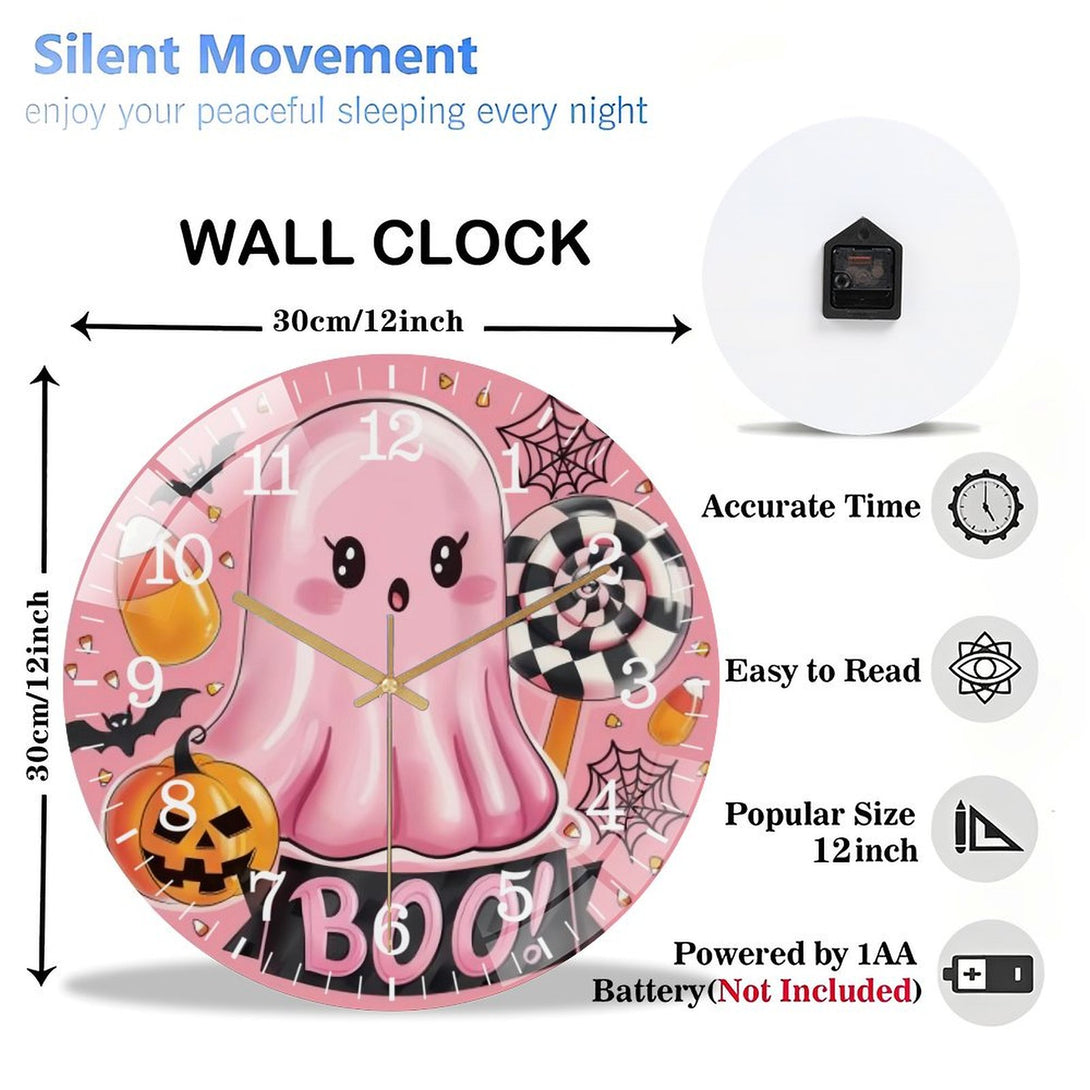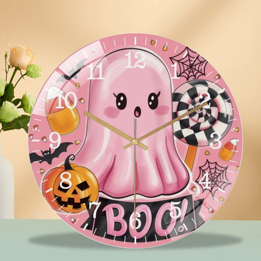 Cute Pink Ghos T Boo Glass Wall Clock, Hallo-ween Home Decor Wall Clock, Hallo-ween Gift,Also Makes A Great Gift.,12×12inch(30×30cm)