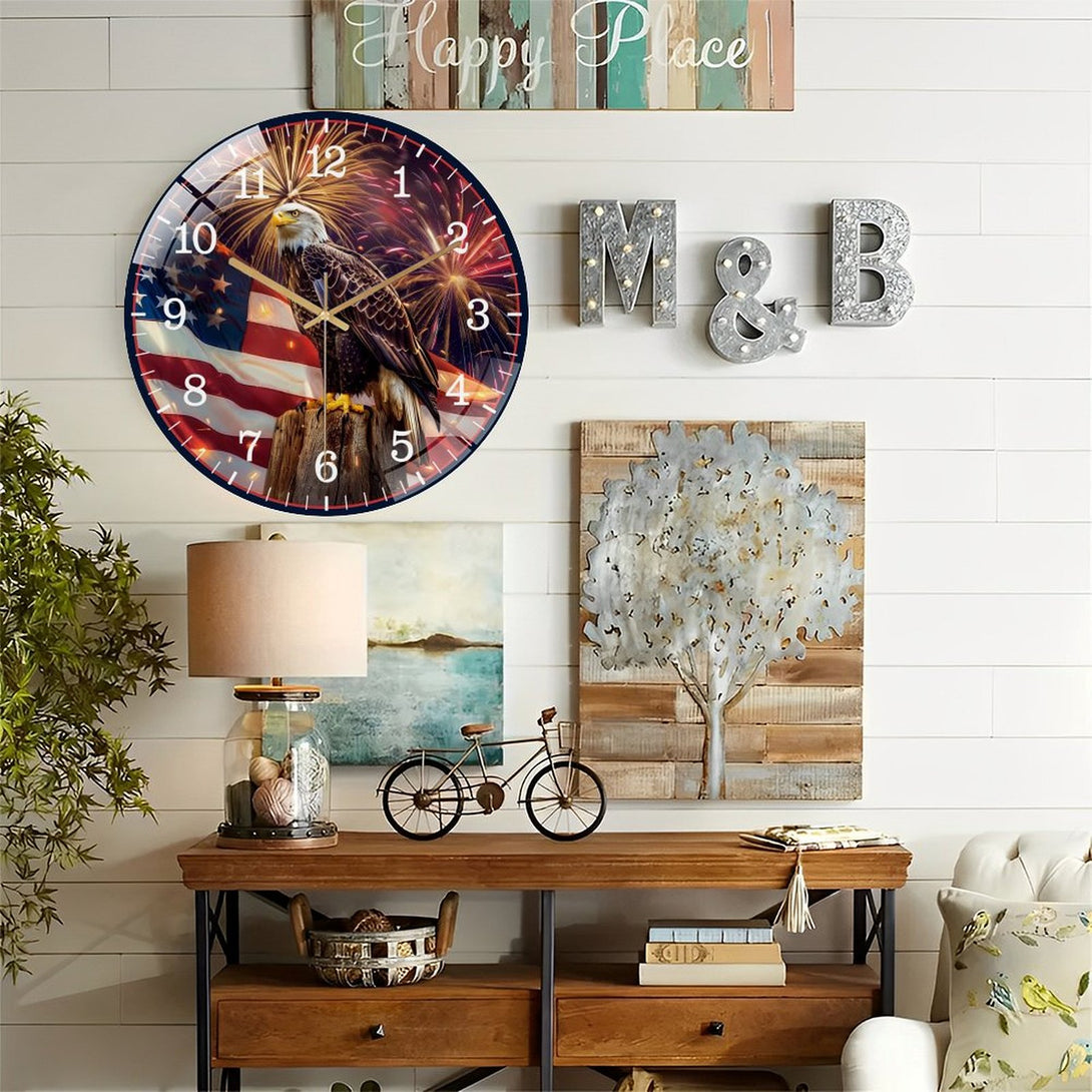 Decor Wall Clocks: Eagle Patriotic Fireworks Glass Wall Clock, Eagle Decor Wall Clock for Homes, Bars, Offices, Man Caves, Garages, And Living Rooms .Also Makes A Great Gift.