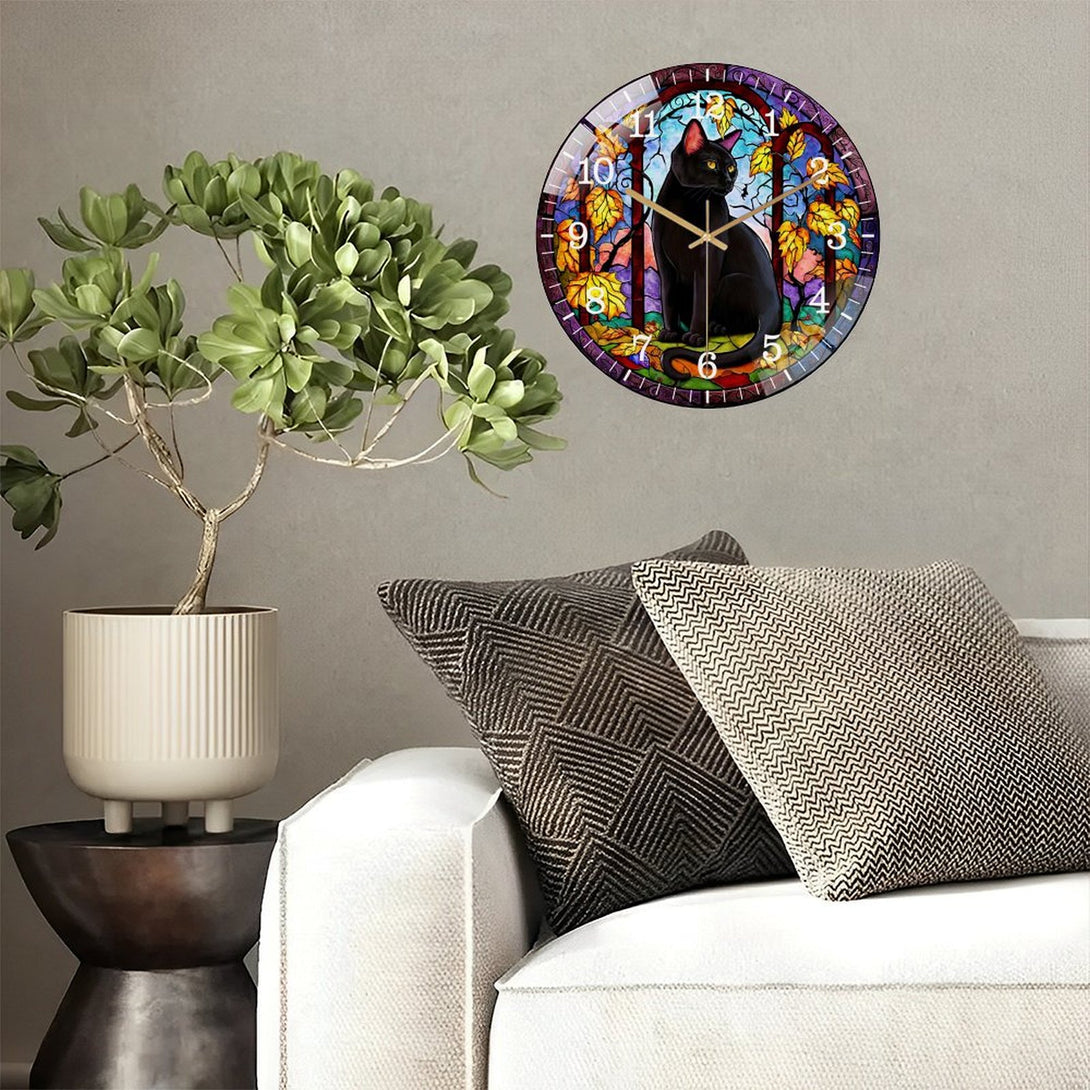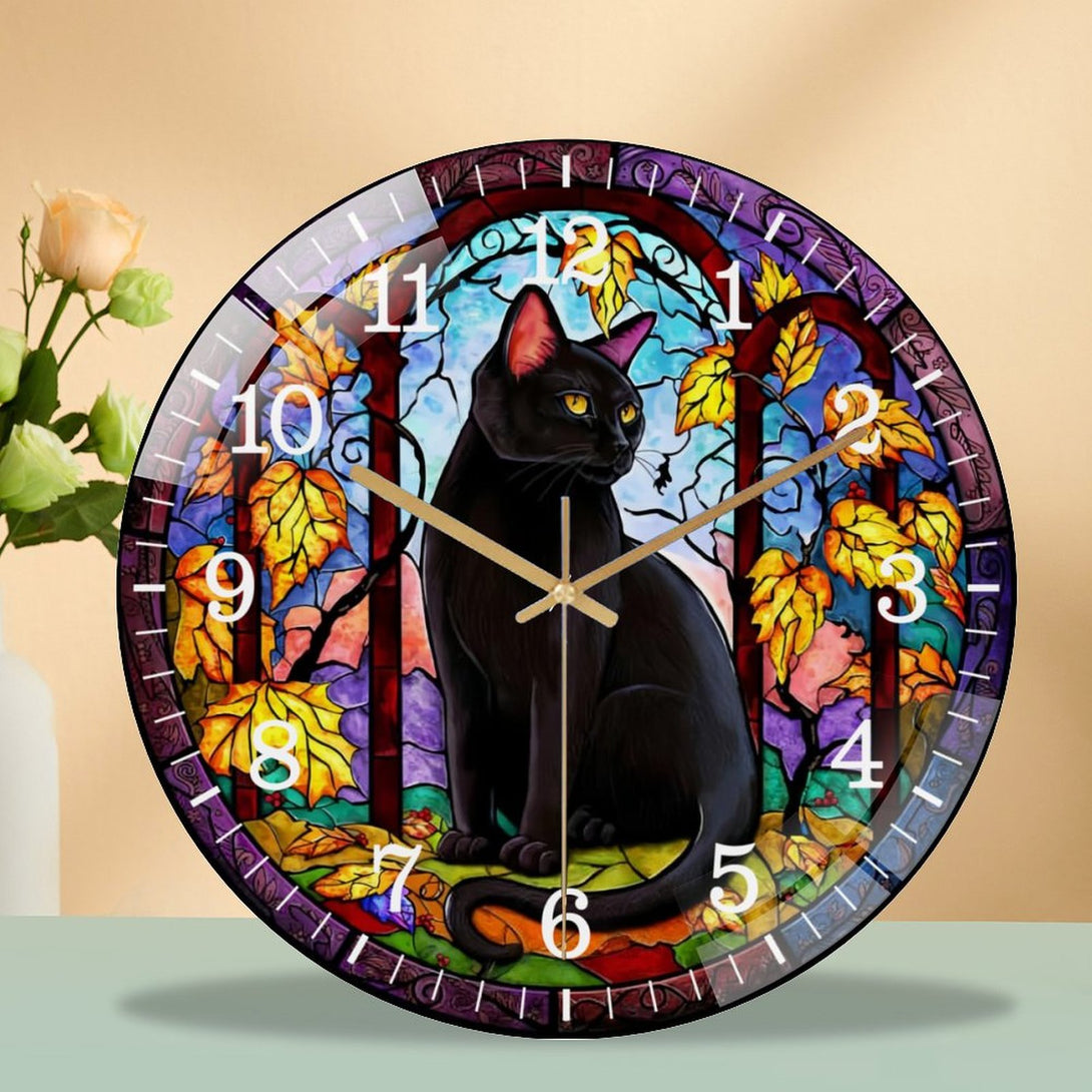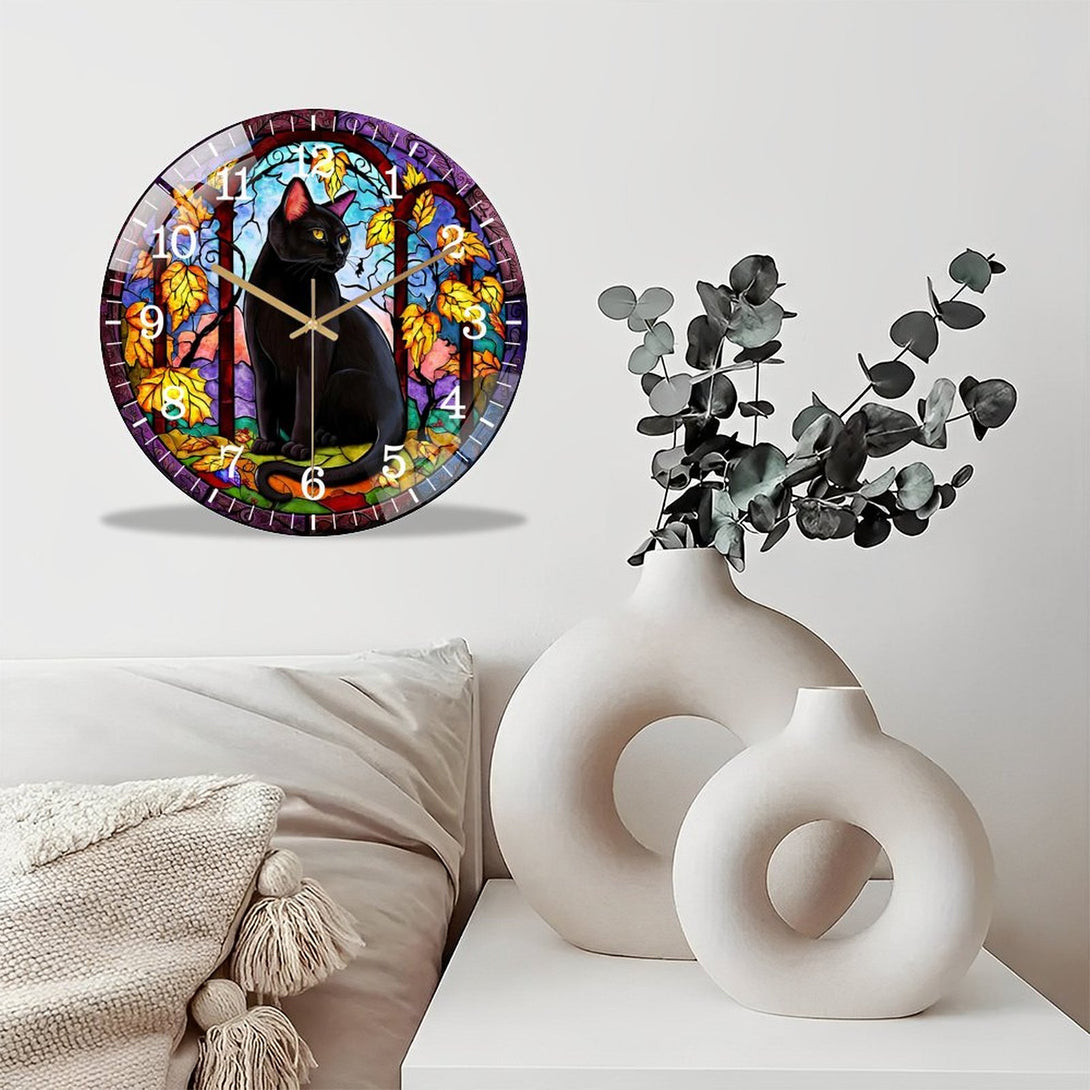 Faux Stained Glass Black Cat Wreath Glass Wall Clock for Homes, Bars, Offices, Man Caves, Garages, And Living Rooms. Also Makes A Great Gift.,12×12inch(30×30cm)