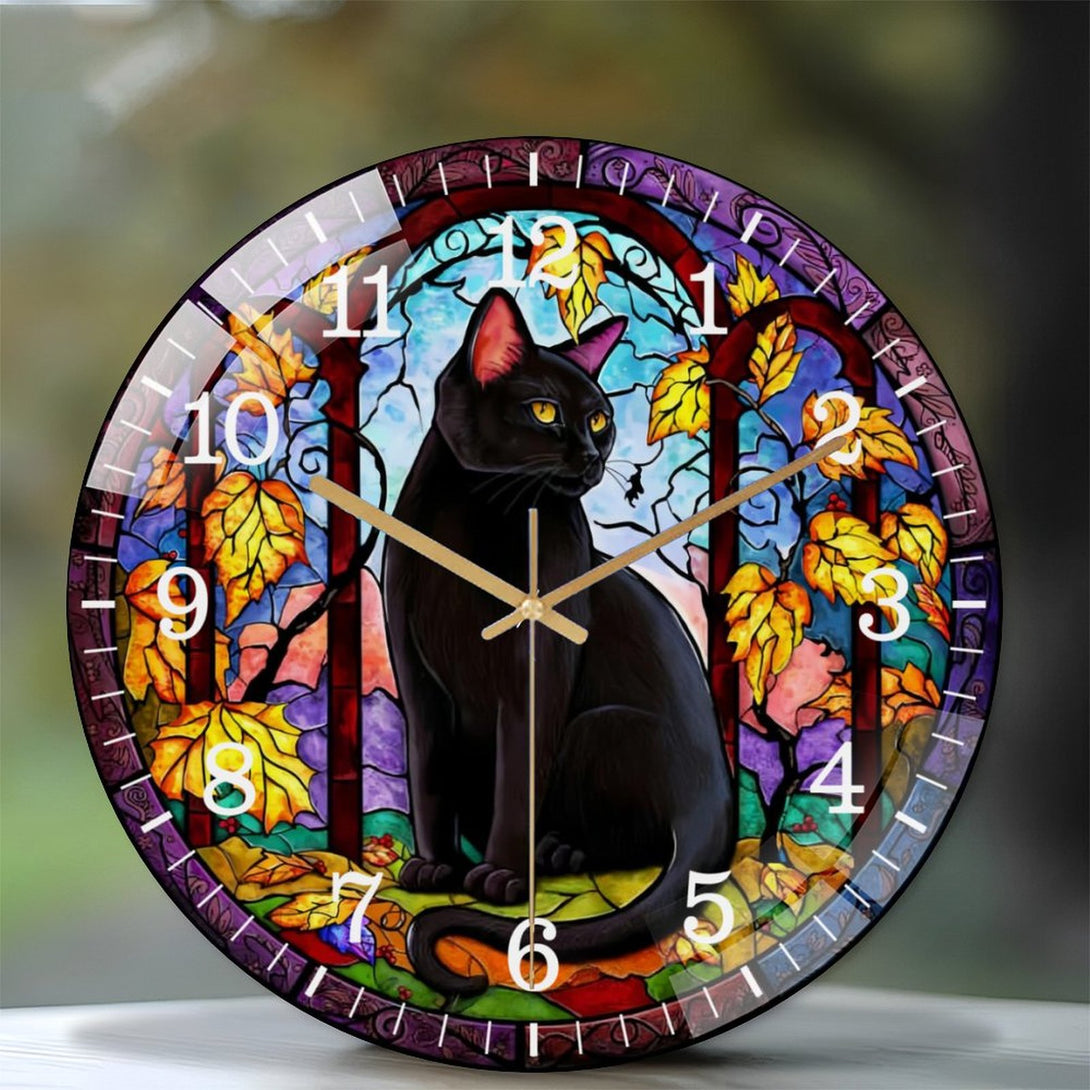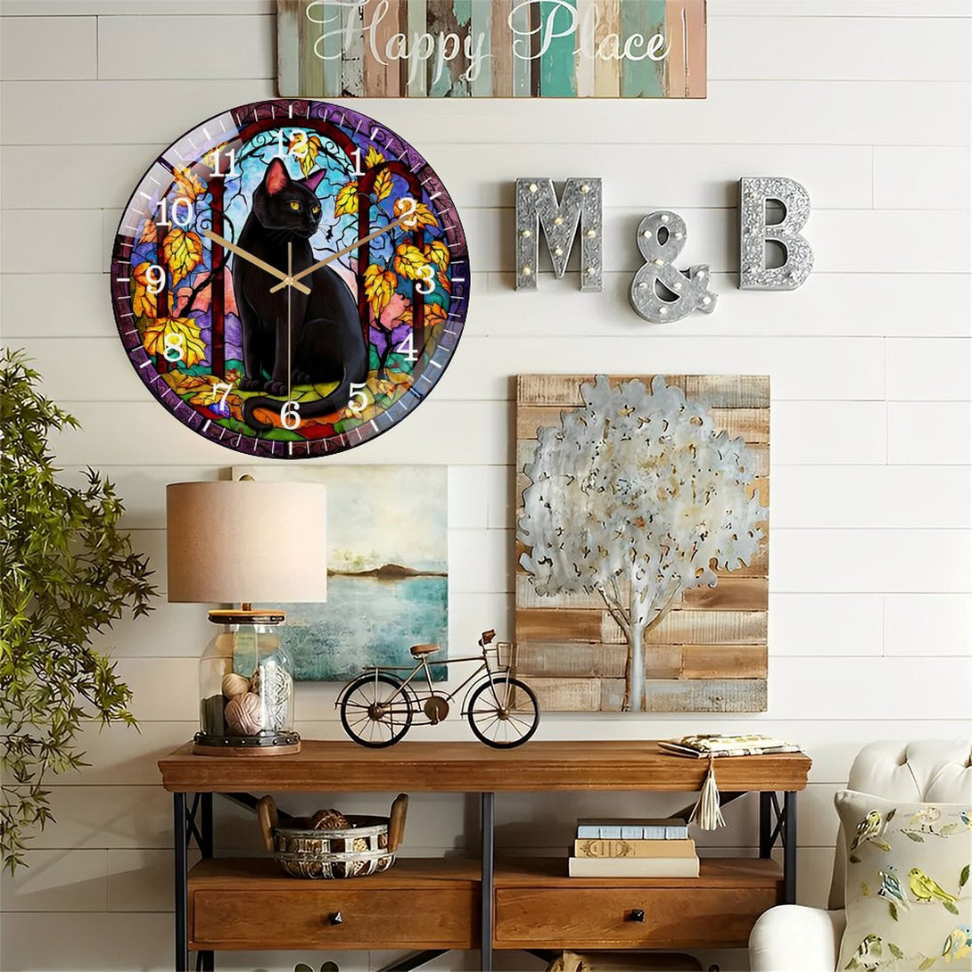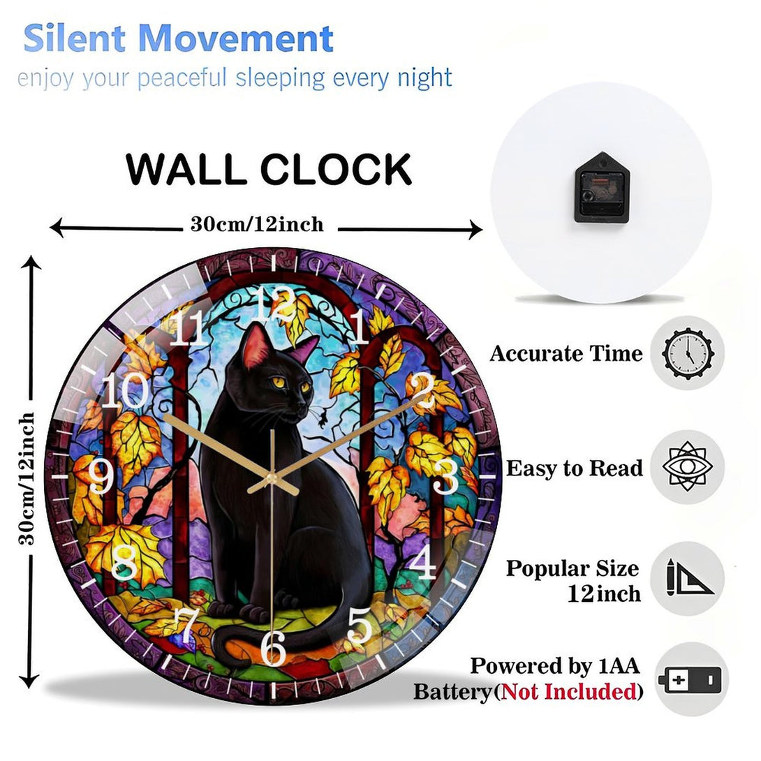 Faux Stained Glass Black Cat Wreath Glass Wall Clock for Homes, Bars, Offices, Man Caves, Garages, And Living Rooms. Also Makes A Great Gift.,12×12inch(30×30cm)