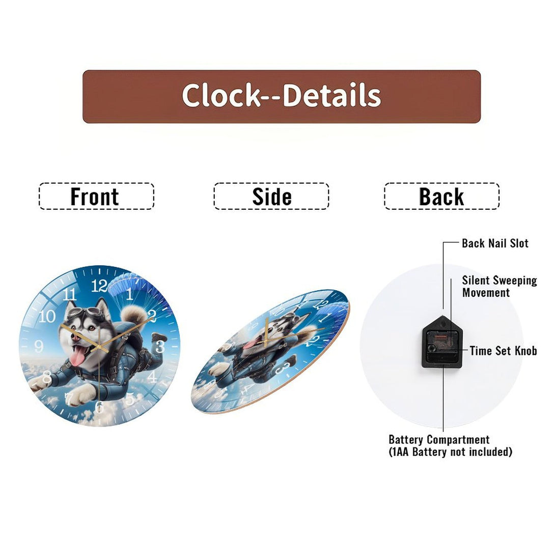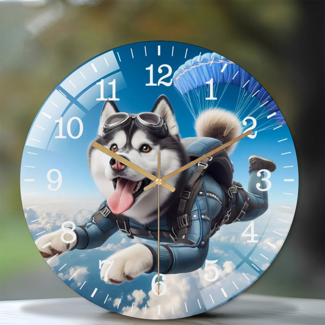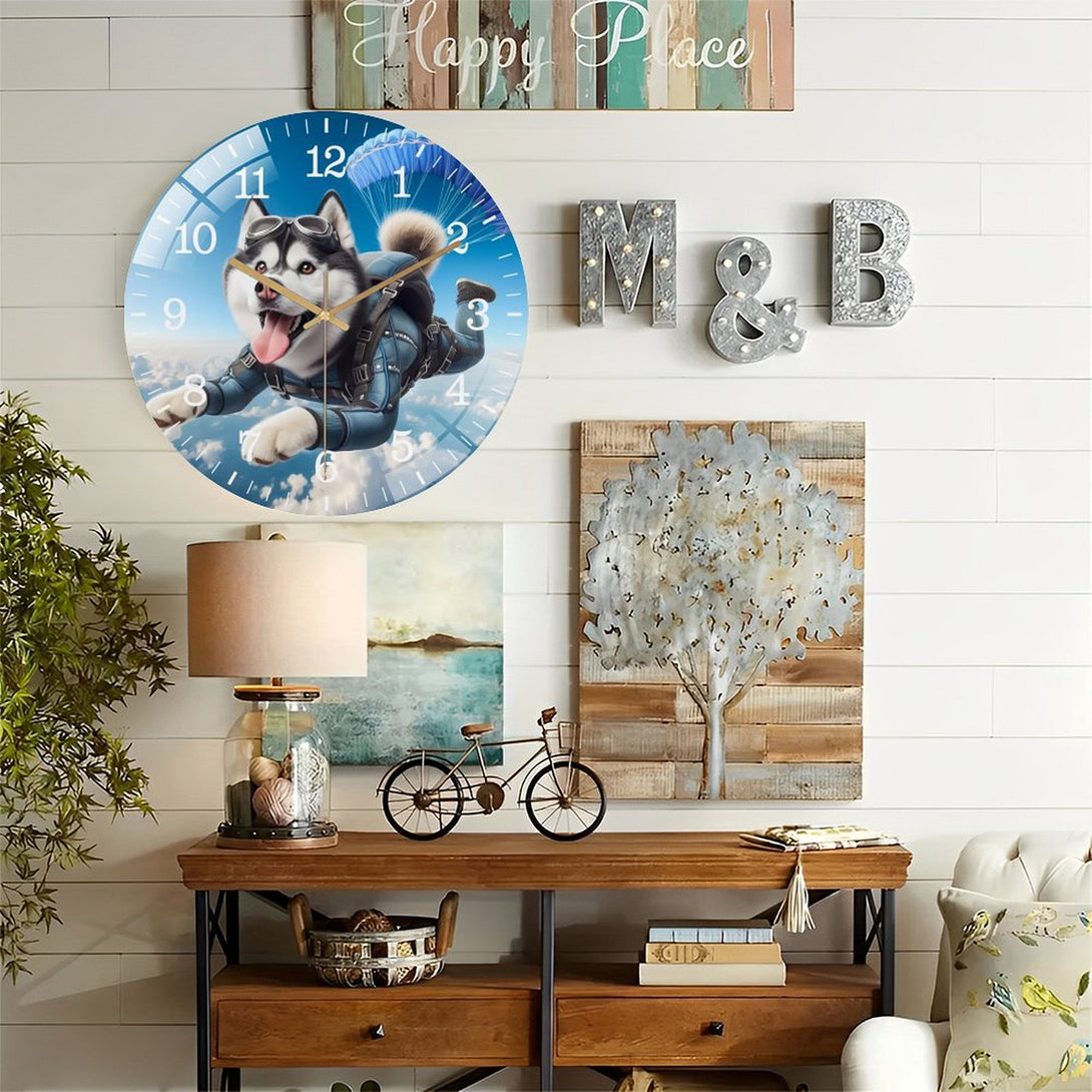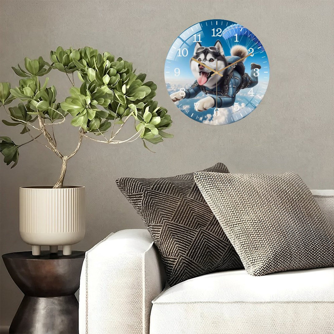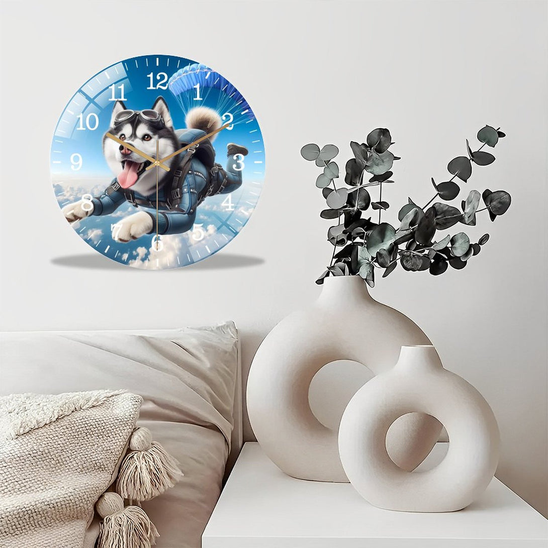 Decor Wall Clocks: Funny Husky Skydiving Glass Wall Clock ,Dog Lover Wall Clock for Homes, Bars, Offices, Man Caves, Garages, And Living Rooms. .Dog Skydiving Collection Wall Clock