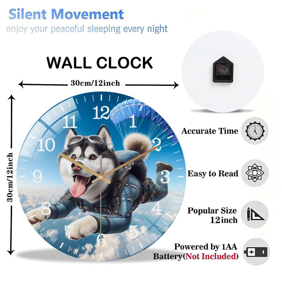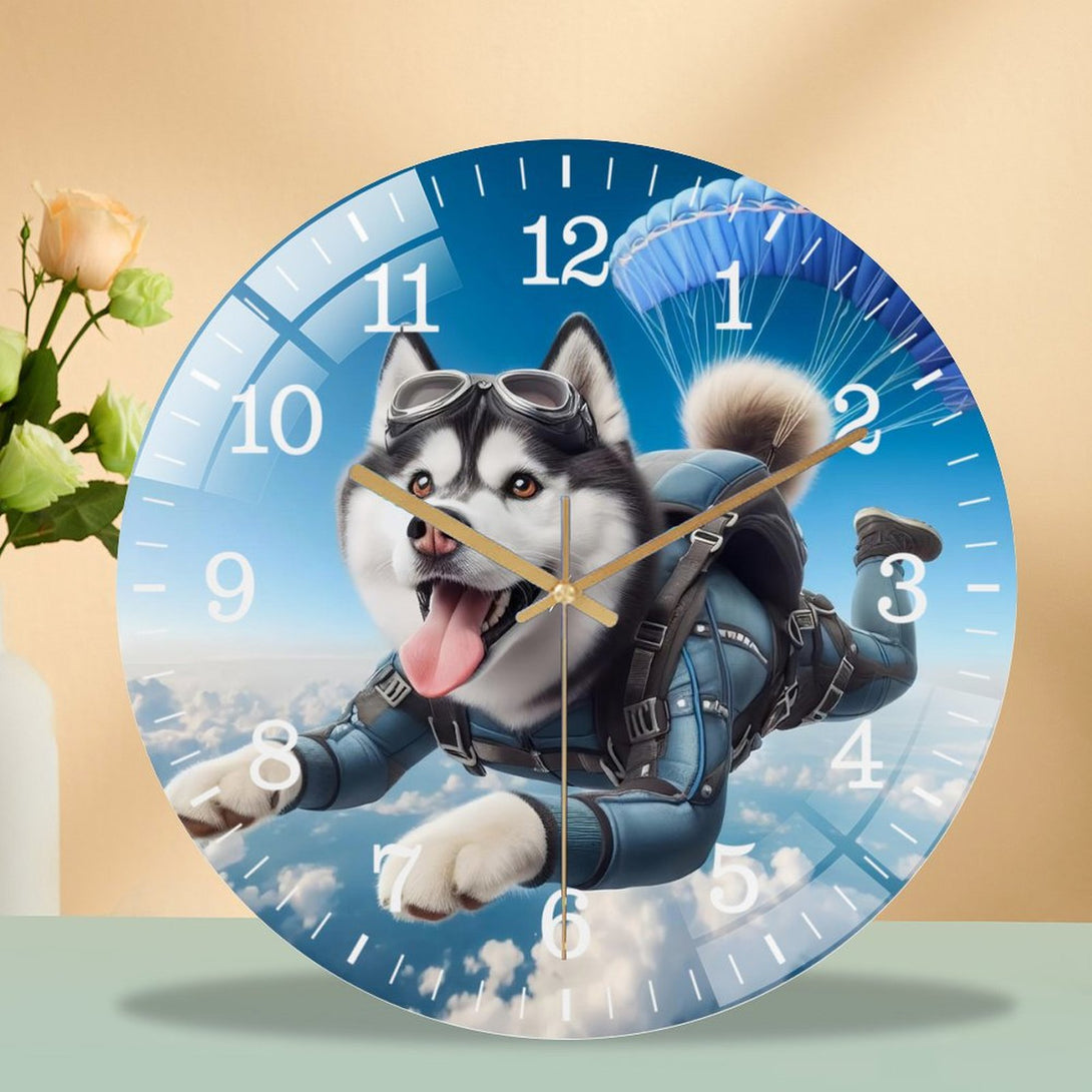 Funny Husky Skydiving Glass Wall Clock ,Dog Lover Wall Clock for Homes, Bars, Offices, Man Caves, Garages, And Living Rooms. .Dog Skydiving Collection Wall Clock,12×12inch(30×30cm)