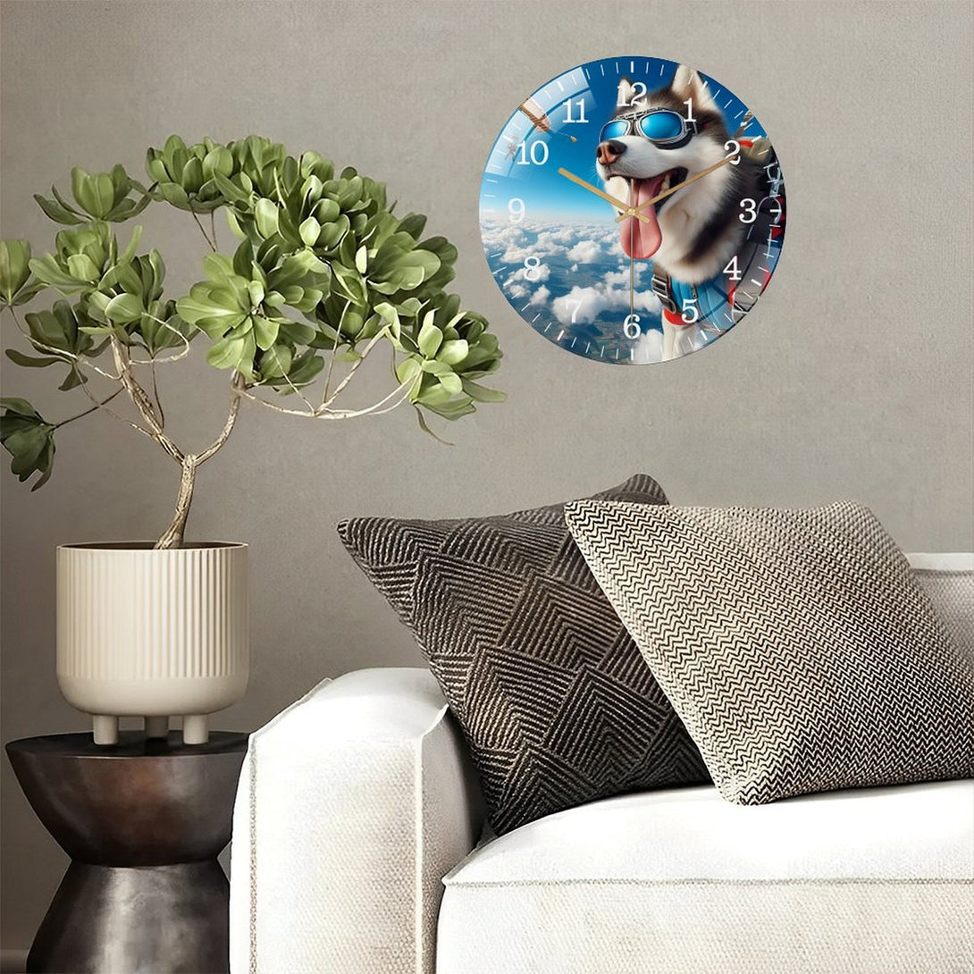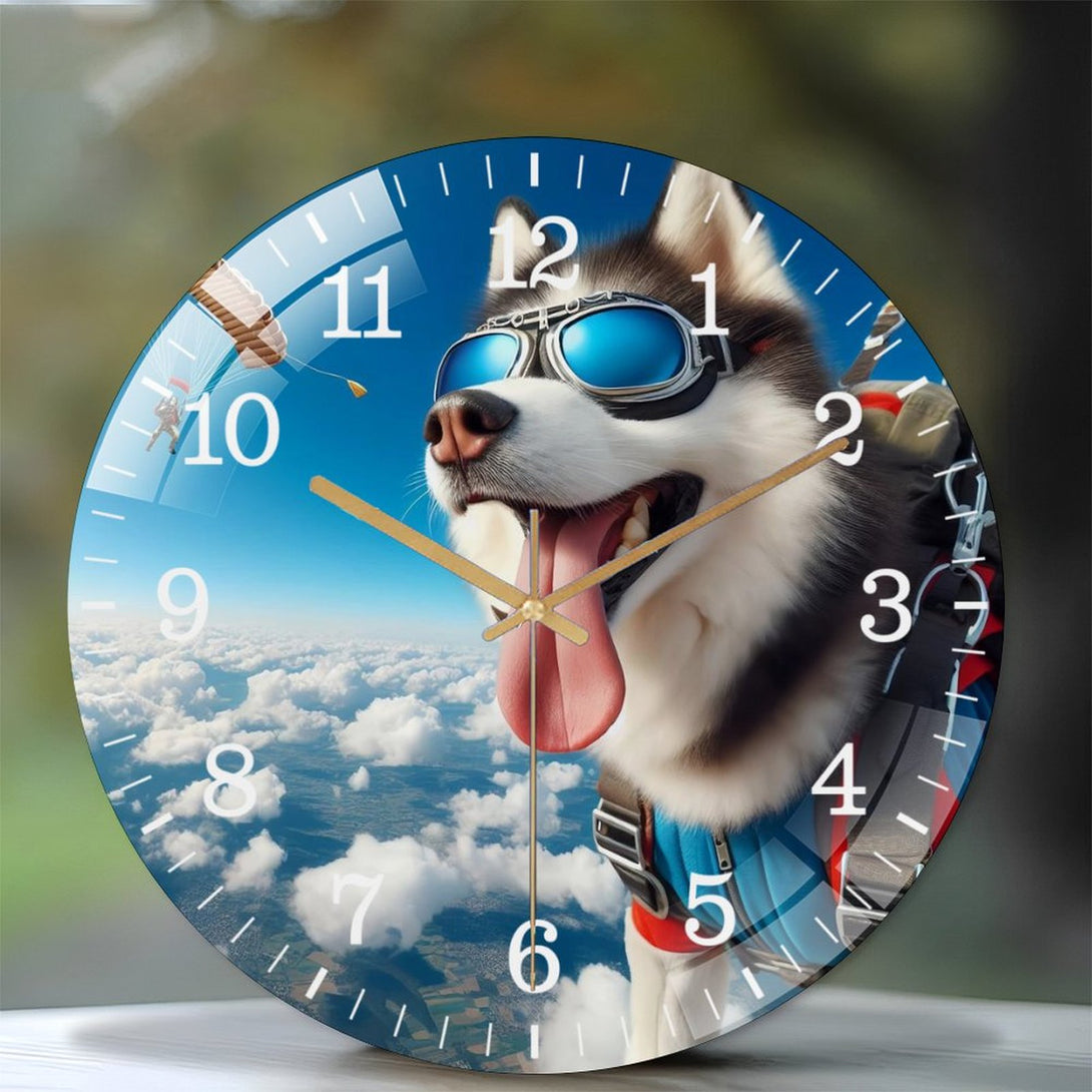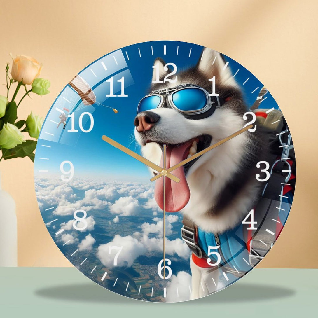 Decor Wall Clocks: Funny Husky Skydiving Glass Wall Clock ,Dog Skydiving Collection Wall Clock ,Dog Lover Wall Clock for Homes, Bars, Offices, Man Caves, Garages, And Living Rooms.