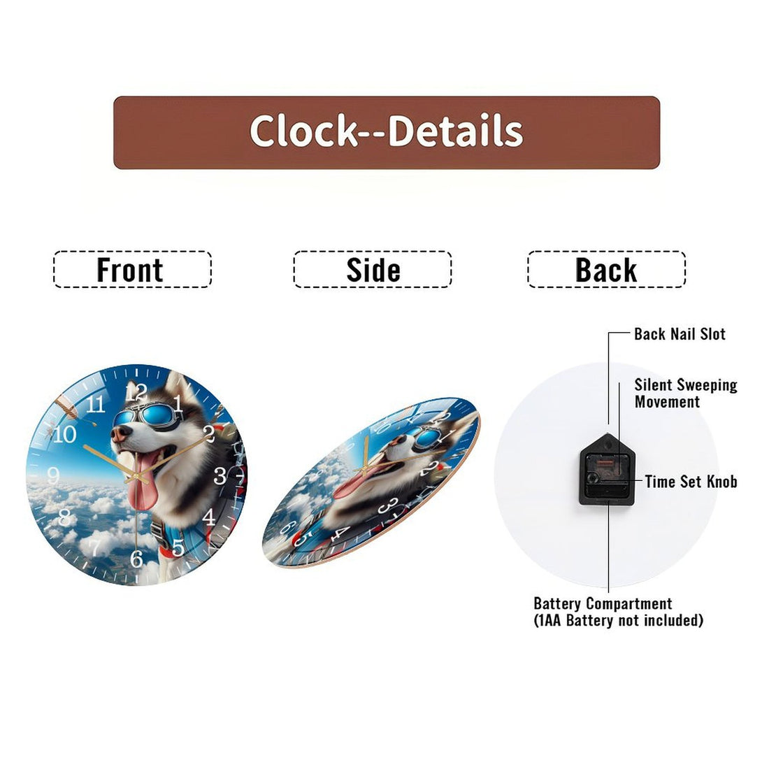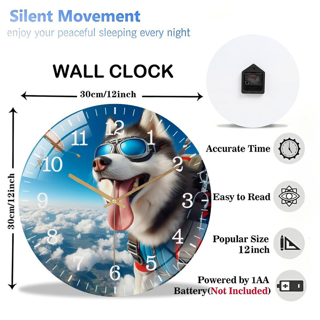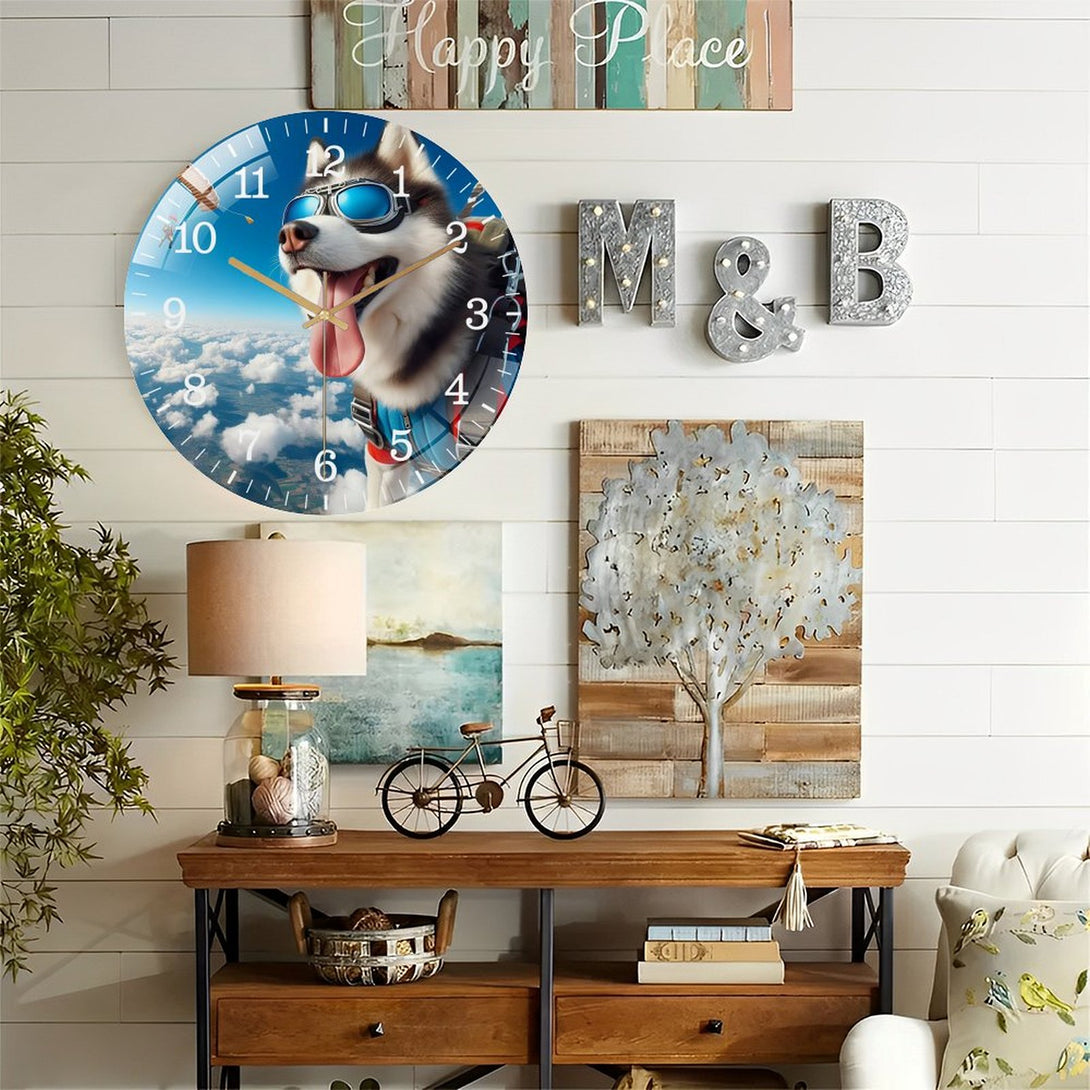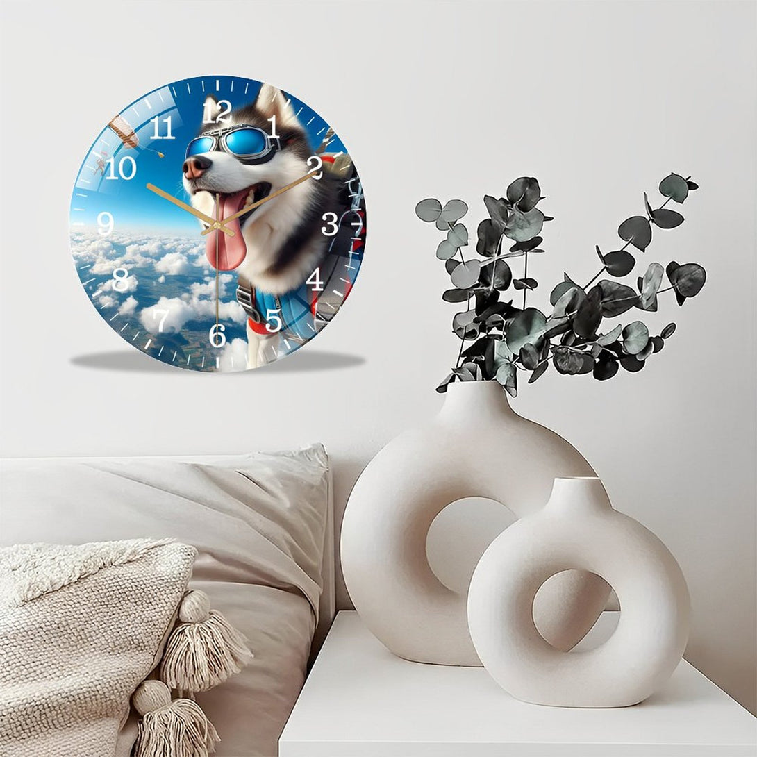 Decor Wall Clocks: Funny Husky Skydiving Glass Wall Clock ,Dog Skydiving Collection Wall Clock ,Dog Lover Wall Clock for Homes, Bars, Offices, Man Caves, Garages, And Living Rooms.
