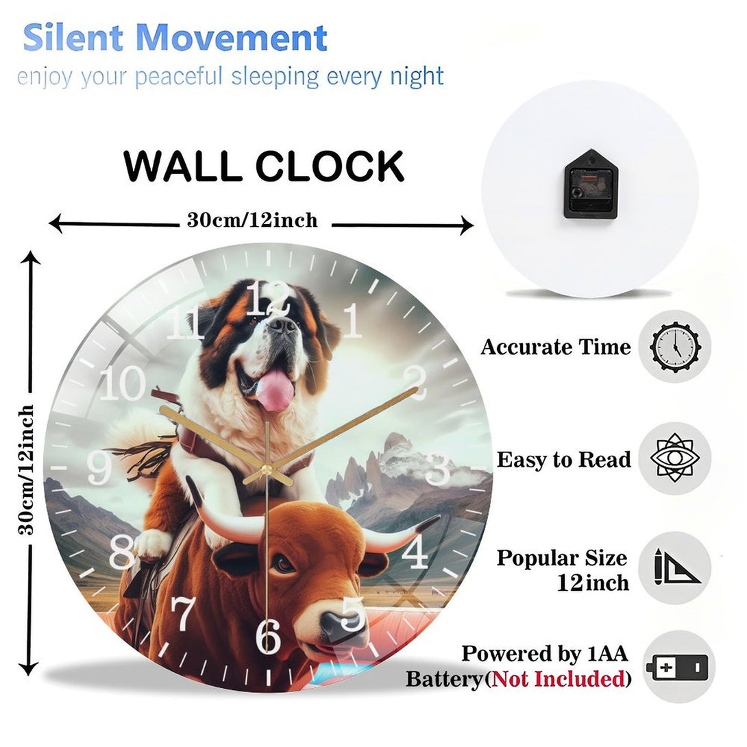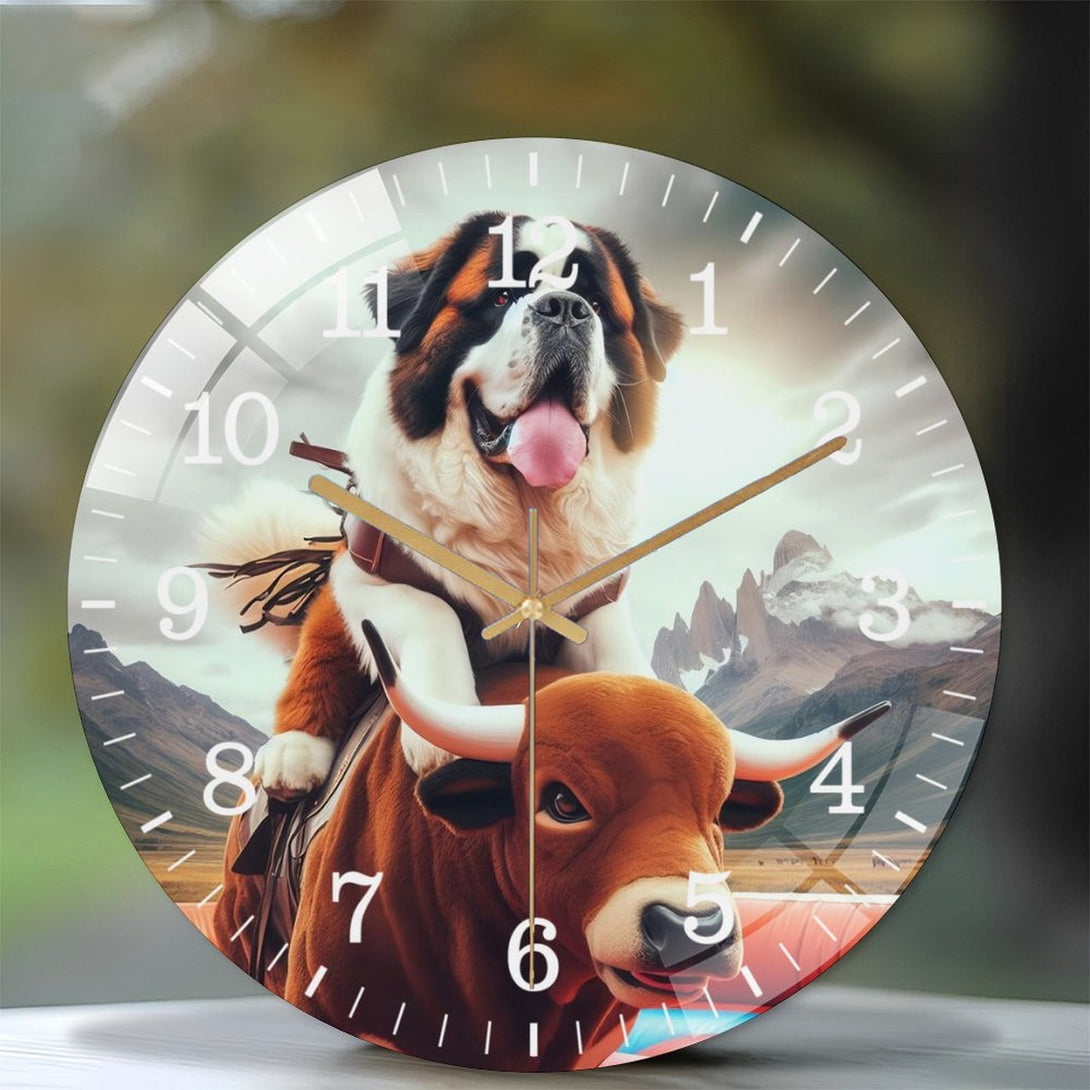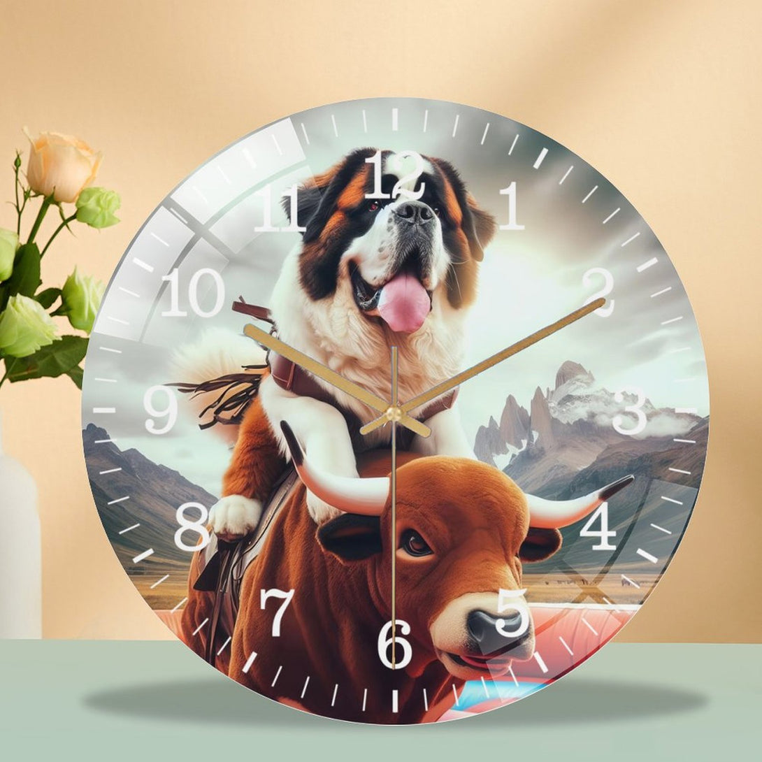 Funny Saint Bernard Riding A Mechanical Bull Glass Wall Clock ,Silly Mechanical Bull Dog Collection Wall Clock ,Dog Lover Wall Clock for Homes, Bars, Offices, Man Caves, Garages, An,12×12inch(30×30cm)