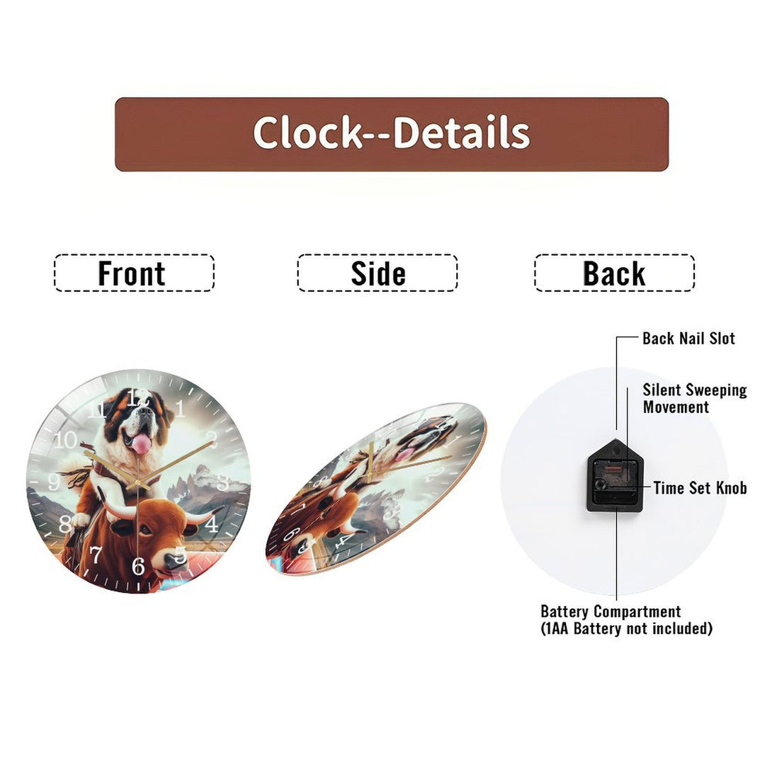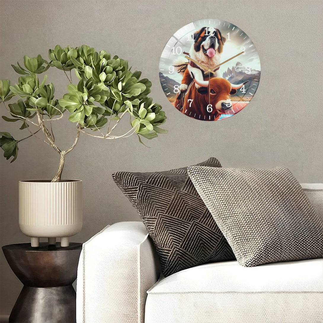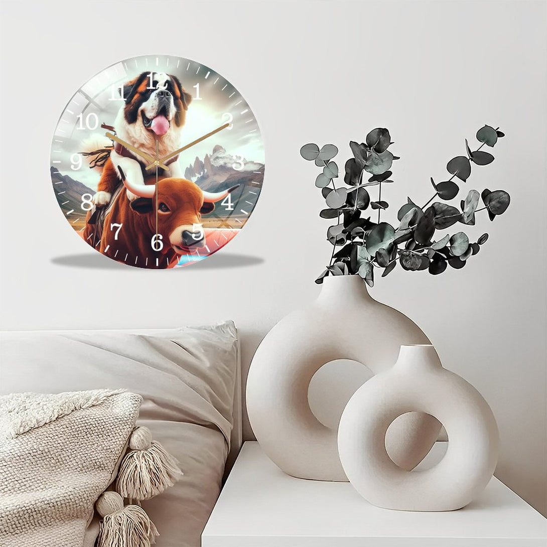Funny Saint Bernard Riding A Mechanical Bull Glass Wall Clock ,Silly Mechanical Bull Dog Collection Wall Clock ,Dog Lover Wall Clock for Homes, Bars, Offices, Man Caves, Garages, An,12×12inch(30×30cm)