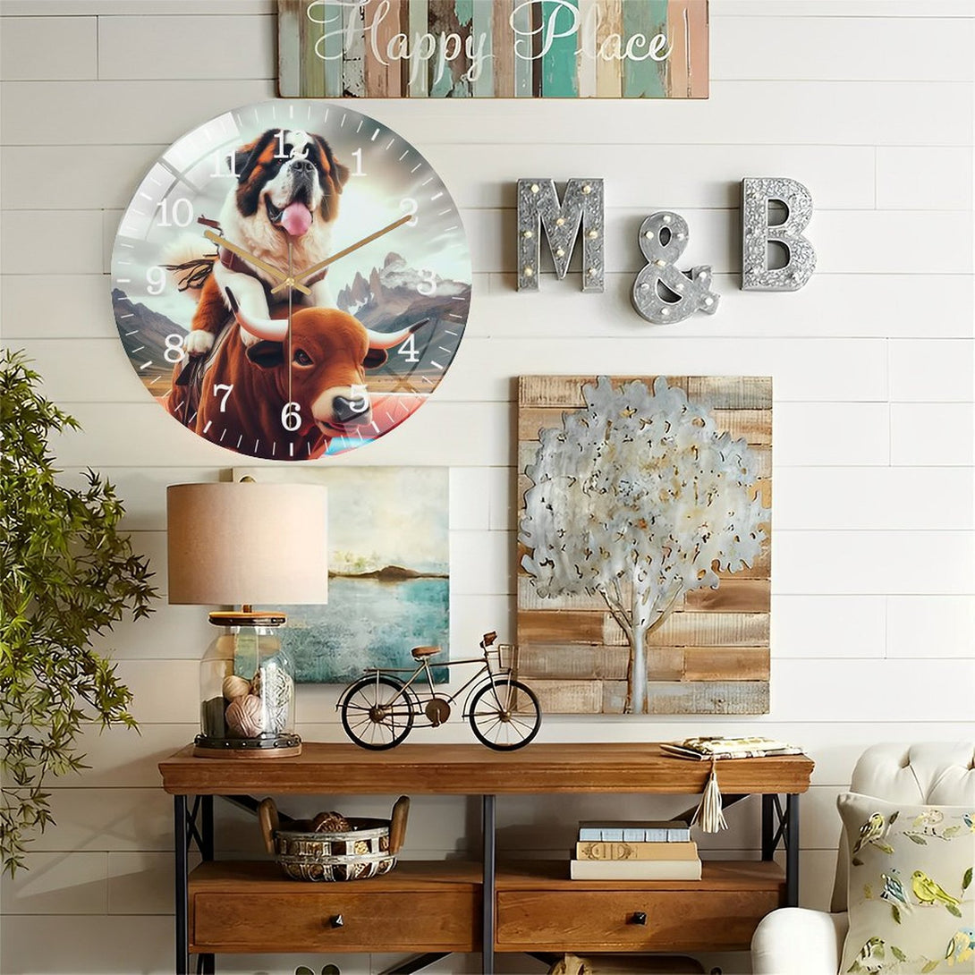 Decor Wall Clocks: Funny Saint Bernard Riding A Mechanical Bull Glass Wall Clock ,Silly Mechanical Bull Dog Collection Wall Clock ,Dog Lover Wall Clock for Homes, Bars, Offices, Man Caves, Garages