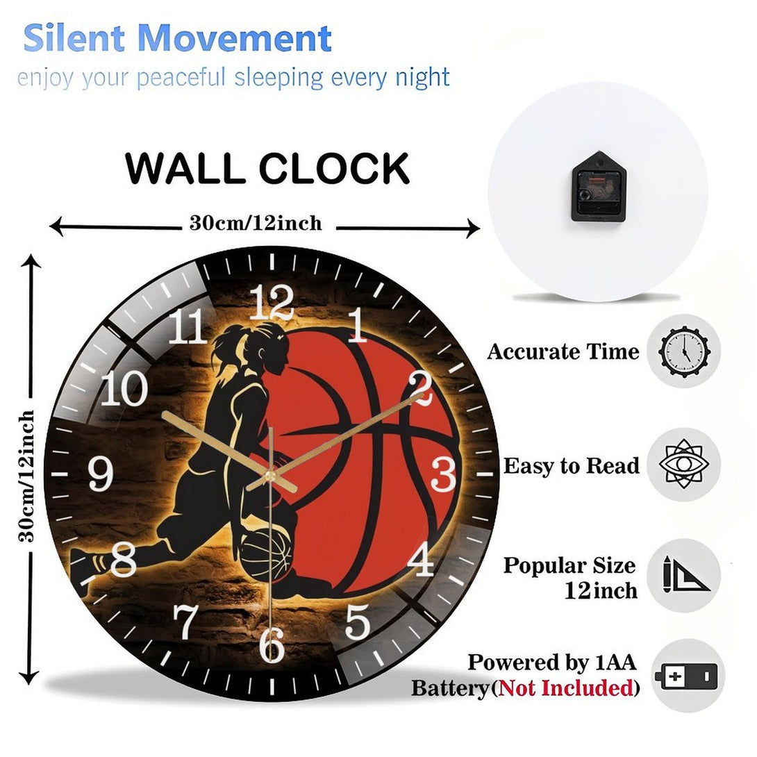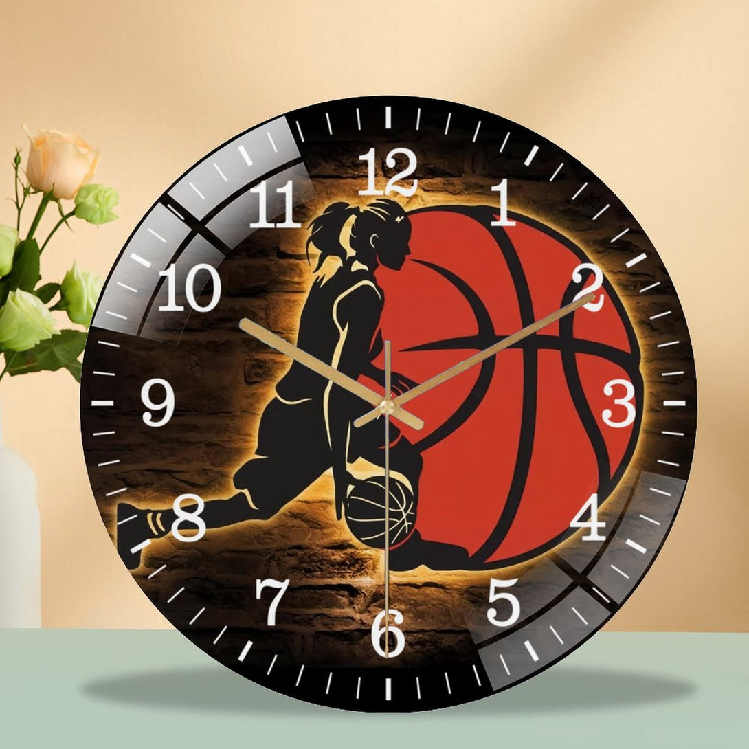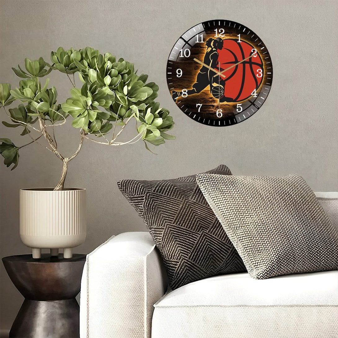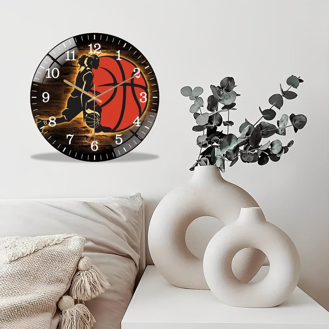 Decor Wall Clocks: Girl Basketball Glass Wall Clock, Female Player Lover Wall Clock, Home Decor Man Cave Sport Room Decoration Mother's Day Birthday Christmas. Style 12×12inch