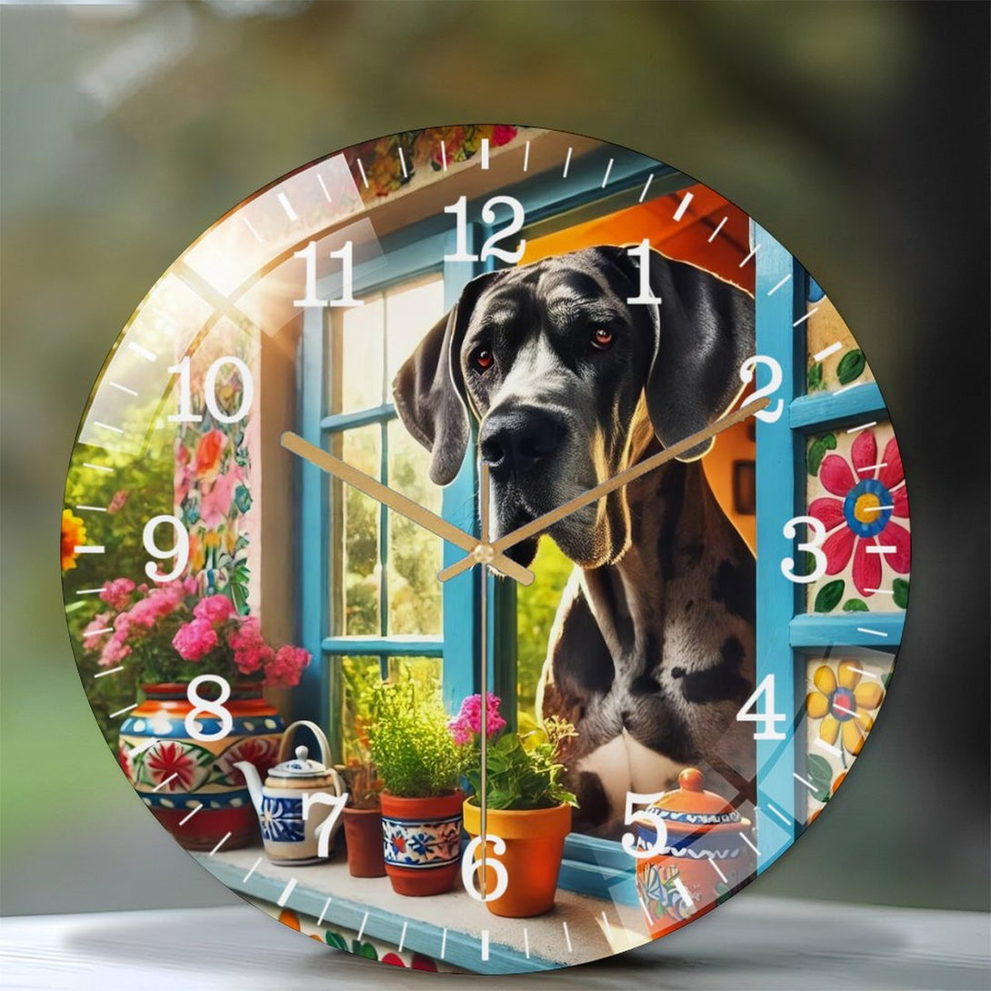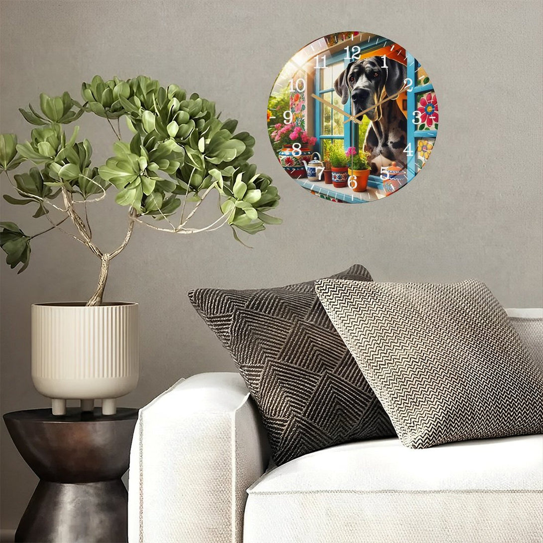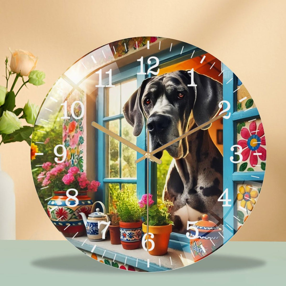 Great Dane in Window Dog Glass Wall Clock ,Dog Lover Wall Clock for Homes, Bars, Offices, Man Caves, Garages, And Living Rooms. .Also Makes A Great Gift.Housewarming Gift,12×12inch(30×30cm)