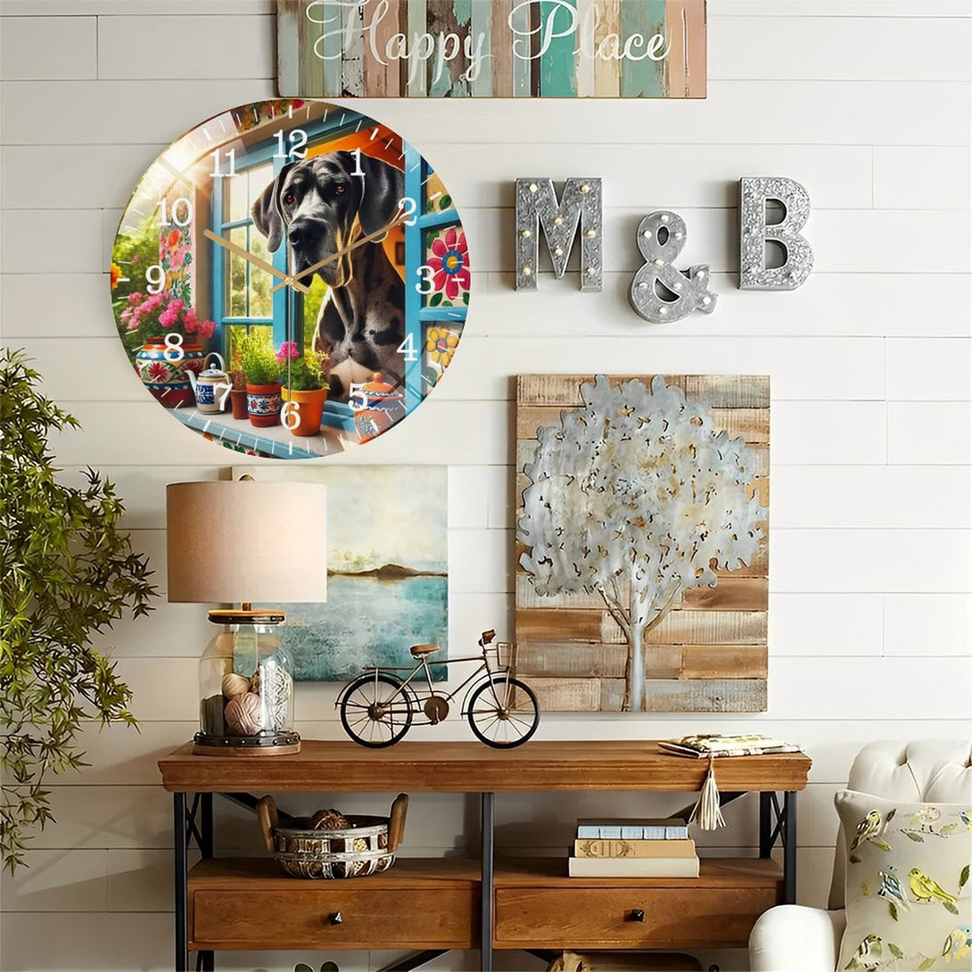 Decor Wall Clocks: Great Dane in Window Dog Glass Wall Clock ,Dog Lover Wall Clock for Homes, Bars, Offices, Man Caves, Garages, And Living Rooms. .Also Makes A Great Gift.Housewarming Gift