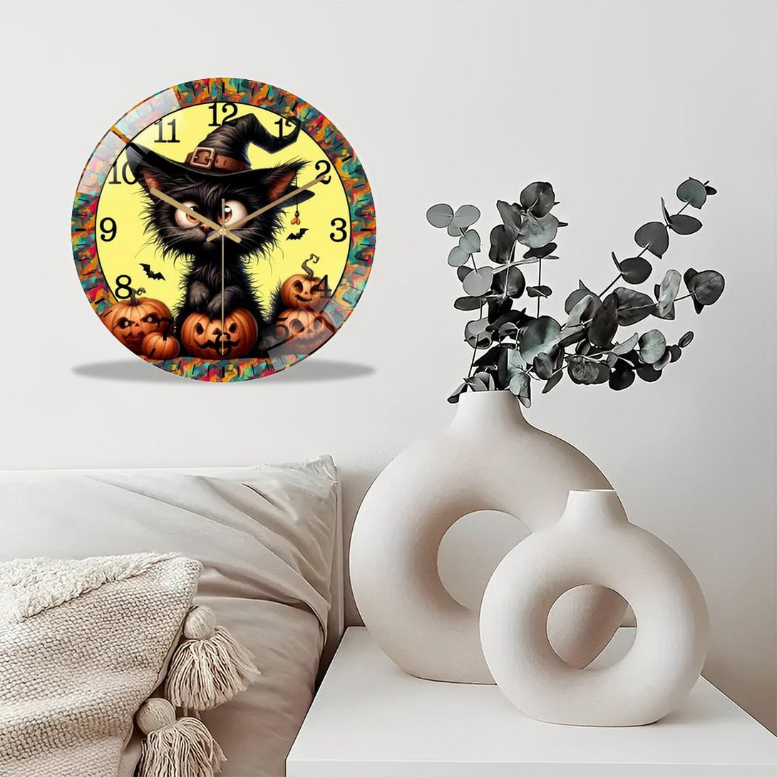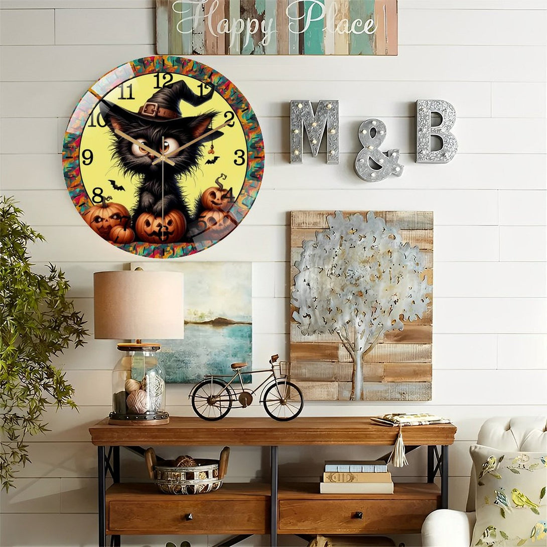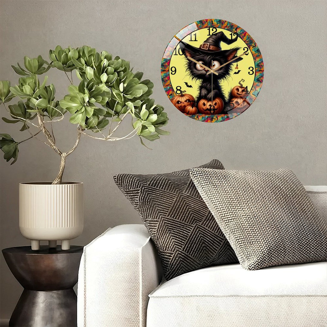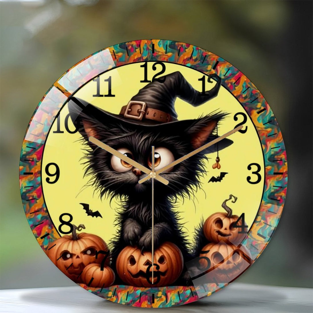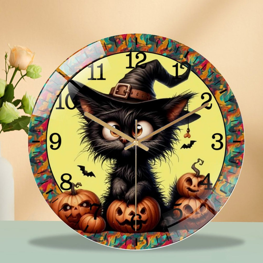 Decor Wall Clocks: Hallo-ween Big Eyes Black Cat Glass Wall Clock ,Kitty Lover Gift Idea for Homes, Bars, Offices, Man Caves, Garages, And Living Rooms. Also Makes A Great Gift.