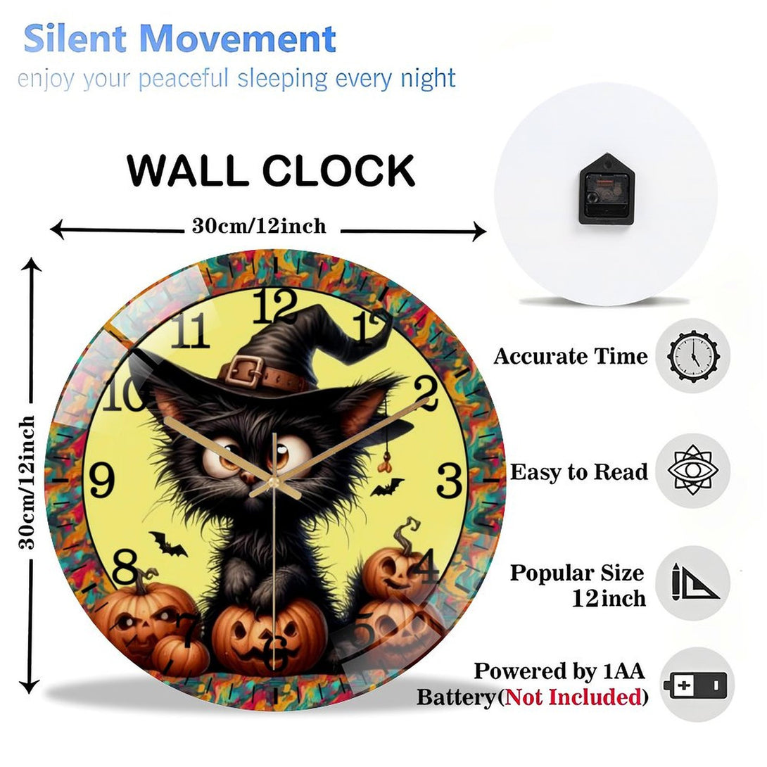 Hallo-ween Big Eyes Black Cat Glass Wall Clock ,Kitty Lover Gift Idea for Homes, Bars, Offices, Man Caves, Garages, And Living Rooms. Also Makes A Great Gift.,12×12inch(30×30cm)