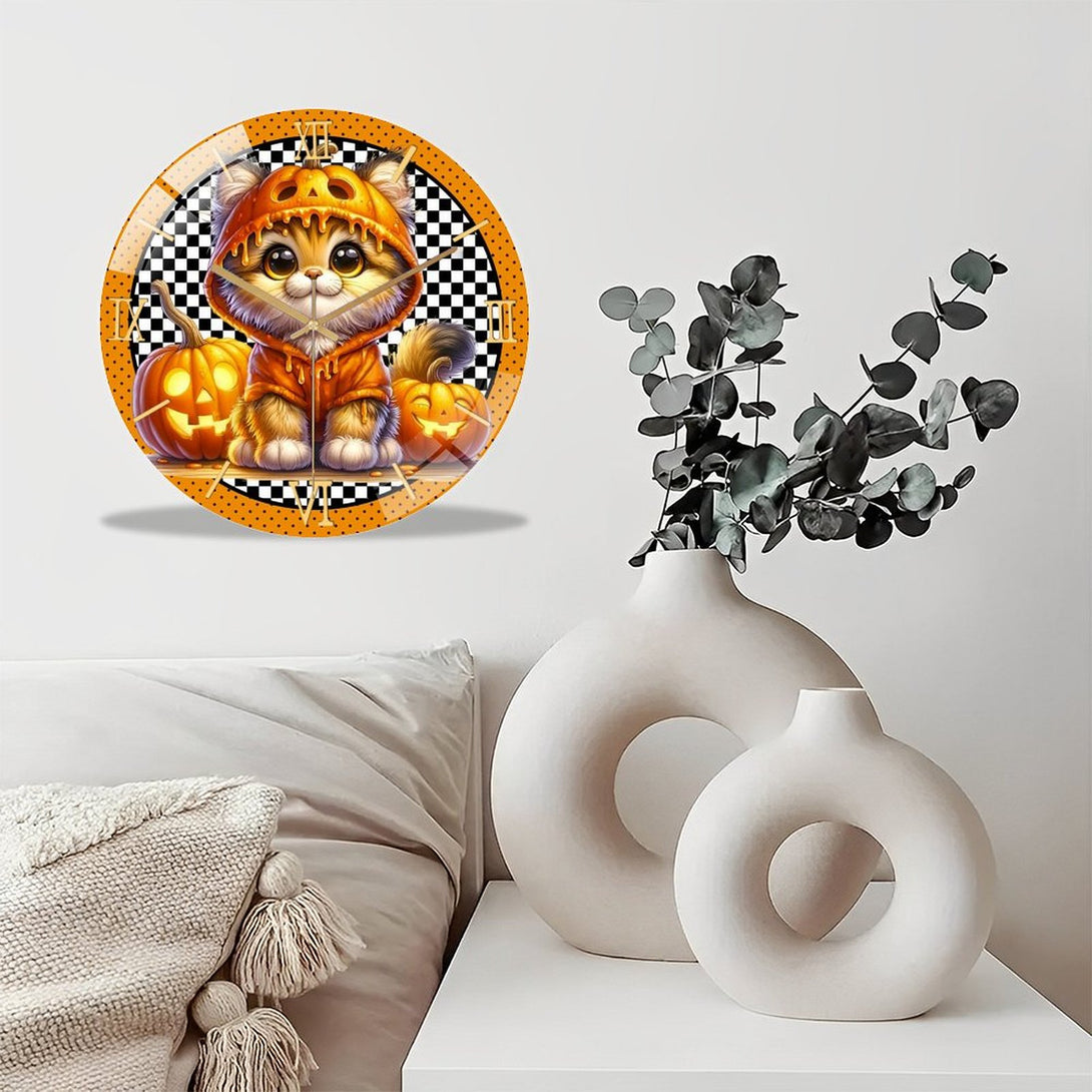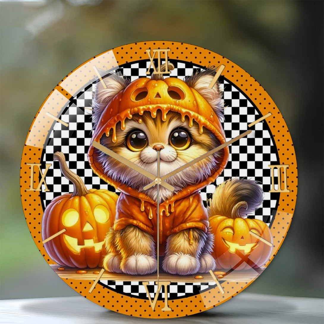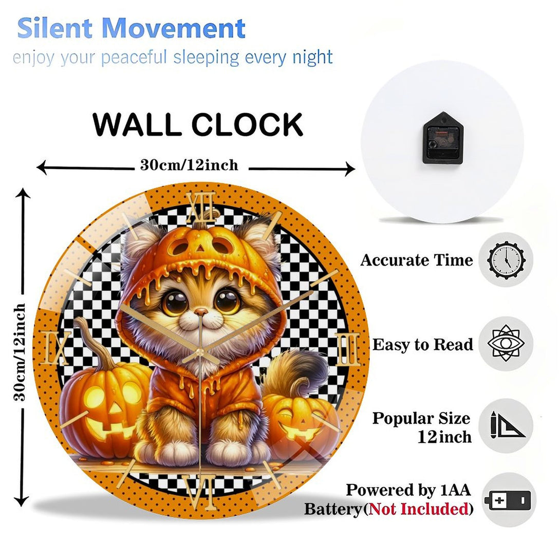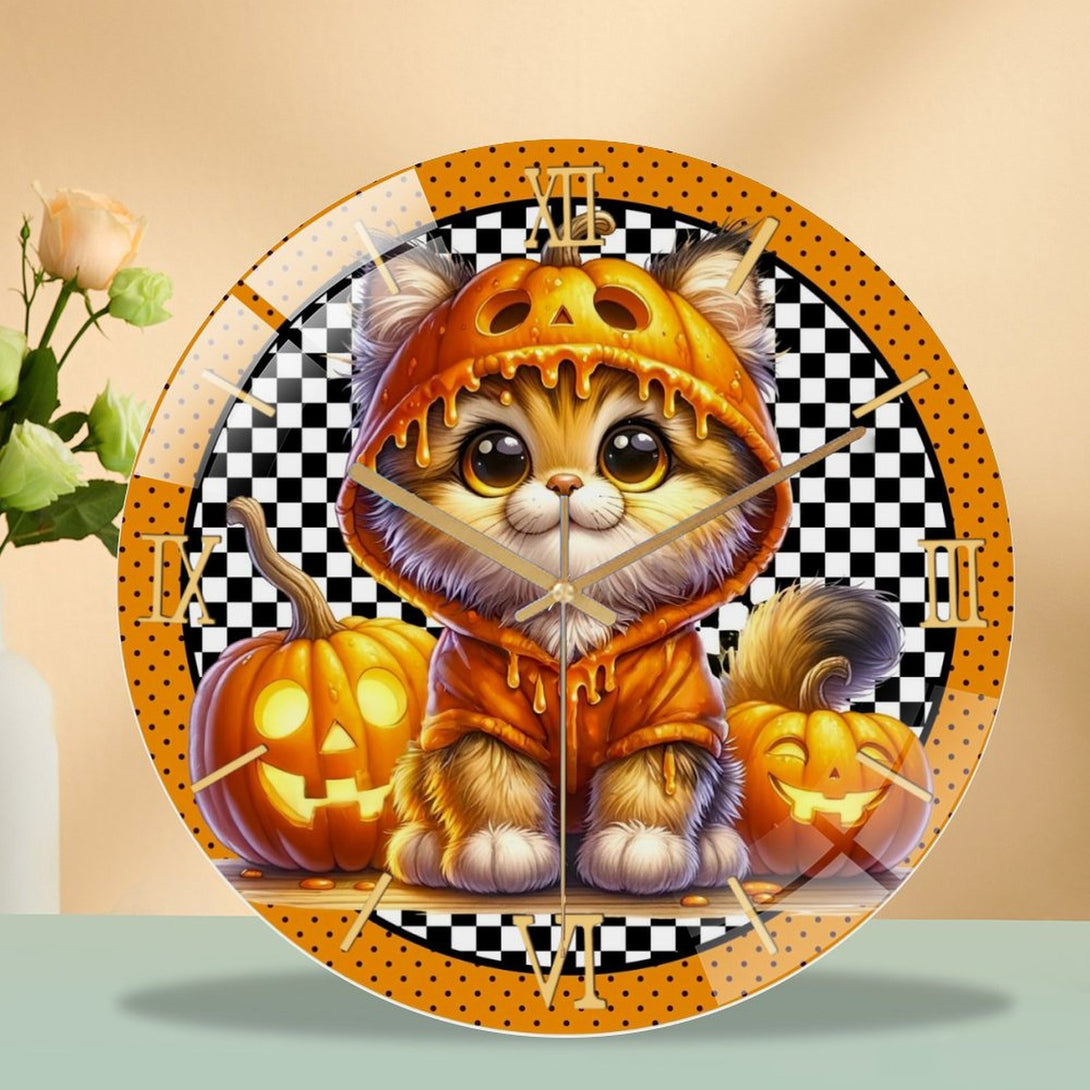 Hallo-ween Kitten Glass Wall Clock,Pumpkin Cat Wall Clock for Homes, Bars, Offices, Man Caves, Garages, And Living Rooms. Also Makes A Great Gift.,12×12inch(30×30cm)