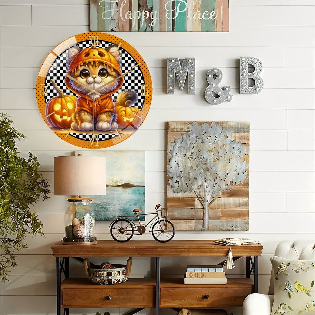 Decor Wall Clocks: Hallo-ween Kitten Glass Wall Clock,Pumpkin Cat Wall Clock for Homes, Bars, Offices, Man Caves, Garages, And Living Rooms. Also Makes A Great Gift. Style 12×12inch(30×30cm)