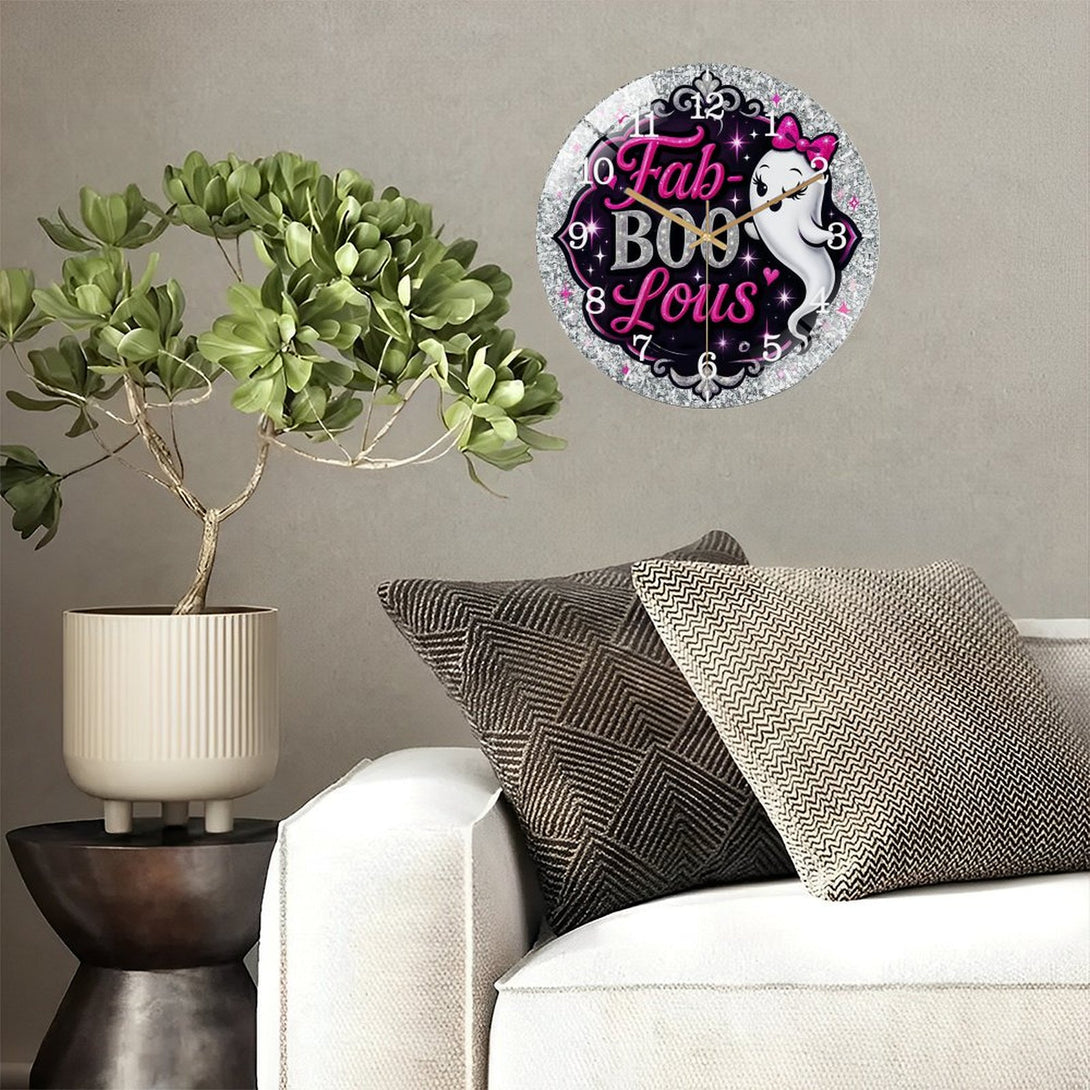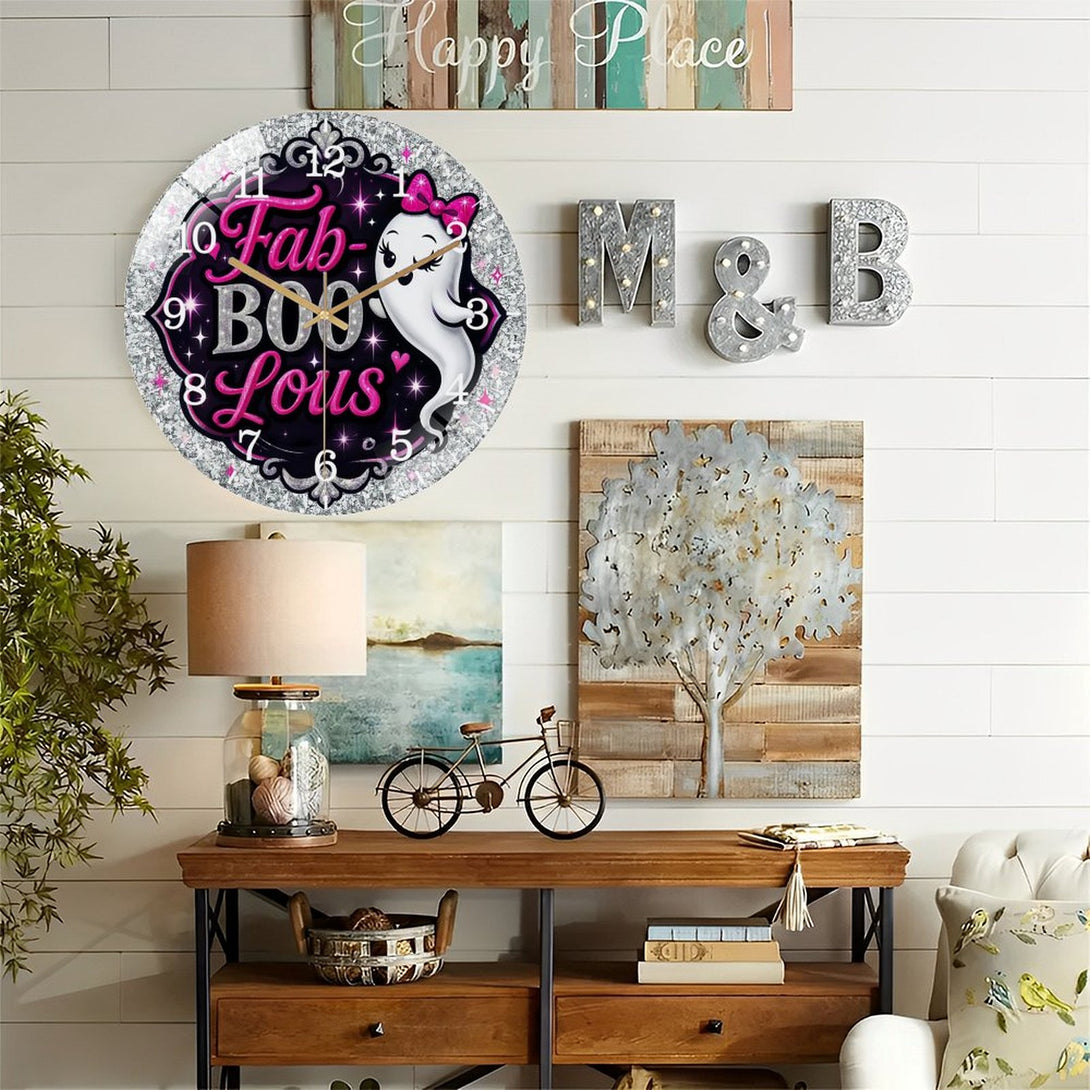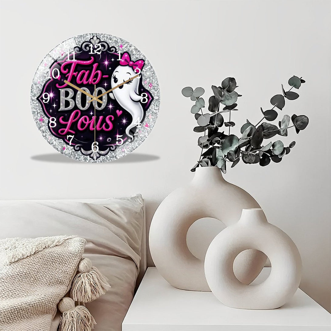 Decor Wall Clocks: Hallo-ween Pink Ghost Wreath Glass Wall Clock,Spooky Hallo Ween Wall Clock from Homes, Bars, Offices, Man Caves, Garages, And Living Rooms. Also Makes A Great Gift.